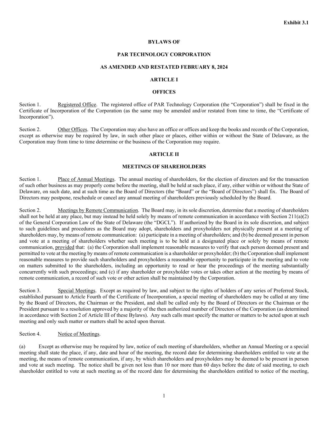 Exhibit 3.1 1 BYLAWS OF PAR TECHNOLOGY CORPORATION AS AMENDED AND RESTATED FEBRUARY 8, 2024 ARTICLE I OFFICES Section 1. Registered Office. The registered office of PAR Technology Corporation (the “Corporation”) shall be fixed in the Certificate of Incorporation of the Corporation (as the same may be amended and/or restated from time to time, the “Certificate of Incorporation”). Section 2. Other Offices. The Corporation may also have an office or offices and keep the books and records of the Corporation, except as otherwise may be required by law, in such other place or places, either within or without the State of Delaware, as the Corporation may from time to time determine or the business of the Corporation may require. ARTICLE II MEETINGS OF SHAREHOLDERS Section 1. Place of Annual Meetings. The annual meeting of shareholders, for the election of directors and for the transaction of such other business as may properly come before the meeting, shall be held at such place, if any, either within or without the State of Delaware, on such date, and at such time as the Board of Directors (the “Board” or the “Board of Directors”) shall fix. The Board of Directors may postpone, reschedule or cancel any annual meeting of shareholders previously scheduled by the Board. Section 2. Meetings by Remote Communication. The Board may, in its sole discretion, determine that a meeting of shareholders shall not be held at any place, but may instead be held solely by means of remote communication in accordance with Section 211(a)(2) of the General Corporation Law of the State of Delaware (the “DGCL”). If authorized by the Board in its sole discretion, and subject to such guidelines and procedures as the Board may adopt, shareholders and proxyholders not physically present at a meeting of shareholders may, by means of remote communication: (a) participate in a meeting of shareholders; and (b) be deemed present in person and vote at a meeting of shareholders whether such meeting is to be held at a designated place or solely by means of remote communication, provided that: (a) the Corporation shall implement reasonable measures to verify that each person deemed present and permitted to vote at the meeting by means of remote communication is a shareholder or proxyholder; (b) the Corporation shall implement reasonable measures to provide such shareholders and proxyholders a reasonable opportunity to participate in the meeting and to vote on matters submitted to the shareholders, including an opportunity to read or hear the proceedings of the meeting substantially concurrently with such proceedings; and (c) if any shareholder or proxyholder votes or takes other action at the meeting by means of remote communication, a record of such vote or other action shall be maintained by the Corporation. Section 3. Special Meetings. Except as required by law, and subject to the rights of holders of any series of Preferred Stock, established pursuant to Article Fourth of the Certificate of Incorporation, a special meeting of shareholders may be called at any time by the Board of Directors, the Chairman or the President, and shall be called only by the Board of Directors or the Chairman or the President pursuant to a resolution approved by a majority of the then authorized number of Directors of the Corporation (as determined in accordance with Section 2 of Article III of these Bylaws). Any such calls must specify the matter or matters to be acted upon at such meeting and only such matter or matters shall be acted upon thereat. Section 4. Notice of Meetings. (a) Except as otherwise may be required by law, notice of each meeting of shareholders, whether an Annual Meeting or a special meeting shall state the place, if any, date and hour of the meeting, the record date for determining shareholders entitled to vote at the meeting, the means of remote communication, if any, by which shareholders and proxyholders may be deemed to be present in person and vote at such meeting. The notice shall be given not less than 10 nor more than 60 days before the date of said meeting, to each shareholder entitled to vote at such meeting as of the record date for determining the shareholders entitled to notice of the meeting,