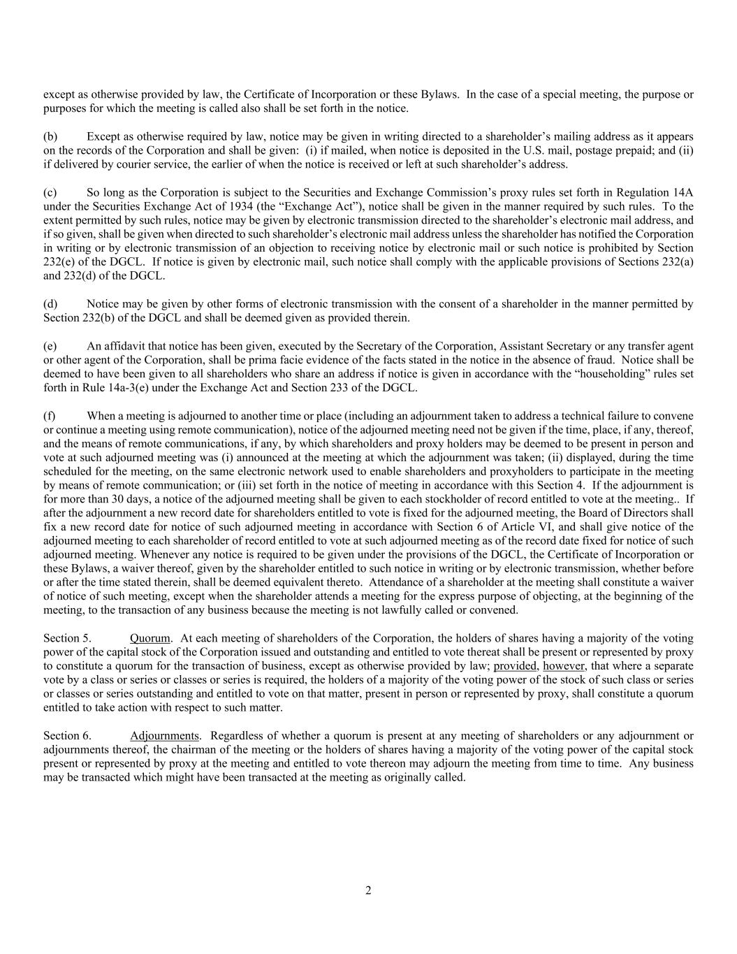 2 except as otherwise provided by law, the Certificate of Incorporation or these Bylaws. In the case of a special meeting, the purpose or purposes for which the meeting is called also shall be set forth in the notice. (b) Except as otherwise required by law, notice may be given in writing directed to a shareholder’s mailing address as it appears on the records of the Corporation and shall be given: (i) if mailed, when notice is deposited in the U.S. mail, postage prepaid; and (ii) if delivered by courier service, the earlier of when the notice is received or left at such shareholder’s address. (c) So long as the Corporation is subject to the Securities and Exchange Commission’s proxy rules set forth in Regulation 14A under the Securities Exchange Act of 1934 (the “Exchange Act”), notice shall be given in the manner required by such rules. To the extent permitted by such rules, notice may be given by electronic transmission directed to the shareholder’s electronic mail address, and if so given, shall be given when directed to such shareholder’s electronic mail address unless the shareholder has notified the Corporation in writing or by electronic transmission of an objection to receiving notice by electronic mail or such notice is prohibited by Section 232(e) of the DGCL. If notice is given by electronic mail, such notice shall comply with the applicable provisions of Sections 232(a) and 232(d) of the DGCL. (d) Notice may be given by other forms of electronic transmission with the consent of a shareholder in the manner permitted by Section 232(b) of the DGCL and shall be deemed given as provided therein. (e) An affidavit that notice has been given, executed by the Secretary of the Corporation, Assistant Secretary or any transfer agent or other agent of the Corporation, shall be prima facie evidence of the facts stated in the notice in the absence of fraud. Notice shall be deemed to have been given to all shareholders who share an address if notice is given in accordance with the “householding” rules set forth in Rule 14a-3(e) under the Exchange Act and Section 233 of the DGCL. (f) When a meeting is adjourned to another time or place (including an adjournment taken to address a technical failure to convene or continue a meeting using remote communication), notice of the adjourned meeting need not be given if the time, place, if any, thereof, and the means of remote communications, if any, by which shareholders and proxy holders may be deemed to be present in person and vote at such adjourned meeting was (i) announced at the meeting at which the adjournment was taken; (ii) displayed, during the time scheduled for the meeting, on the same electronic network used to enable shareholders and proxyholders to participate in the meeting by means of remote communication; or (iii) set forth in the notice of meeting in accordance with this Section 4. If the adjournment is for more than 30 days, a notice of the adjourned meeting shall be given to each stockholder of record entitled to vote at the meeting.. If after the adjournment a new record date for shareholders entitled to vote is fixed for the adjourned meeting, the Board of Directors shall fix a new record date for notice of such adjourned meeting in accordance with Section 6 of Article VI, and shall give notice of the adjourned meeting to each shareholder of record entitled to vote at such adjourned meeting as of the record date fixed for notice of such adjourned meeting. Whenever any notice is required to be given under the provisions of the DGCL, the Certificate of Incorporation or these Bylaws, a waiver thereof, given by the shareholder entitled to such notice in writing or by electronic transmission, whether before or after the time stated therein, shall be deemed equivalent thereto. Attendance of a shareholder at the meeting shall constitute a waiver of notice of such meeting, except when the shareholder attends a meeting for the express purpose of objecting, at the beginning of the meeting, to the transaction of any business because the meeting is not lawfully called or convened. Section 5. Quorum. At each meeting of shareholders of the Corporation, the holders of shares having a majority of the voting power of the capital stock of the Corporation issued and outstanding and entitled to vote thereat shall be present or represented by proxy to constitute a quorum for the transaction of business, except as otherwise provided by law; provided, however, that where a separate vote by a class or series or classes or series is required, the holders of a majority of the voting power of the stock of such class or series or classes or series outstanding and entitled to vote on that matter, present in person or represented by proxy, shall constitute a quorum entitled to take action with respect to such matter. Section 6. Adjournments. Regardless of whether a quorum is present at any meeting of shareholders or any adjournment or adjournments thereof, the chairman of the meeting or the holders of shares having a majority of the voting power of the capital stock present or represented by proxy at the meeting and entitled to vote thereon may adjourn the meeting from time to time. Any business may be transacted which might have been transacted at the meeting as originally called.