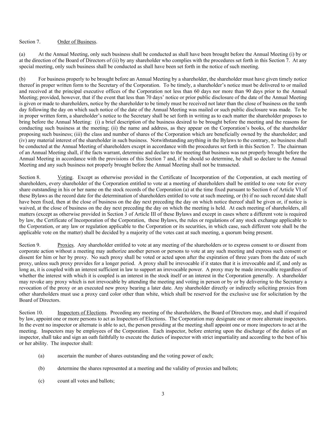 3 Section 7. Order of Business. (a) At the Annual Meeting, only such business shall be conducted as shall have been brought before the Annual Meeting (i) by or at the direction of the Board of Directors of (ii) by any shareholder who complies with the procedures set forth in this Section 7. At any special meeting, only such business shall be conducted as shall have been set forth in the notice of such meeting. (b) For business properly to be brought before an Annual Meeting by a shareholder, the shareholder must have given timely notice thereof in proper written form to the Secretary of the Corporation. To be timely, a shareholder’s notice must be delivered to or mailed and received at the principal executive offices of the Corporation not less than 60 days nor more than 90 days prior to the Annual Meeting; provided, however, that if the event that less than 70 days’ notice or prior public disclosure of the date of the Annual Meeting is given or made to shareholders, notice by the shareholder to be timely must be received not later than the close of business on the tenth day following the day on which such notice of the date of the Annual Meeting was mailed or such public disclosure was made. To be in proper written form, a shareholder’s notice to the Secretary shall be set forth in writing as to each matter the shareholder proposes to bring before the Annual Meeting: (i) a brief description of the business desired to be brought before the meeting and the reasons for conducting such business at the meeting; (ii) the name and address, as they appear on the Corporation’s books, of the shareholder proposing such business; (iii) the class and number of shares of the Corporation which are beneficially owned by the shareholder; and (iv) any material interest of the shareholder in such business. Notwithstanding anything in the Bylaws to the contrary, no business shall be conducted at the Annual Meeting of shareholders except in accordance with the procedures set forth in this Section 7. The chairman of an Annual Meeting shall, if the facts warrant, determine and declare to the meeting that business was not properly brought before the Annual Meeting in accordance with the provisions of this Section 7 and, if he should so determine, he shall so declare to the Annual Meeting and any such business not properly brought before the Annual Meeting shall not be transacted. Section 8. Voting. Except as otherwise provided in the Certificate of Incorporation of the Corporation, at each meeting of shareholders, every shareholder of the Corporation entitled to vote at a meeting of shareholders shall be entitled to one vote for every share outstanding in his or her name on the stock records of the Corporation (a) at the time fixed pursuant to Section 6 of Article VI of these Bylaws as the record date for the determination of shareholders entitled to vote at such meeting, or (b) if no such record date shall have been fixed, then at the close of business on the day next preceding the day on which notice thereof shall be given or, if notice is waived, at the close of business on the day next preceding the day on which the meeting is held. At each meeting of shareholders, all matters (except as otherwise provided in Section 3 of Article III of these Bylaws and except in cases where a different vote is required by law, the Certificate of Incorporation of the Corporation, these Bylaws, the rules or regulations of any stock exchange applicable to the Corporation, or any law or regulation applicable to the Corporation or its securities, in which case, such different vote shall be the applicable vote on the matter) shall be decided by a majority of the votes cast at such meeting, a quorum being present. Section 9. Proxies. Any shareholder entitled to vote at any meeting of the shareholders or to express consent to or dissent from corporate action without a meeting may authorize another person or persons to vote at any such meeting and express such consent or dissent for him or her by proxy. No such proxy shall be voted or acted upon after the expiration of three years from the date of such proxy, unless such proxy provides for a longer period. A proxy shall be irrevocable if it states that it is irrevocable and if, and only as long as, it is coupled with an interest sufficient in law to support an irrevocable power. A proxy may be made irrevocable regardless of whether the interest with which it is coupled is an interest in the stock itself or an interest in the Corporation generally. A shareholder may revoke any proxy which is not irrevocable by attending the meeting and voting in person or by or by delivering to the Secretary a revocation of the proxy or an executed new proxy bearing a later date. Any shareholder directly or indirectly soliciting proxies from other shareholders must use a proxy card color other than white, which shall be reserved for the exclusive use for solicitation by the Board of Directors. Section 10. Inspectors of Elections. Preceding any meeting of the shareholders, the Board of Directors may, and shall if required by law, appoint one or more persons to act as Inspectors of Elections. The Corporation may designate one or more alternate inspectors. In the event no inspector or alternate is able to act, the person presiding at the meeting shall appoint one or more inspectors to act at the meeting. Inspectors may be employees of the Corporation. Each inspector, before entering upon the discharge of the duties of an inspector, shall take and sign an oath faithfully to execute the duties of inspector with strict impartiality and according to the best of his or her ability. The inspector shall: (a) ascertain the number of shares outstanding and the voting power of each; (b) determine the shares represented at a meeting and the validity of proxies and ballots; (c) count all votes and ballots;