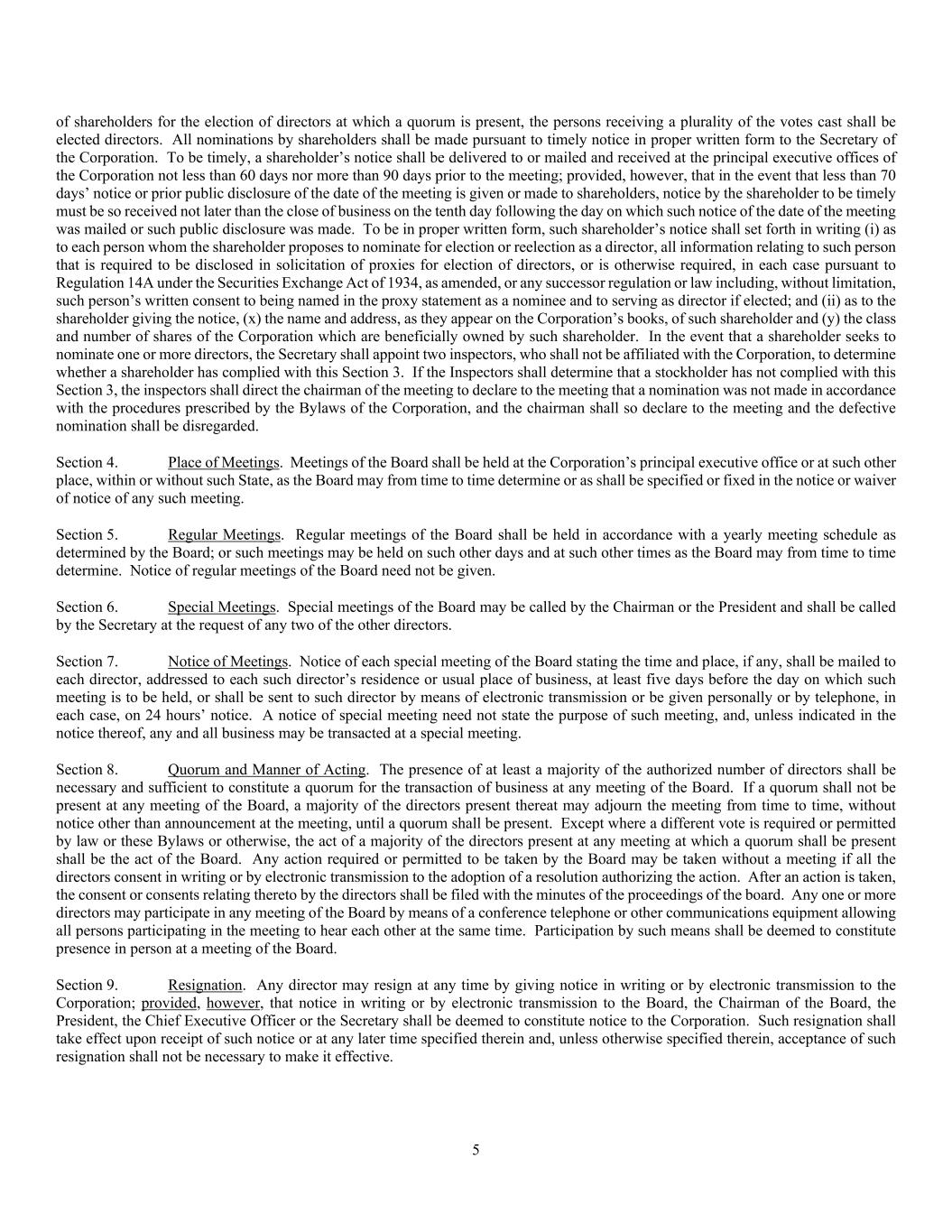 5 of shareholders for the election of directors at which a quorum is present, the persons receiving a plurality of the votes cast shall be elected directors. All nominations by shareholders shall be made pursuant to timely notice in proper written form to the Secretary of the Corporation. To be timely, a shareholder’s notice shall be delivered to or mailed and received at the principal executive offices of the Corporation not less than 60 days nor more than 90 days prior to the meeting; provided, however, that in the event that less than 70 days’ notice or prior public disclosure of the date of the meeting is given or made to shareholders, notice by the shareholder to be timely must be so received not later than the close of business on the tenth day following the day on which such notice of the date of the meeting was mailed or such public disclosure was made. To be in proper written form, such shareholder’s notice shall set forth in writing (i) as to each person whom the shareholder proposes to nominate for election or reelection as a director, all information relating to such person that is required to be disclosed in solicitation of proxies for election of directors, or is otherwise required, in each case pursuant to Regulation 14A under the Securities Exchange Act of 1934, as amended, or any successor regulation or law including, without limitation, such person’s written consent to being named in the proxy statement as a nominee and to serving as director if elected; and (ii) as to the shareholder giving the notice, (x) the name and address, as they appear on the Corporation’s books, of such shareholder and (y) the class and number of shares of the Corporation which are beneficially owned by such shareholder. In the event that a shareholder seeks to nominate one or more directors, the Secretary shall appoint two inspectors, who shall not be affiliated with the Corporation, to determine whether a shareholder has complied with this Section 3. If the Inspectors shall determine that a stockholder has not complied with this Section 3, the inspectors shall direct the chairman of the meeting to declare to the meeting that a nomination was not made in accordance with the procedures prescribed by the Bylaws of the Corporation, and the chairman shall so declare to the meeting and the defective nomination shall be disregarded. Section 4. Place of Meetings. Meetings of the Board shall be held at the Corporation’s principal executive office or at such other place, within or without such State, as the Board may from time to time determine or as shall be specified or fixed in the notice or waiver of notice of any such meeting. Section 5. Regular Meetings. Regular meetings of the Board shall be held in accordance with a yearly meeting schedule as determined by the Board; or such meetings may be held on such other days and at such other times as the Board may from time to time determine. Notice of regular meetings of the Board need not be given. Section 6. Special Meetings. Special meetings of the Board may be called by the Chairman or the President and shall be called by the Secretary at the request of any two of the other directors. Section 7. Notice of Meetings. Notice of each special meeting of the Board stating the time and place, if any, shall be mailed to each director, addressed to each such director’s residence or usual place of business, at least five days before the day on which such meeting is to be held, or shall be sent to such director by means of electronic transmission or be given personally or by telephone, in each case, on 24 hours’ notice. A notice of special meeting need not state the purpose of such meeting, and, unless indicated in the notice thereof, any and all business may be transacted at a special meeting. Section 8. Quorum and Manner of Acting. The presence of at least a majority of the authorized number of directors shall be necessary and sufficient to constitute a quorum for the transaction of business at any meeting of the Board. If a quorum shall not be present at any meeting of the Board, a majority of the directors present thereat may adjourn the meeting from time to time, without notice other than announcement at the meeting, until a quorum shall be present. Except where a different vote is required or permitted by law or these Bylaws or otherwise, the act of a majority of the directors present at any meeting at which a quorum shall be present shall be the act of the Board. Any action required or permitted to be taken by the Board may be taken without a meeting if all the directors consent in writing or by electronic transmission to the adoption of a resolution authorizing the action. After an action is taken, the consent or consents relating thereto by the directors shall be filed with the minutes of the proceedings of the board. Any one or more directors may participate in any meeting of the Board by means of a conference telephone or other communications equipment allowing all persons participating in the meeting to hear each other at the same time. Participation by such means shall be deemed to constitute presence in person at a meeting of the Board. Section 9. Resignation. Any director may resign at any time by giving notice in writing or by electronic transmission to the Corporation; provided, however, that notice in writing or by electronic transmission to the Board, the Chairman of the Board, the President, the Chief Executive Officer or the Secretary shall be deemed to constitute notice to the Corporation. Such resignation shall take effect upon receipt of such notice or at any later time specified therein and, unless otherwise specified therein, acceptance of such resignation shall not be necessary to make it effective.