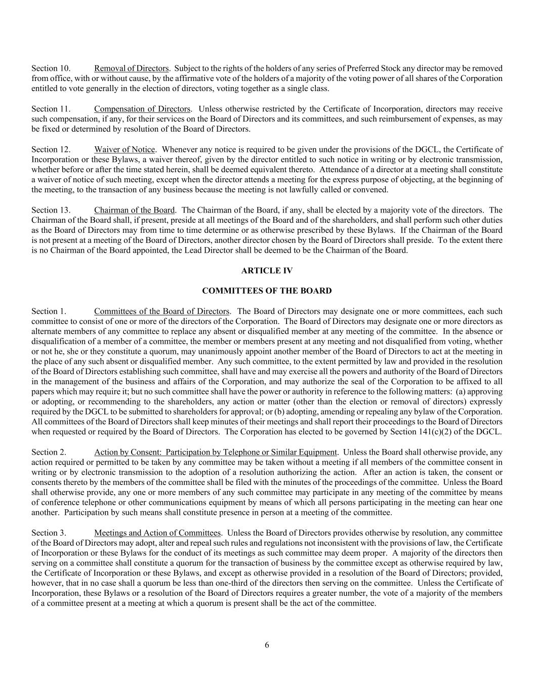 6 Section 10. Removal of Directors. Subject to the rights of the holders of any series of Preferred Stock any director may be removed from office, with or without cause, by the affirmative vote of the holders of a majority of the voting power of all shares of the Corporation entitled to vote generally in the election of directors, voting together as a single class. Section 11. Compensation of Directors. Unless otherwise restricted by the Certificate of Incorporation, directors may receive such compensation, if any, for their services on the Board of Directors and its committees, and such reimbursement of expenses, as may be fixed or determined by resolution of the Board of Directors. Section 12. Waiver of Notice. Whenever any notice is required to be given under the provisions of the DGCL, the Certificate of Incorporation or these Bylaws, a waiver thereof, given by the director entitled to such notice in writing or by electronic transmission, whether before or after the time stated herein, shall be deemed equivalent thereto. Attendance of a director at a meeting shall constitute a waiver of notice of such meeting, except when the director attends a meeting for the express purpose of objecting, at the beginning of the meeting, to the transaction of any business because the meeting is not lawfully called or convened. Section 13. Chairman of the Board. The Chairman of the Board, if any, shall be elected by a majority vote of the directors. The Chairman of the Board shall, if present, preside at all meetings of the Board and of the shareholders, and shall perform such other duties as the Board of Directors may from time to time determine or as otherwise prescribed by these Bylaws. If the Chairman of the Board is not present at a meeting of the Board of Directors, another director chosen by the Board of Directors shall preside. To the extent there is no Chairman of the Board appointed, the Lead Director shall be deemed to be the Chairman of the Board. ARTICLE IV COMMITTEES OF THE BOARD Section 1. Committees of the Board of Directors. The Board of Directors may designate one or more committees, each such committee to consist of one or more of the directors of the Corporation. The Board of Directors may designate one or more directors as alternate members of any committee to replace any absent or disqualified member at any meeting of the committee. In the absence or disqualification of a member of a committee, the member or members present at any meeting and not disqualified from voting, whether or not he, she or they constitute a quorum, may unanimously appoint another member of the Board of Directors to act at the meeting in the place of any such absent or disqualified member. Any such committee, to the extent permitted by law and provided in the resolution of the Board of Directors establishing such committee, shall have and may exercise all the powers and authority of the Board of Directors in the management of the business and affairs of the Corporation, and may authorize the seal of the Corporation to be affixed to all papers which may require it; but no such committee shall have the power or authority in reference to the following matters: (a) approving or adopting, or recommending to the shareholders, any action or matter (other than the election or removal of directors) expressly required by the DGCL to be submitted to shareholders for approval; or (b) adopting, amending or repealing any bylaw of the Corporation. All committees of the Board of Directors shall keep minutes of their meetings and shall report their proceedings to the Board of Directors when requested or required by the Board of Directors. The Corporation has elected to be governed by Section 141(c)(2) of the DGCL. Section 2. Action by Consent: Participation by Telephone or Similar Equipment. Unless the Board shall otherwise provide, any action required or permitted to be taken by any committee may be taken without a meeting if all members of the committee consent in writing or by electronic transmission to the adoption of a resolution authorizing the action. After an action is taken, the consent or consents thereto by the members of the committee shall be filed with the minutes of the proceedings of the committee. Unless the Board shall otherwise provide, any one or more members of any such committee may participate in any meeting of the committee by means of conference telephone or other communications equipment by means of which all persons participating in the meeting can hear one another. Participation by such means shall constitute presence in person at a meeting of the committee. Section 3. Meetings and Action of Committees. Unless the Board of Directors provides otherwise by resolution, any committee of the Board of Directors may adopt, alter and repeal such rules and regulations not inconsistent with the provisions of law, the Certificate of Incorporation or these Bylaws for the conduct of its meetings as such committee may deem proper. A majority of the directors then serving on a committee shall constitute a quorum for the transaction of business by the committee except as otherwise required by law, the Certificate of Incorporation or these Bylaws, and except as otherwise provided in a resolution of the Board of Directors; provided, however, that in no case shall a quorum be less than one-third of the directors then serving on the committee. Unless the Certificate of Incorporation, these Bylaws or a resolution of the Board of Directors requires a greater number, the vote of a majority of the members of a committee present at a meeting at which a quorum is present shall be the act of the committee.