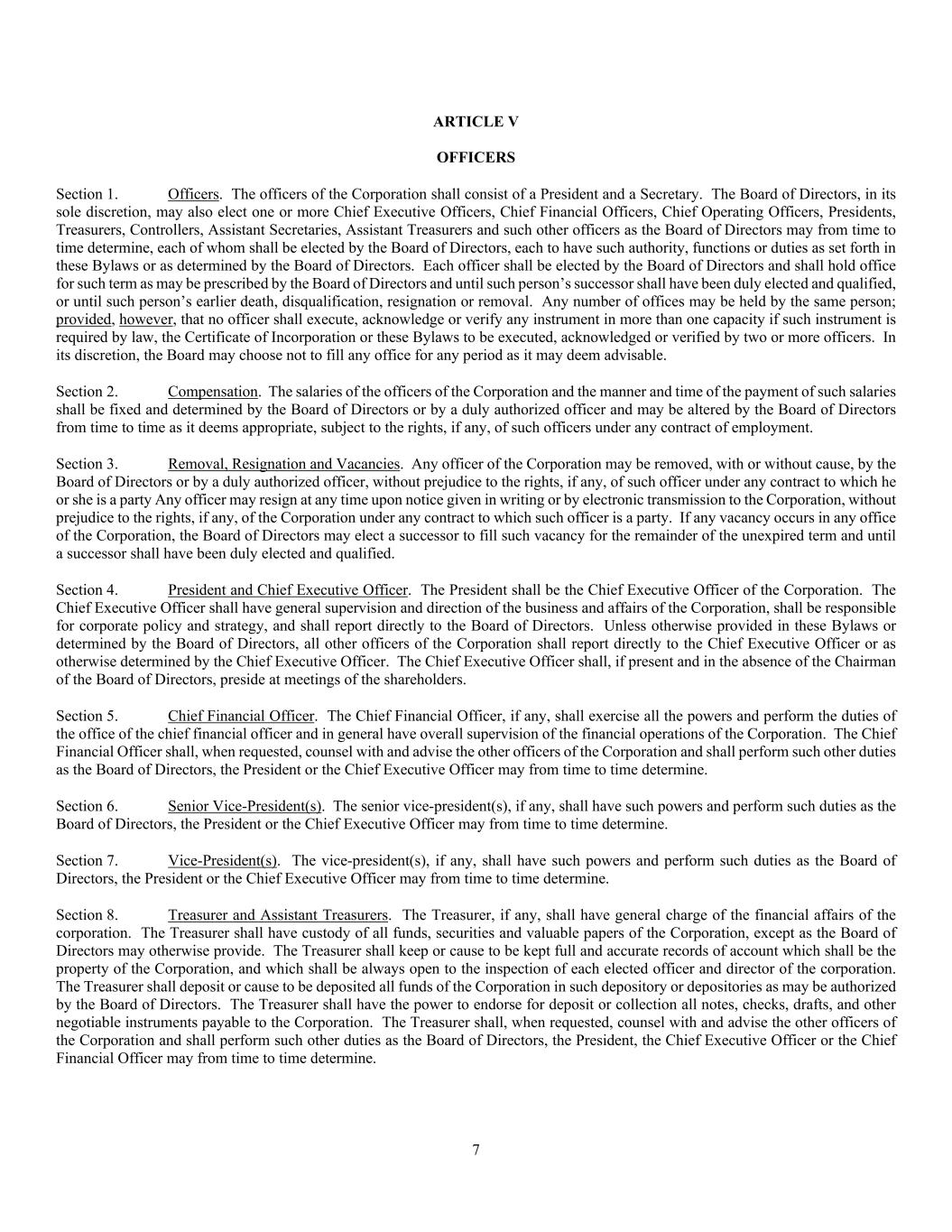 7 ARTICLE V OFFICERS Section 1. Officers. The officers of the Corporation shall consist of a President and a Secretary. The Board of Directors, in its sole discretion, may also elect one or more Chief Executive Officers, Chief Financial Officers, Chief Operating Officers, Presidents, Treasurers, Controllers, Assistant Secretaries, Assistant Treasurers and such other officers as the Board of Directors may from time to time determine, each of whom shall be elected by the Board of Directors, each to have such authority, functions or duties as set forth in these Bylaws or as determined by the Board of Directors. Each officer shall be elected by the Board of Directors and shall hold office for such term as may be prescribed by the Board of Directors and until such person’s successor shall have been duly elected and qualified, or until such person’s earlier death, disqualification, resignation or removal. Any number of offices may be held by the same person; provided, however, that no officer shall execute, acknowledge or verify any instrument in more than one capacity if such instrument is required by law, the Certificate of Incorporation or these Bylaws to be executed, acknowledged or verified by two or more officers. In its discretion, the Board may choose not to fill any office for any period as it may deem advisable. Section 2. Compensation. The salaries of the officers of the Corporation and the manner and time of the payment of such salaries shall be fixed and determined by the Board of Directors or by a duly authorized officer and may be altered by the Board of Directors from time to time as it deems appropriate, subject to the rights, if any, of such officers under any contract of employment. Section 3. Removal, Resignation and Vacancies. Any officer of the Corporation may be removed, with or without cause, by the Board of Directors or by a duly authorized officer, without prejudice to the rights, if any, of such officer under any contract to which he or she is a party Any officer may resign at any time upon notice given in writing or by electronic transmission to the Corporation, without prejudice to the rights, if any, of the Corporation under any contract to which such officer is a party. If any vacancy occurs in any office of the Corporation, the Board of Directors may elect a successor to fill such vacancy for the remainder of the unexpired term and until a successor shall have been duly elected and qualified. Section 4. President and Chief Executive Officer. The President shall be the Chief Executive Officer of the Corporation. The Chief Executive Officer shall have general supervision and direction of the business and affairs of the Corporation, shall be responsible for corporate policy and strategy, and shall report directly to the Board of Directors. Unless otherwise provided in these Bylaws or determined by the Board of Directors, all other officers of the Corporation shall report directly to the Chief Executive Officer or as otherwise determined by the Chief Executive Officer. The Chief Executive Officer shall, if present and in the absence of the Chairman of the Board of Directors, preside at meetings of the shareholders. Section 5. Chief Financial Officer. The Chief Financial Officer, if any, shall exercise all the powers and perform the duties of the office of the chief financial officer and in general have overall supervision of the financial operations of the Corporation. The Chief Financial Officer shall, when requested, counsel with and advise the other officers of the Corporation and shall perform such other duties as the Board of Directors, the President or the Chief Executive Officer may from time to time determine. Section 6. Senior Vice-President(s). The senior vice-president(s), if any, shall have such powers and perform such duties as the Board of Directors, the President or the Chief Executive Officer may from time to time determine. Section 7. Vice-President(s). The vice-president(s), if any, shall have such powers and perform such duties as the Board of Directors, the President or the Chief Executive Officer may from time to time determine. Section 8. Treasurer and Assistant Treasurers. The Treasurer, if any, shall have general charge of the financial affairs of the corporation. The Treasurer shall have custody of all funds, securities and valuable papers of the Corporation, except as the Board of Directors may otherwise provide. The Treasurer shall keep or cause to be kept full and accurate records of account which shall be the property of the Corporation, and which shall be always open to the inspection of each elected officer and director of the corporation. The Treasurer shall deposit or cause to be deposited all funds of the Corporation in such depository or depositories as may be authorized by the Board of Directors. The Treasurer shall have the power to endorse for deposit or collection all notes, checks, drafts, and other negotiable instruments payable to the Corporation. The Treasurer shall, when requested, counsel with and advise the other officers of the Corporation and shall perform such other duties as the Board of Directors, the President, the Chief Executive Officer or the Chief Financial Officer may from time to time determine.