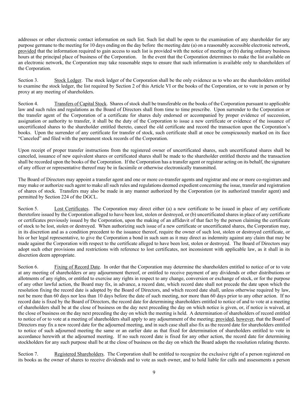 9 addresses or other electronic contact information on such list. Such list shall be open to the examination of any shareholder for any purpose germane to the meeting for 10 days ending on the day before the meeting date (a) on a reasonably accessible electronic network, provided that the information required to gain access to such list is provided with the notice of meeting or (b) during ordinary business hours at the principal place of business of the Corporation. In the event that the Corporation determines to make the list available on an electronic network, the Corporation may take reasonable steps to ensure that such information is available only to shareholders of the Corporation. Section 3. Stock Ledger. The stock ledger of the Corporation shall be the only evidence as to who are the shareholders entitled to examine the stock ledger, the list required by Section 2 of this Article VI or the books of the Corporation, or to vote in person or by proxy at any meeting of shareholders. Section 4. Transfers of Capital Stock. Shares of stock shall be transferable on the books of the Corporation pursuant to applicable law and such rules and regulations as the Board of Directors shall from time to time prescribe. Upon surrender to the Corporation or the transfer agent of the Corporation of a certificate for shares duly endorsed or accompanied by proper evidence of succession, assignation or authority to transfer, it shall be the duty of the Corporation to issue a new certificate or evidence of the issuance of uncertificated shares to the shareholder entitled thereto, cancel the old certificate and record the transaction upon the Corporation’s books. Upon the surrender of any certificate for transfer of stock, such certificate shall at once be conspicuously marked on its face “Canceled” and filed with the permanent stock records of the Corporation. Upon receipt of proper transfer instructions from the registered owner of uncertificated shares, such uncertificated shares shall be canceled, issuance of new equivalent shares or certificated shares shall be made to the shareholder entitled thereto and the transaction shall be recorded upon the books of the Corporation. If the Corporation has a transfer agent or registrar acting on its behalf, the signature of any officer or representative thereof may be in facsimile or otherwise electronically transmitted. The Board of Directors may appoint a transfer agent and one or more co-transfer agents and registrar and one or more co-registrars and may make or authorize such agent to make all such rules and regulations deemed expedient concerning the issue, transfer and registration of shares of stock. Transfers may also be made in any manner authorized by the Corporation (or its authorized transfer agent) and permitted by Section 224 of the DGCL. Section 5. Lost Certificates. The Corporation may direct either (a) a new certificate to be issued in place of any certificate theretofore issued by the Corporation alleged to have been lost, stolen or destroyed, or (b) uncertificated shares in place of any certificate or certificates previously issued by the Corporation, upon the making of an affidavit of that fact by the person claiming the certificate of stock to be lost, stolen or destroyed. When authorizing such issue of a new certificate or uncertificated shares, the Corporation may, in its discretion and as a condition precedent to the issuance thereof, require the owner of such lost, stolen or destroyed certificate, or his or her legal representative, to give the Corporation a bond in such sum as it may direct as indemnity against any claim that may be made against the Corporation with respect to the certificate alleged to have been lost, stolen or destroyed. The Board of Directors may adopt such other provisions and restrictions with reference to lost certificates, not inconsistent with applicable law, as it shall in its discretion deem appropriate. Section 6. Fixing of Record Date. In order that the Corporation may determine the shareholders entitled to notice of or to vote at any meeting of shareholders or any adjournment thereof, or entitled to receive payment of any dividends or other distributions or allotments of any rights, or entitled to exercise any rights in respect to any change, conversion or exchange of stock, or for the purpose of any other lawful action, the Board may fix, in advance, a record date, which record date shall not precede the date upon which the resolution fixing the record date is adopted by the Board of Directors, and which record date shall, unless otherwise required by law, not be more than 60 days nor less than 10 days before the date of such meeting, nor more than 60 days prior to any other action. If no record date is fixed by the Board of Directors, the record date for determining shareholders entitled to notice of and to vote at a meeting of shareholders shall be at the close of business on the day next preceding the day on which notice is given, or, if notice is waived, at the close of business on the day next preceding the day on which the meeting is held. A determination of shareholders of record entitled to notice of or to vote at a meeting of shareholders shall apply to any adjournment of the meeting; provided, however, that the Board of Directors may fix a new record date for the adjourned meeting, and in such case shall also fix as the record date for shareholders entitled to notice of such adjourned meeting the same or an earlier date as that fixed for determination of shareholders entitled to vote in accordance herewith at the adjourned meeting. If no such record date is fixed for any other action, the record date for determining stockholders for any such purpose shall be at the close of business on the day on which the Board adopts the resolution relating thereto. Section 7. Registered Shareholders. The Corporation shall be entitled to recognize the exclusive right of a person registered on its books 
