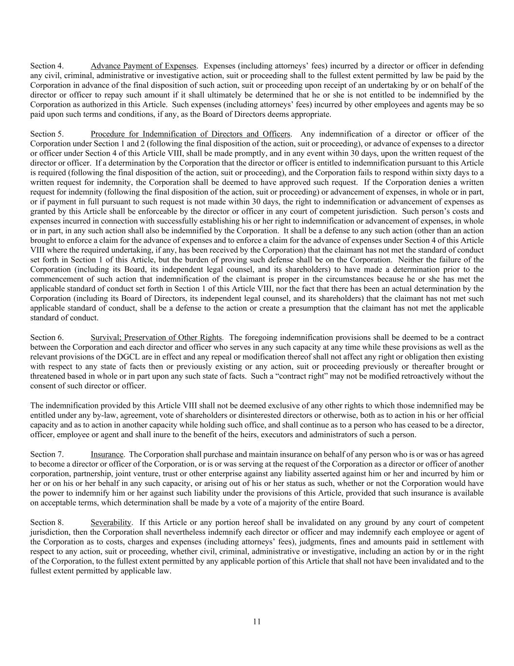 11 Section 4. Advance Payment of Expenses. Expenses (including attorneys’ fees) incurred by a director or officer in defending any civil, criminal, administrative or investigative action, suit or proceeding shall to the fullest extent permitted by law be paid by the Corporation in advance of the final disposition of such action, suit or proceeding upon receipt of an undertaking by or on behalf of the director or officer to repay such amount if it shall ultimately be determined that he or she is not entitled to be indemnified by the Corporation as authorized in this Article. Such expenses (including attorneys’ fees) incurred by other employees and agents may be so paid upon such terms and conditions, if any, as the Board of Directors deems appropriate. Section 5. Procedure for Indemnification of Directors and Officers. Any indemnification of a director or officer of the Corporation under Section 1 and 2 (following the final disposition of the action, suit or proceeding), or advance of expenses to a director or officer under Section 4 of this Article VIII, shall be made promptly, and in any event within 30 days, upon the written request of the director or officer. If a determination by the Corporation that the director or officer is entitled to indemnification pursuant to this Article is required (following the final disposition of the action, suit or proceeding), and the Corporation fails to respond within sixty days to a written request for indemnity, the Corporation shall be deemed to have approved such request. If the Corporation denies a written request for indemnity (following the final disposition of the action, suit or proceeding) or advancement of expenses, in whole or in part, or if payment in full pursuant to such request is not made within 30 days, the right to indemnification or advancement of expenses as granted by this Article shall be enforceable by the director or officer in any court of competent jurisdiction. Such person’s costs and expenses incurred in connection with successfully establishing his or her right to indemnification or advancement of expenses, in whole or in part, in any such action shall also be indemnified by the Corporation. It shall be a defense to any such action (other than an action brought to enforce a claim for the advance of expenses and to enforce a claim for the advance of expenses under Section 4 of this Article VIII where the required undertaking, if any, has been received by the Corporation) that the claimant has not met the standard of conduct set forth in Section 1 of this Article, but the burden of proving such defense shall be on the Corporation. Neither the failure of the Corporation (including its Board, its independent legal counsel, and its shareholders) to have made a determination prior to the commencement of such action that indemnification of the claimant is proper in the circumstances because he or she has met the applicable standard of conduct set forth in Section 1 of this Article VIII, nor the fact that there has been an actual determination by the Corporation (including its Board of Directors, its independent legal counsel, and its shareholders) that the claimant has not met such applicable standard of conduct, shall be a defense to the action or create a presumption that the claimant has not met the applicable standard of conduct. Section 6. Survival; Preservation of Other Rights. The foregoing indemnification provisions shall be deemed to be a contract between the Corporation and each director and officer who serves in any such capacity at any time while these provisions as well as the relevant provisions of the DGCL are in effect and any repeal or modification thereof shall not affect any right or obligation then existing with respect to any state of facts then or previously existing or any action, suit or proceeding previously or thereafter brought or threatened based in whole or in part upon any such state of facts. Such a “contract right” may not be modified retroactively without the consent of such director or officer. The indemnification provided by this Article VIII shall not be deemed exclusive of any other rights to which those indemnified may be entitled under any by-law, agreement, vote of shareholders or disinterested directors or otherwise, both as to action in his or her official capacity and as to action in another capacity while holding such office, and shall continue as to a person who has ceased to be a director, officer, employee or agent and shall inure to the benefit of the heirs, executors and administrators of such a person. Section 7. Insurance. The Corporation shall purchase and maintain insurance on behalf of any person who is or was or has agreed to become a director or officer of the Corporation, or is or was serving at the request of the Corporation as a director or officer of another corporation, partnership, joint venture, trust or other enterprise against any liability asserted against him or her and incurred by him or her or on his or her behalf in any such capacity, or arising out of his or her status as such, whether or not the Corporation would have the power to indemnify him or her against such liability under the provisions of this Article, provided that such insurance is available on acceptable terms, which determination shall be made by a vote of a majority of the entire Board. Section 8. Severability. If this Article or any portion hereof shall be invalidated on any ground by any court of competent jurisdiction, then the Corporation shall nevertheless indemnify each director or officer and may indemnify each employee or agent of the Corporation as to costs, charges and expenses (including attorneys’ fees), judgments, fines and amounts paid in settlement with respect to any action, suit or proceeding, whether civil, criminal, administrative or investigative, including an action by or in the right of the Corporation, to the fullest extent permitted by any applicable portion