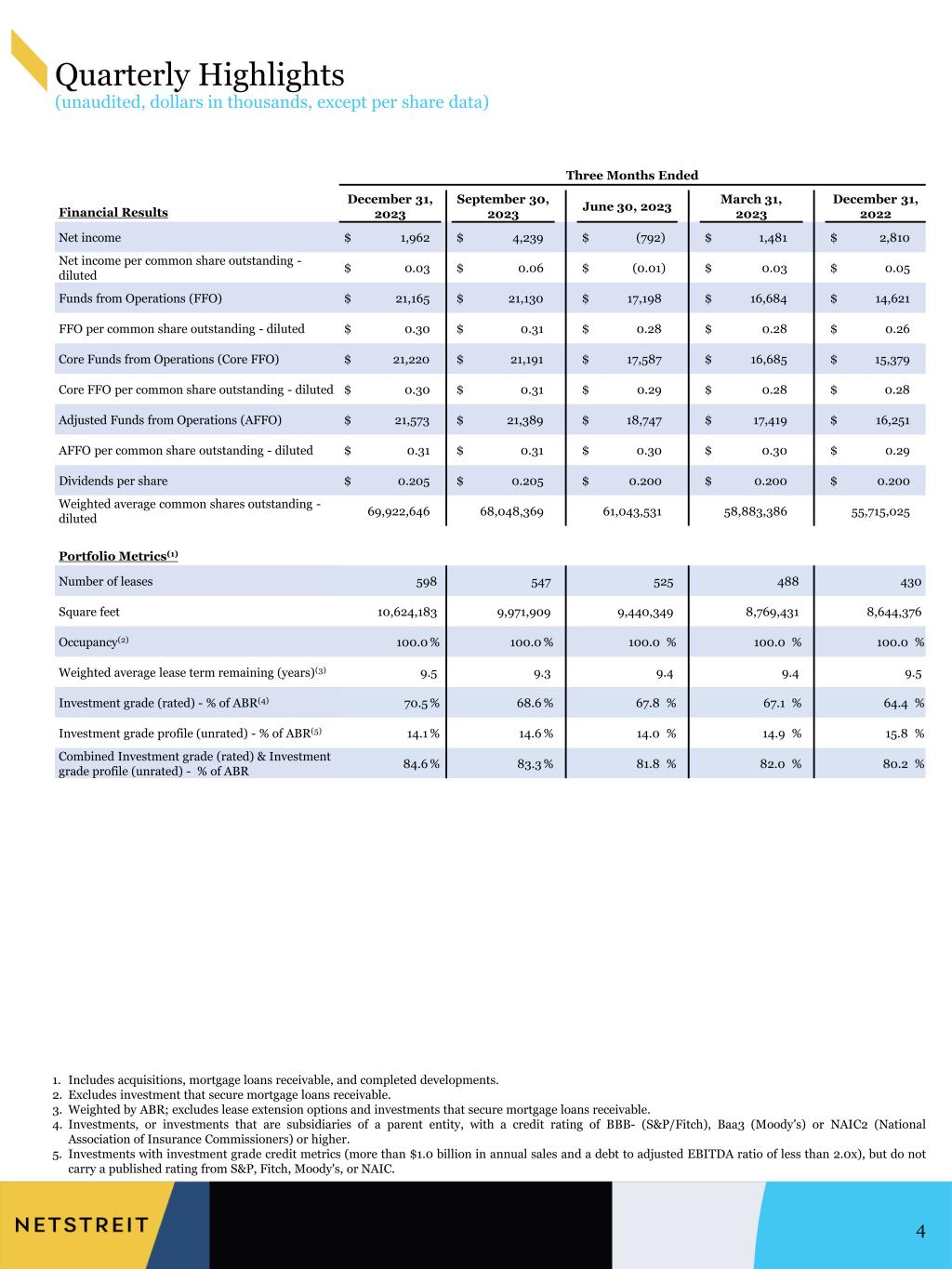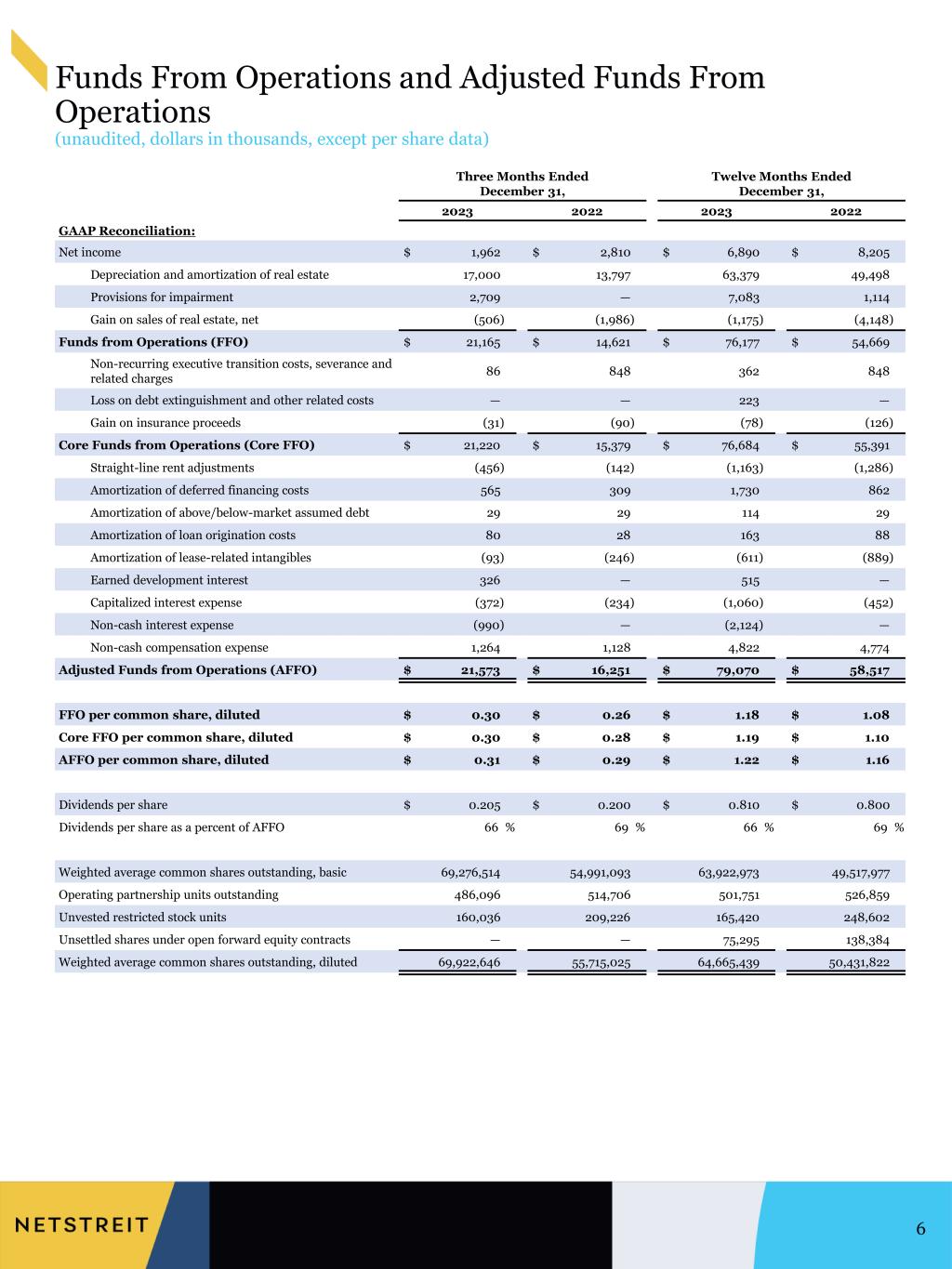 Three Months Ended December 31, Twelve Months Ended December 31, 2023 2022 2023 2022 GAAP Reconciliation: Net income $ 1,962 $ 2,810 $ 6,890 $ 8,205 Depreciation and amortization of real estate 17,000 13,797 63,379 49,498 Provisions for impairment 2,709 — 7,083 1,114 Gain on sales of real estate, net (506) (1,986) (1,175) (4,148) Funds from Operations (FFO) $ 21,165 $ 14,621 $ 76,177 $ 54,669 Non-recurring executive transition costs, severance and related charges 86 848 362 848 Loss on debt extinguishment and other related costs — — 223 — Gain on insurance proceeds (31) (90) (78) (126) Core Funds from Operations (Core FFO) $ 21,220 $ 15,379 $ 76,684 $ 55,391 Straight-line rent adjustments (456) (142) (1,163) (1,286) Amortization of deferred financing costs 565 309 1,730 862 Amortization of above/below-market assumed debt 29 29 114 29 Amortization of loan origination costs 80 28 163 88 Amortization of lease-related intangibles (93) (246) (611) (889) Earned development interest 326 — 515 — Capitalized interest expense (372) (234) (1,060) (452) Non-cash interest expense (990) — (2,124) — Non-cash compensation expense 1,264 1,128 4,822 4,774 Adjusted Funds from Operations (AFFO) $ 21,573 $ 16,251 $ 79,070 $ 58,517 FFO per common share, diluted $ 0.30 $ 0.26 $ 1.18 $ 1.08 Core FFO per common share, diluted $ 0.30 $ 0.28 $ 1.19 $ 1.10 AFFO per common share, diluted $ 0.31 $ 0.29 $ 1.22 $ 1.16 Dividends per share $ 0.205 $ 0.200 $ 0.810 $ 0.800 Dividends per share as a percent of AFFO 66 % 69 % 66 % 69 % Weighted average common shares outstanding, basic 69,276,514 54,991,093 63,922,973 49,517,977 Operating partnership units outstanding 486,096 514,706 501,751 526,859 Unvested restricted stock units 160,036 209,226 165,420 248,602 Unsettled shares under open forward equity contracts — — 75,295 138,384 Weighted average common shares outstanding, diluted 69,922,646 55,715,025 64,665,439 50,431,822 Funds From Operations and Adjusted Funds From Operations (unaudited, dollars in thousands, except per share data) 30