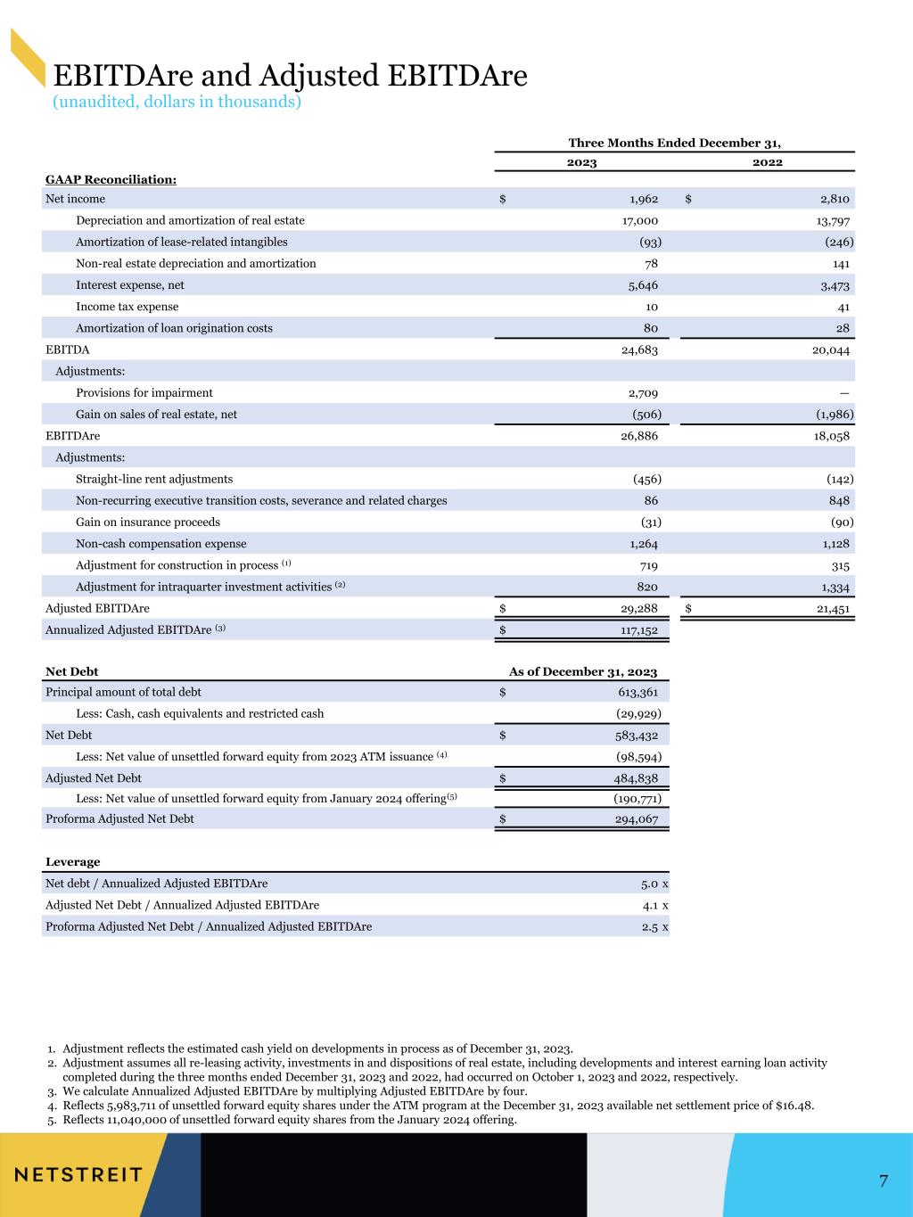 1. Adjustment reflects the estimated cash yield on developments in process as of December 31, 2023. 2. The adjustment assumes all re-leasing activity, investments in and dispositions of real estate, including developments and interest earning loan activity completed during the three months ended December 31, 2023 and 2022 had occurred on October 1, 2023 and 2022, respectively. 3. We calculate Annualized Adjusted EBITDAre by multiplying Adjusted EBITDAre by four. 4. Reflects 5,983,711 of unsettled forward equity shares under the ATM program at the December 31, 2023 available net settlement price of $16.48. 5. Reflects 11,040,000 of unsettled forward equity shares from the January 2024 offering. Three Months Ended December 31, 2023 2022 GAAP Reconciliation: Net income $ 1,962 $ 2,810 Depreciation and amortization of real estate 17,000 13,797 Amortization of lease-related intangibles (93) (246) Non-real estate depreciation and amortization 78 141 Interest expense, net 5,646 3,473 Income tax expense 10 41 Amortization of loan origination costs 80 28 EBITDA 24,683 20,044 Adjustments: Provisions for impairment 2,709 — Gain on sales of real estate, net (506) (1,986) EBITDAre 26,886 18,058 Adjustments: Straight-line rent adjustments (456) (142) Non-recurring executive transition costs, severance and related charges 86 848 Gain on insurance proceeds (31) (90) Non-cash compensation expense 1,264 1,128 Adjustment for construction in process (1) 719 315 Adjustment for intraquarter investment activities (2) 820 1,334 Adjusted EBITDAre $ 29,288 $ 21,451 Annualized Adjusted EBITDAre (3) $ 117,152 Net Debt As of December 31, 2023 Principal amount of total debt $ 613,361 Less: Cash, cash equivalents and restricted cash (29,929) Net Debt $ 583,432 Less: Net value of unsettled forward equity from 2023 ATM issuance (4) (98,594) Adjusted Net Debt $ 484,838 Less: Net value of unsettled forward equity from January 2024 offering (5) (190,771) Proforma Adjusted Net Debt $ 294,067 Leverage Net debt / Annualized Adjusted EBITDAre 5.0 x Adjusted Net Debt / Annualized Adjusted EBITDAre 4.1 x Proforma Adjusted Net Debt / Annualized Adjusted EBITDAre 2.5 x EBITDAre and Adjusted EBITDAre (unaudited, dollars in thousands) 31