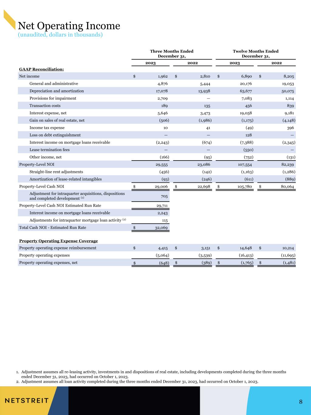 Net Operating Income (unaudited, dollars in thousands) 1. Adjustments assumes all re-leasing activity, investments in and dispositions of real estate, including developments completed during the three months ended December 31, 2023, had occurred on October 1, 2023. 2. Adjustment assumes all loan activity completed during the three months ended December 31, 2023, had occurred on October 1, 2023. Three Months Ended December 31, Twelve Months Ended December 31, 2023 2022 2023 2022 GAAP Reconciliation: Net income $ 1,962 $ 2,810 $ 6,890 $ 8,205 General and administrative 4,876 5,444 20,176 19,053 Depreciation and amortization 17,078 13,938 63,677 50,075 Provisions for impairment 2,709 — 7,083 1,114 Transaction costs 189 135 456 839 Interest expense, net 5,646 3,473 19,058 9,181 Gain on sales of real estate, net (506) (1,986) (1,175) (4,148) Income tax expense 10 41 (49) 396 Loss on debt extinguishment — — 128 — Interest income on mortgage loans receivable (2,243) (674) (7,388) (2,345) Lease termination fees — — (550) — Other income, net (166) (95) (752) (131) Property-Level NOI 29,555 23,086 107,554 82,239 Straight-line rent adjustments (456) (142) (1,163) (1,286) Amortization of lease-related intangibles (93) (246) (611) (889) Property-Level Cash NOI $ 29,006 $ 22,698 $ 105,780 $ 80,064 Adjustment for intraquarter acquisitions, dispositions and completed development (1) 705 Property-Level Cash NOI Estimated Run Rate $ 29,711 Interest income on mortgage loans receivable 2,243 Adjustments for intraquarter mortgage loan activity (2) 115 Total Cash NOI - Estimated Run Rate $ 32,069 Property Operating Expense Coverage Property operating expense reimbursement $ 4,415 $ 3,151 $ 14,648 $ 10,214 Property operating expenses (5,064) (3,539) (16,413) (11,695) Property operating expenses, net $ (648) $ (389) $ (1,765) $ (1,481) 32