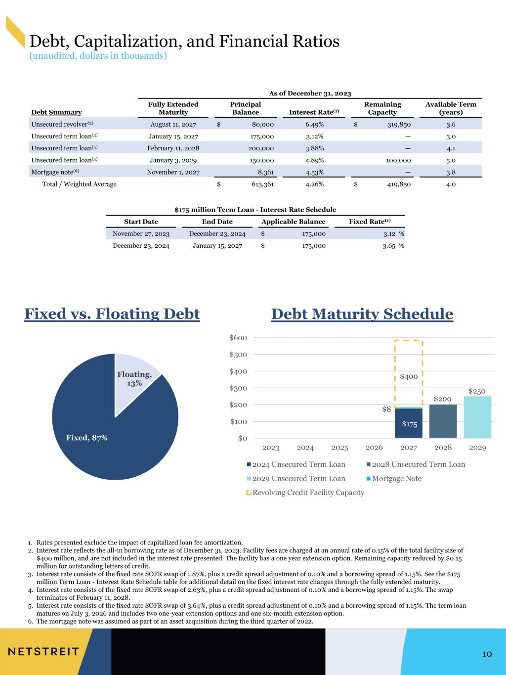 Consolidated Balance Sheets (unaudited, dollars in thousands, except per share data) 9 December 31, 2023 2022 ASSETS Real estate, at cost: Land $ 460,896 $ 401,146 Buildings and improvements 1,149,809 907,084 Total real estate, at cost 1,610,705 1,308,230 Less accumulated depreciation (101,210) (62,526) Property under development 29,198 16,796 Real estate held for investment, net 1,538,693 1,262,500 Assets held for sale 52,451 23,208 Mortgage loans receivable, net 114,472 46,378 Cash, cash equivalents and restricted cash 29,929 70,543 Lease intangible assets, net 161,354 151,006 Other assets, net 49,337 52,057 Total assets $ 1,946,236 $ 1,605,692 LIABILITIES AND EQUITY Liabilities: Term loans, net 521,912 373,296 Revolving credit facility 80,000 113,000 Mortgage note payable, net 7,883 7,896 Lease intangible liabilities, net 25,353 30,131 Liabilities related to assets held for sale 1,158 406 Accounts payable, accrued expenses and other liabilities 36,498 22,540 Total liabilities $ 672,804 $ 547,269 Equity: Stockholders’ equity Common stock, $0.01 par value, 400,000,000 shares authorized; 73,207,080 and 58,031,879 shares issued and outstanding as of December 31, 2023 and 2022, respectively $ 732 $ 580 Additional paid-in capital 1,367,505 1,091,514 Distributions in excess of retained earnings (112,276) (66,937) Accumulated other comprehensive income 8,943 23,673 Total stockholders’ equity 1,264,904 1,048,830 Noncontrolling interests 8,528 9,593 Total equity 1,273,432 1,058,423 Total liabilities and equity $ 1,946,236 $ 1,605,692