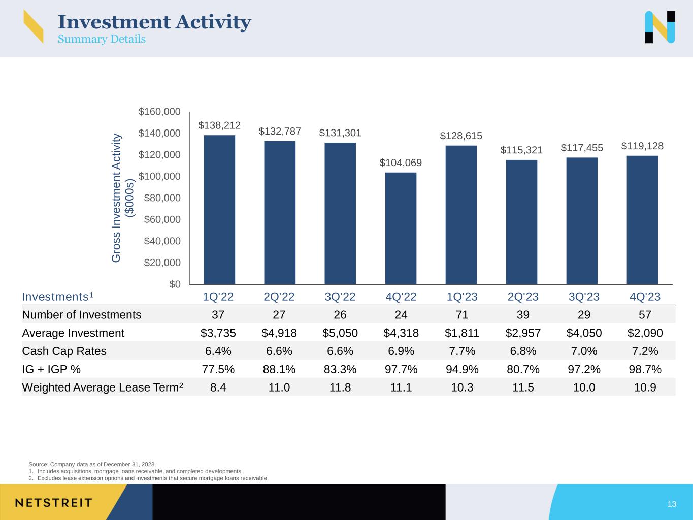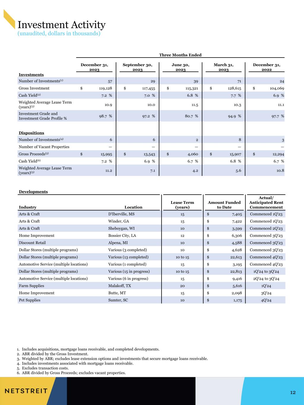 1. Includes acquisitions, mortgage loans receivable, and completed developments. 2. ABR divided by the Gross Investment. 3. Weighted by ABR; excludes lease extension options and investments that secure mortgage loans receivable. 4. Includes investments associated with mortgage loans receivable. 5. Excludes transaction costs. 6. ABR divided by Gross Proceeds; excludes vacant properties. Investment Activity (unaudited, dollars in thousands) 12 Three Months Ended December 31, September 30, June 30, March 31, December 31, 2023 2023 2023 2023 2022 Investments Number of Investments(1) 57 29 39 71 24 Gross Investment $ 119,128 $ 117,455 $ 115,321 $ 128,615 $ 104,069 Cash Yield(2) 7.2 % 7.0 % 6.8 % 7.7 % 6.9 % Weighted Average Lease Term (years)(3) 10.9 10.0 11.5 10.3 11.1 Investment Grade and Investment Grade Profile % 98.7 % 97.2 % 80.7 % 94.9 % 97.7 % Dispositions Number of Investments(4) 6 6 2 8 3 Number of Vacant Properties — — — — — Gross Proceeds(5) $ 15,995 $ 13,543 $ 4,060 $ 15,907 $ 12,294 Cash Yield(6) 7.2 % 6.9 % 6.7 % 6.8 % 6.7 % Weighted Average Lease Term (years)(3) 11.2 7.1 4.2 5.6 10.8 Developments Industry Location Lease Term (years) Amount Funded to Date Actual/ Anticipated Rent Commencement Arts & Craft D'Iberville, MS 15 $ 7,405 Commenced 1Q'23 Arts & Craft Winder, GA 15 $ 7,422 Commenced 1Q'23 Arts & Craft Sheboygan, WI 10 $ 3,599 Commenced 2Q'23 Home Improvement Bossier City, LA 12 $ 6,306 Commenced 3Q'23 Discount Retail Alpena, MI 10 $ 4,588 Commenced 3Q'23 Dollar Stores (multiple programs) Various (3 completed) 10 $ 4,628 Commenced 3Q'23 Dollar Stores (multiple programs) Various (13 completed) 10 to 15 $ 22,613 Commenced 4Q'23 Automotive Service (multiple locations) Various (1 completed) 15 $ 3,195 Commenced 4Q'23 Dollar Stores (multiple programs) Various (15 in progress) 10 to 15 $ 22,813 1Q'24 to 3Q'24 Automotive Service (multiple locations) Various (6 in progress) 15 $ 9,416 2Q'24 to 3Q'24 Farm Supplies Malakoff, TX 20 $ 5,616 1Q'24 Home Improvement Butte, MT 15 $ 2,098 3Q'24 Pet Supplies Sumter, SC 10 $ 1,175 4Q'24