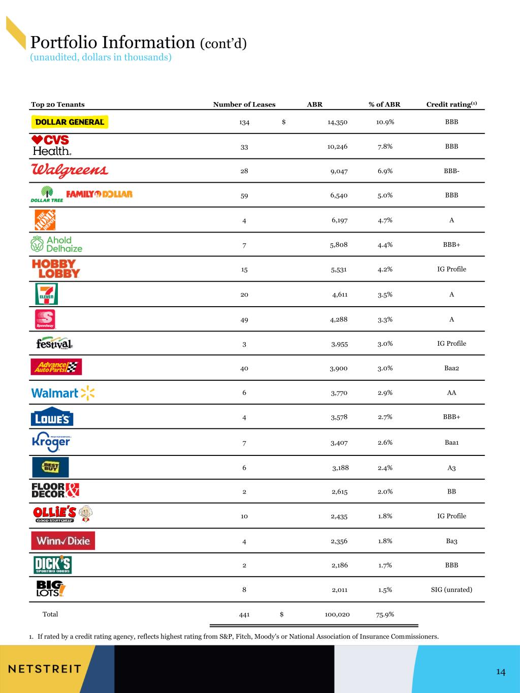 Portfolio Information (unaudited, dollars in thousands) 13 1. Includes acquisitions, mortgage loans receivable, and completed developments. 2. Excludes 70 investments that secure mortgage loans receivable. 3. Weighted by ABR; excludes lease extension options and 70 investments that secure mortgage loans receivable. 4. Investments, or investments that are subsidiaries of a parent entity (with such subsidiary making up at least 50% of the parent company total revenue), with a credit rating of BBB- (S&P), Baa3 (Moody's) or NAIC2 (National Association of Insurance Commissioners) or higher. 5. Investments with investment grade credit metrics (more than $1.0 billion in annual sales and a debt to adjusted EBITDA ratio of less than 2.0x), but do not carry a published rating from S&P, Moody's, or NAIC. 6. Investments, or investments that are subsidiaries of a parent entity (with such subsidiary making up at least 50% of the parent company total revenue), with a credit rating of BB+ (S&P), Ba1 (Moody's) or NAIC3 (National Association of Insurance Commissioners) or lower. Portfolio Metrics December 31, 2023 Number of Investments(1) 598 Number of states 45 Square feet 10,624,183 Tenants 85 Industries 26 Occupancy(2) 100.0 % Weighted average lease term remaining (years)(3) 9.5 Tenant Quality Number of Investments ABR % of ABR Investment grade (rated)(4) 472 $ 92,927 70.5% Investment grade profile (unrated)(5) 49 18,641 14.1% Sub-investment grade (rated)(6) 28 11,542 8.8% Sub-investment grade profile (unrated) 49 8,750 6.6% Total 598 $ 131,859 100.0% 87.6% of ABR Necessity Discount Service Other 12.3% 84.6% of ABR Inv. Grade Inv. Grade Profile Sub-Investment Grade 8.8% Investment Grade Profile 14.1% Investment Grade 70.5% Sub-Investment Grade Profile 6.6% Tenant Quality Discount 22.0% Necessity 52.3% Service 13.3% Defensive Category