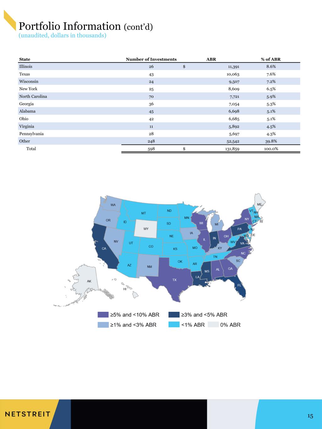 Portfolio Information (cont’d) (unaudited, dollars in thousands) 14 1. If rated by a credit rating agency, reflects highest rating from S&P, Fitch, Moody's or National Association of Insurance Commissioners. Top 20 Tenants Number of Leases ABR % of ABR Credit rating(1) 134 $ 14,350 10.9% BBB 33 10,246 7.8% BBB 28 9,047 6.9% BBB- 59 6,540 5.0% BBB 4 6,197 4.7% A 7 5,808 4.4% BBB+ 15 5,531 4.2% IG Profile 20 4,611 3.5% A 49 4,288 3.3% A 3 3,955 3.0% IG Profile 40 3,900 3.0% Baa2 6 3,770 2.9% AA 4 3,578 2.7% BBB+ 7 3,407 2.6% Baa1 6 3,188 2.4% A3 2 2,615 2.0% BB 10 2,435 1.8% IG Profile 4 2,356 1.8% Ba3 2 2,186 1.7% BBB 8 2,011 1.5% SIG (unrated) Total 441 $ 100,020 75.9%