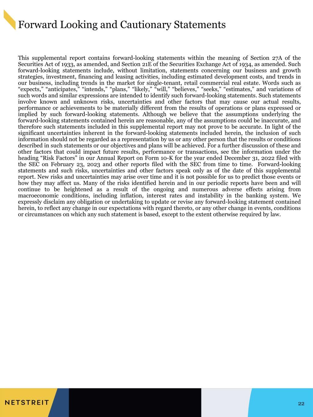 Forward Looking and Cautionary Statements 22 This supplemental report contains forward-looking statements within the meaning of Section 27A of the Securities Act of 1933, as amended, and Section 21E of the Securities Exchange Act of 1934, as amended. Such forward-looking statements include, without limitation, statements concerning our business and growth strategies, investment, financing and leasing activities, including estimated development costs, and trends in our business, including trends in the market for single-tenant, retail commercial real estate. Words such as “expects,” “anticipates,” “intends,” “plans,” “likely,” “will,” “believes,” “seeks,” “estimates,” and variations of such words and similar expressions are intended to identify such forward-looking statements. Such statements involve known and unknown risks, uncertainties and other factors that may cause our actual results, performance or achievements to be materially different from the results of operations or plans expressed or implied by such forward-looking statements. Although we believe that the assumptions underlying the forward-looking statements contained herein are reasonable, any of the assumptions could be inaccurate, and therefore such statements included in this supplemental report may not prove to be accurate. In light of the significant uncertainties inherent in the forward-looking statements included herein, the inclusion of such information should not be regarded as a representation by us or any other person that the results or conditions described in such statements or our objectives and plans will be achieved. For a further discussion of these and other factors that could impact future results, performance or transactions, see the information under the heading “Risk Factors” in our Annual Report on Form 10-K for the year ended December 31, 2022 filed with the SEC on February 23, 2023 and other reports filed with the SEC from time to time. Forward-looking statements and such risks, uncertainties and other factors speak only as of the date of this supplemental report. New risks and uncertainties may arise over time and it is not possible for us to predict those events or how they may affect us. Many of the risks identified herein and in our periodic reports have been and will continue to be heightened as a result of the ongoing and numerous adverse effects arising from macroeconomic conditions, including inflation, interest rates and instability in the banking system. We expressly disclaim any obligation or undertaking to update or revise any forward-looking statement contained herein, to reflect any change in our expectations with regard thereto, or any other change in events, conditions or circumstances on which any such statement is based, except to the extent otherwise required by law.
