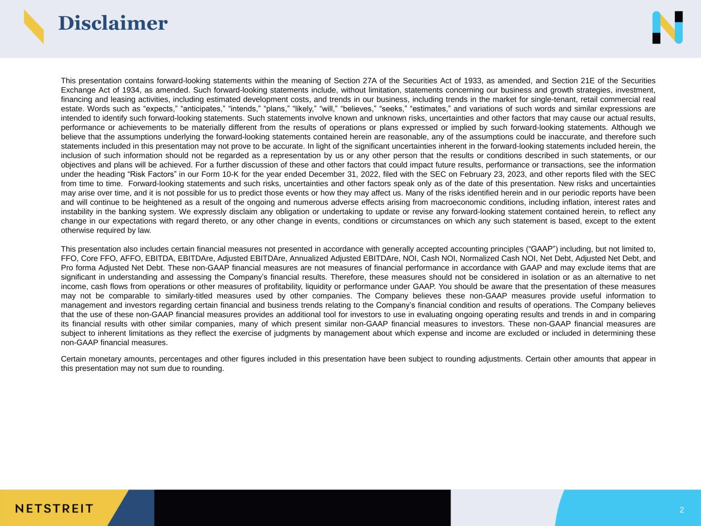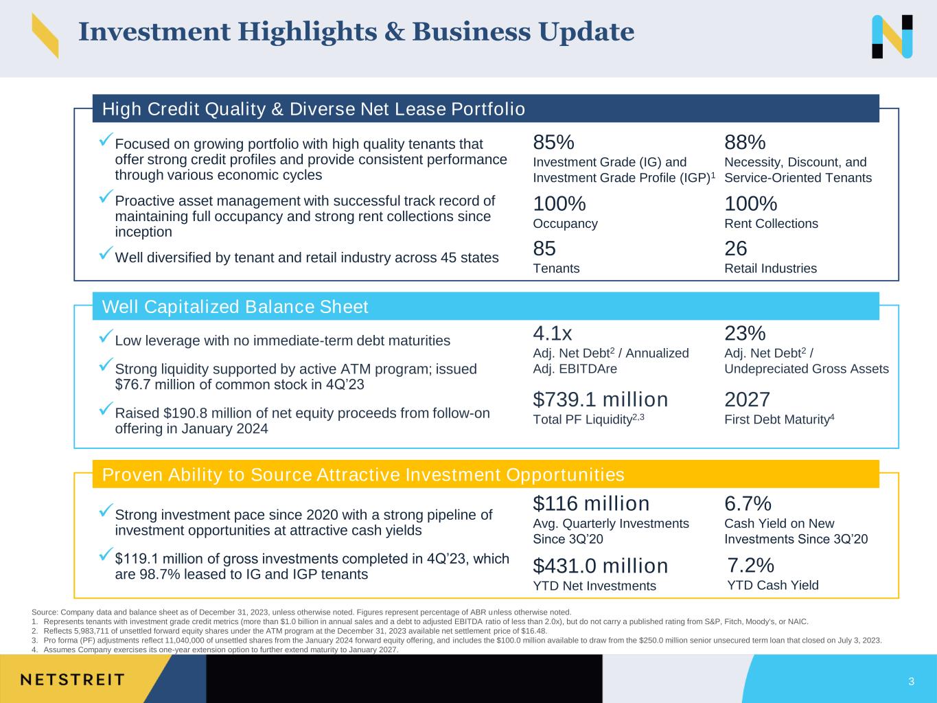 Disclaimer 2 This presentation contains forward-looking statements within the meaning of Section 27A of the Securities Act of 1933, as amended, and Section 21E of the Securities Exchange Act of 1934, as amended. Such forward-looking statements include, without limitation, statements concerning our business and growth strategies, investment, financing and leasing activities, including estimated development costs, and trends in our business, including trends in the market for single-tenant, retail commercial real estate. Words such as “expects,” “anticipates,” “intends,” “plans,” “likely,” “will,” “believes,” “seeks,” “estimates,” and variations of such words and similar expressions are intended to identify such forward-looking statements. Such statements involve known and unknown risks, uncertainties and other factors that may cause our actual results, performance or achievements to be materially different from the results of operations or plans expressed or implied by such forward-looking statements. Although we believe that the assumptions underlying the forward-looking statements contained herein are reasonable, any of the assumptions could be inaccurate, and therefore such statements included in this presentation may not prove to be accurate. In light of the significant uncertainties inherent in the forward-looking statements included herein, the inclusion of such information should not be regarded as a representation by us or any other person that the results or conditions described in such statements, or our objectives and plans will be achieved. For a further discussion of these and other factors that could impact future results, performance or transactions, see the information under the heading “Risk Factors” in our Form 10-K for the year ended December 31, 2022, filed with the SEC on February 23, 2023, and other reports filed with the SEC from time to time. Forward-looking statements and such risks, uncertainties and other factors speak only as of the date of this presentation. New risks and uncertainties may arise over time, and it is not possible for us to predict those events or how they may affect us. Many of the risks identified herein and in our periodic reports have been and will continue to be heightened as a result of the ongoing and numerous adverse effects arising from macroeconomic conditions, including inflation, interest rates and instability in the banking system. We expressly disclaim any obligation or undertaking to update or revise any forward-looking statement contained herein, to reflect any change in our expectations with regard thereto, or any other change in events, conditions or circumstances on which any such statement is based, except to the extent otherwise required by law. This presentation also includes certain financial measures not presented in accordance with generally accepted accounting principles (“GAAP”) including, but not limited to, FFO, Core FFO, AFFO, EBITDA, EBITDAre, Adjusted EBITDAre, Annualized Adjusted EBITDAre, NOI, Cash NOI, Normalized Cash NOI, Net Debt, Adjusted Net Debt, and Pro forma Adjusted Net Debt. These non-GAAP financial measures are not measures of financial performance in accordance with GAAP and may exclude items that are significant in understanding and assessing the Company’s financial results. Therefore, these measures should not be considered in isolation or as an alternative to net income, cash flows from operations or other measures of profitability, liquidity or performance under GAAP. You should be aware that the presentation of these measures may not be comparable to similarly-titled measures used by other companies. The Company believes these non-GAAP measures provide useful information to management and investors regarding certain financial and business trends relating to the Company’s financial condition and results of operations. The Company believes that the use of these non-GAAP financial measures provides an additional tool for investors to use in evaluating ongoing operating results and trends in and in comparing its financial results with other similar companies, many of which present similar non-GAAP financial measures to investors. These non-GAAP financial measures are subject to inherent limitations as they reflect the exercise of judgments by management about which expense and income are excluded or included in determining these non-GAAP financial measures. Certain monetary amounts, percentages and other figures included in this presentation have been subject to rounding adjustments. Certain other amounts that appear in this presentation may not sum due to rounding.
