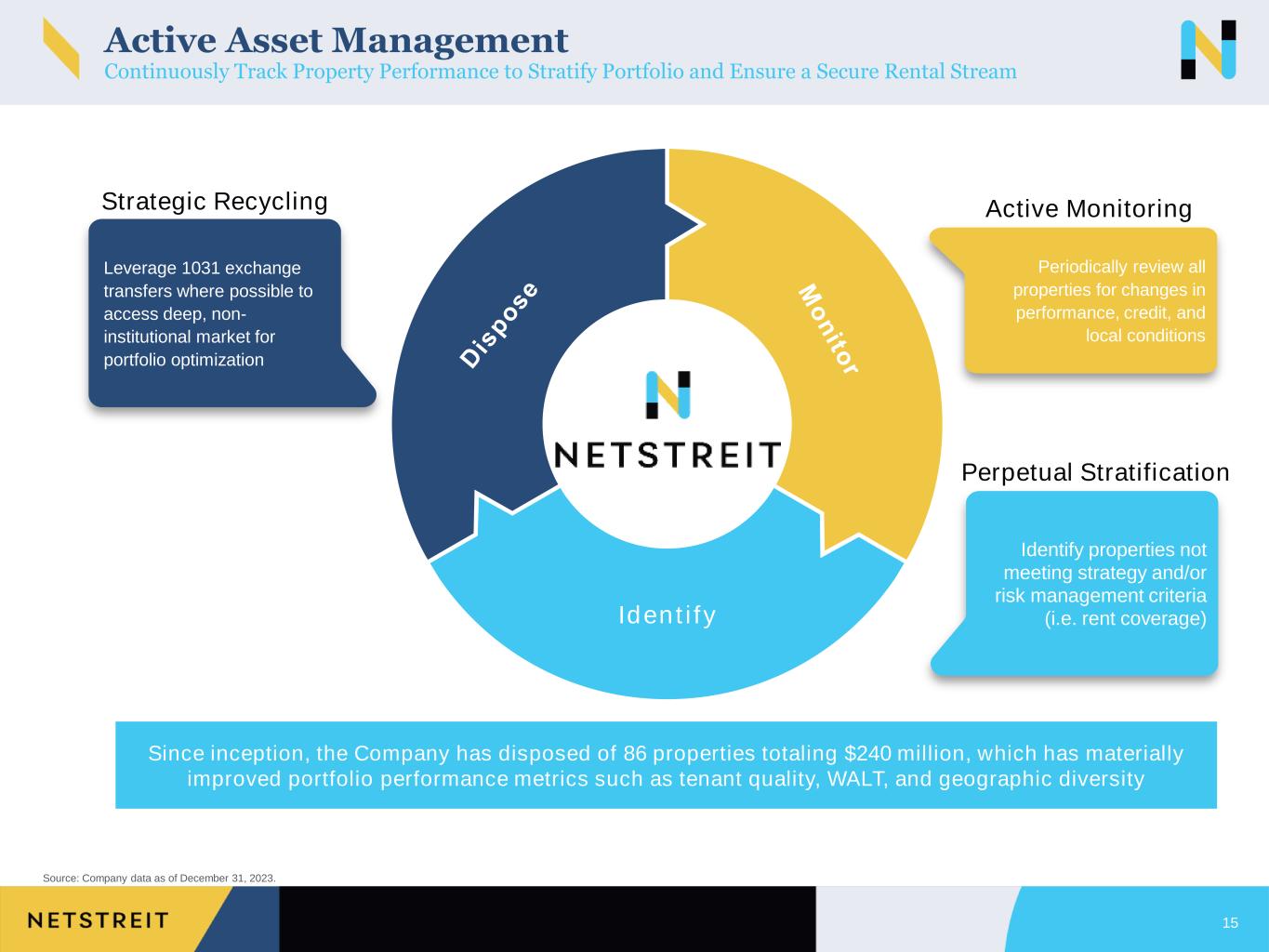 $2,364 $10,328 $1,685 $12,294 $15,907 $4,060 $13,543 $15,995 $0 $2,000 $4,000 $6,000 $8,000 $10,000 $12,000 $14,000 $16,000 $18,000 1Q'22 2Q'22 3Q'22 4Q'22 1Q'23 2Q'23 3Q'23 4Q'23 D is p o s it io n A c ti v it y ($ 0 0 0 s ) 14 Disposition Activity Summary Details Source: Company data as of December 31, 2023. 1. Excludes vacant properties. Dispositions '22 '22 '22 ' 2 ' 3 3 3 3 Cash Cap Rates1 5.5% 6.0% 5.5% 6.7% 6.8% 6.7% 6.9% 7.2% Number of Investments 1 2 1 3 8 2 6 6 Weighted Average Lease Term1 8.0 9.8 0.4 10.8 5.6 4.2 7.1 11.2