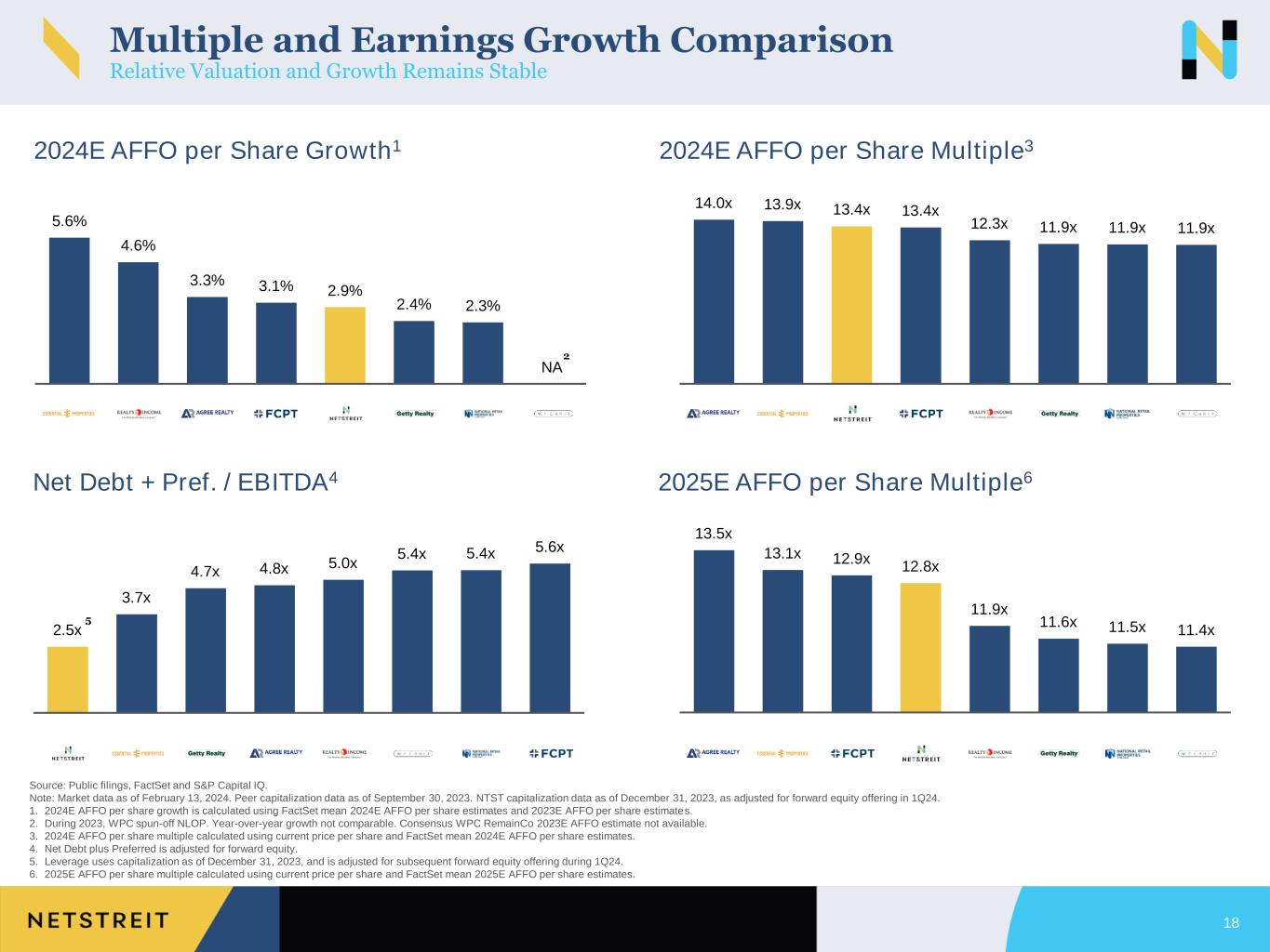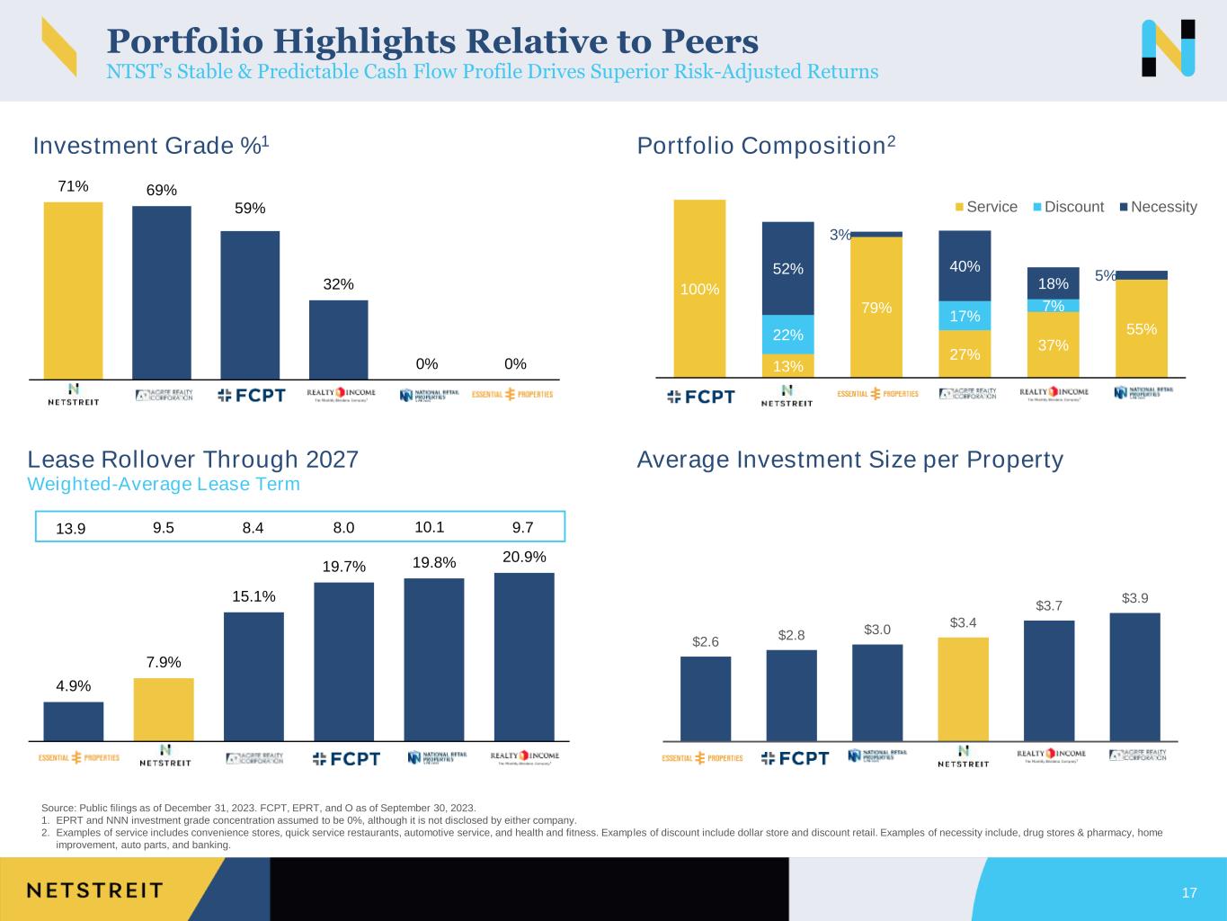 100% 13% 79% 27% 37% 55%22% 17% 7% 52% 3% 40% 18% 5% FCPT NTST EPRT ADC O NNN Service Discount Necessity59% 71% 69% 32% 0% 0% NTST ADC FCPT O NNN EPRT Source: Public filings as of December 31, 2023. FCPT, EPRT, and O as of September 30, 2023. 1. EPRT and NNN investment grade concentration assumed to be 0%, although it is not disclosed by either company. 2. Examples of service includes convenience stores, quick service restaurants, automotive service, and health and fitness. Examples of discount include dollar store and discount retail. Examples of necessity include, drug stores & pharmacy, home improvement, auto parts, and banking. 4.9% 7.9% 15.1% 19.7% 19.8% 20.9% EPRT NTST ADC FCPT NNN O Portfolio Highlights Relative to Peers NTST’s Stable & Predictable Cash Flow Profile Drives Superior Risk-Adjusted Returns Lease Rollover Through 2027 Average Investment Size per Property Investment Grade %1 Portfolio Composition2 Weighted-Average Lease Term 17 13.9 9.5 8.4 8.0 10.1 9.7 $3.9 $3.7 $3.4 $3.0 $2.8 $2.6