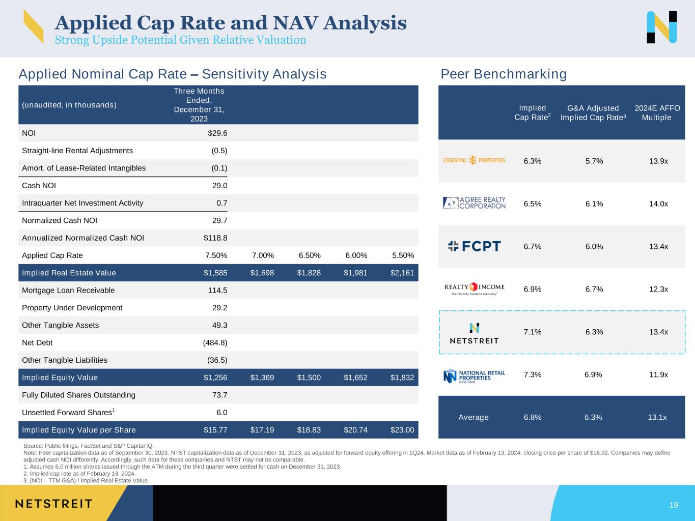 Multiple and Earnings Growth Comparison Relative Valuation and Growth Remains Stable 18 2.5x 3.7x 4.7x 4.8x 5.0x 5.4x 5.4x 5.6x 5.6% 4.6% 3.3% 3.1% 2.9% 2.4% 2.3% NA 13.5x 13.1x 12.9x 12.8x 11.9x 11.6x 11.5x 11.4x 14.0x 13.9x 13.4x 13.4x 12.3x 11.9x 11.9x 11.9x Source: Public filings, FactSet and S&P Capital IQ. Note: Market data as of February 13, 2024. Peer capitalization data as of September 30, 2023. NTST capitalization data as of December 31, 2023, as adjusted for forward equity offering in 1Q24. 1. 2024E AFFO per share growth is calculated using FactSet mean 2024E AFFO per share estimates and 2023E AFFO per share estimates. 2. During 2023, WPC spun-off NLOP. Year-over-year growth not comparable. Consensus WPC RemainCo 2023E AFFO estimate not available. 3. 2024E AFFO per share multiple calculated using current price per share and FactSet mean 2024E AFFO per share estimates. 4. Net Debt plus Preferred is adjusted for forward equity. 5. Leverage uses capitalization as of December 31, 2023, and is adjusted for subsequent forward equity offering during 1Q24. 6. 2025E AFFO per share multiple calculated using current price per share and FactSet mean 2025E AFFO per share estimates. 2024E AFFO per Share Growth1 2024E AFFO per Share Multiple3 Net Debt + Pref. / EBITDA4 2025E AFFO per Share Multiple6 2 5