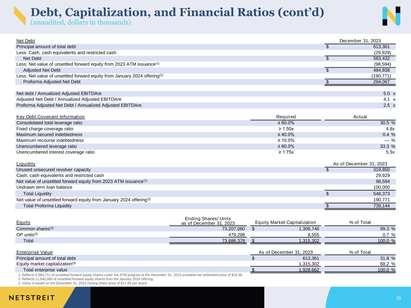 Net Debt December 31, 2023 Principal amount of total debt $ 613,361 Less: Cash, cash equivalents and restricted cash (29,929) Net Debt $ 583,432 Less: Net value of unsettled forward equity from 2023 ATM issuance(1) (98,594) Adjusted Net Debt $ 484,838 Less: Net value of unsettled forward equity from January 2024 offering(2) (190,771) Proforma Adjusted Net Debt $ 294,067 Net debt / Annualized Adjusted EBITDAre 5.0 x Adjusted Net Debt / Annualized Adjusted EBITDAre 4.1 x Proforma Adjusted Net Debt / Annualized Adjusted EBITDAre 2.5 x Key Debt Covenant Information Required Actual Consolidated total leverage ratio ≤ 60.0% 30.5 % Fixed charge coverage ratio ≥ 1.50x 4.8x Maximum secured indebtedness ≤ 40.0% 0.4 % Maximum recourse indebtedness ≤ 10.0% — % Unencumbered leverage ratio ≤ 60.0% 33.3 % Unencumbered interest coverage ratio ≥ 1.75x 5.3x Liquidity As of December 31, 2023 Unused unsecured revolver capacity $ 319,850 Cash, cash equivalents and restricted cash 29,929 Net value of unsettled forward equity from 2023 ATM issuance(1) 98,594 Undrawn term loan balance 100,000 Total Liquidity $ 548,373 Net value of unsettled forward equity from January 2024 offering(2) 190,771 Total Proforma Liquidity $ 739,144 Equity Ending Shares/ Units as of December 31, 2023 Equity Market Capitalization % of Total Common shares(3) 73,207,080 $ 1,306,746 99.3 % OP units(3) 479,298 8,555 0.7 % Total 73,686,378 $ 1,315,302 100.0 % Enterprise Value As of December 31, 2023 % of Total Principal amount of total debt $ 613,361 31.8 % Equity market capitalization(3) 1,315,302 68.2 % Total enterprise value $ 1,928,662 100.0 % 1. Reflects 5,983,711 of unsettled forward equity shares under the ATM program at the December 31, 2023 available net settlement price of $16.48. 2. Reflects 11,040,000 of unsettled forward equity shares from the January 2024 offering. 2. Value is based on the December 31, 2023 closing share price of $17.85 per share. Debt, Capitalization, and Financial Ratios (cont’d) (unaudited, dollars in thousands) 35