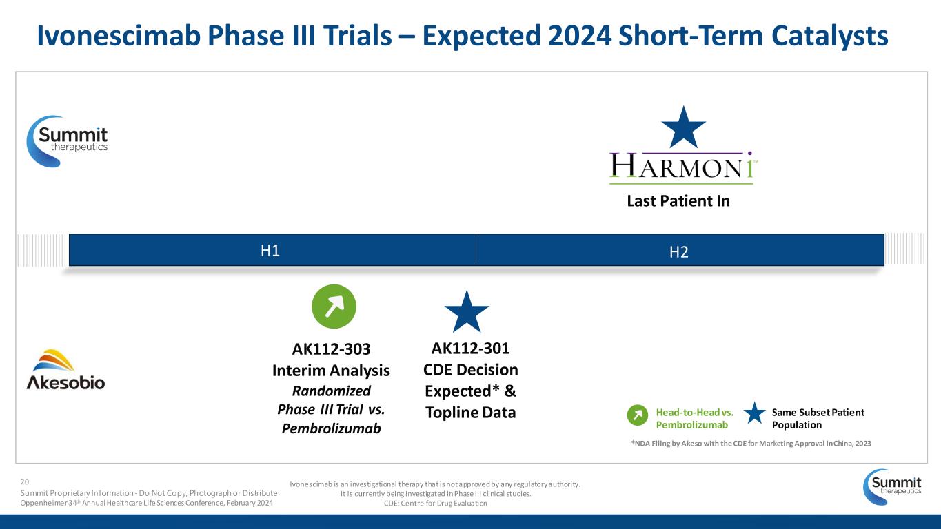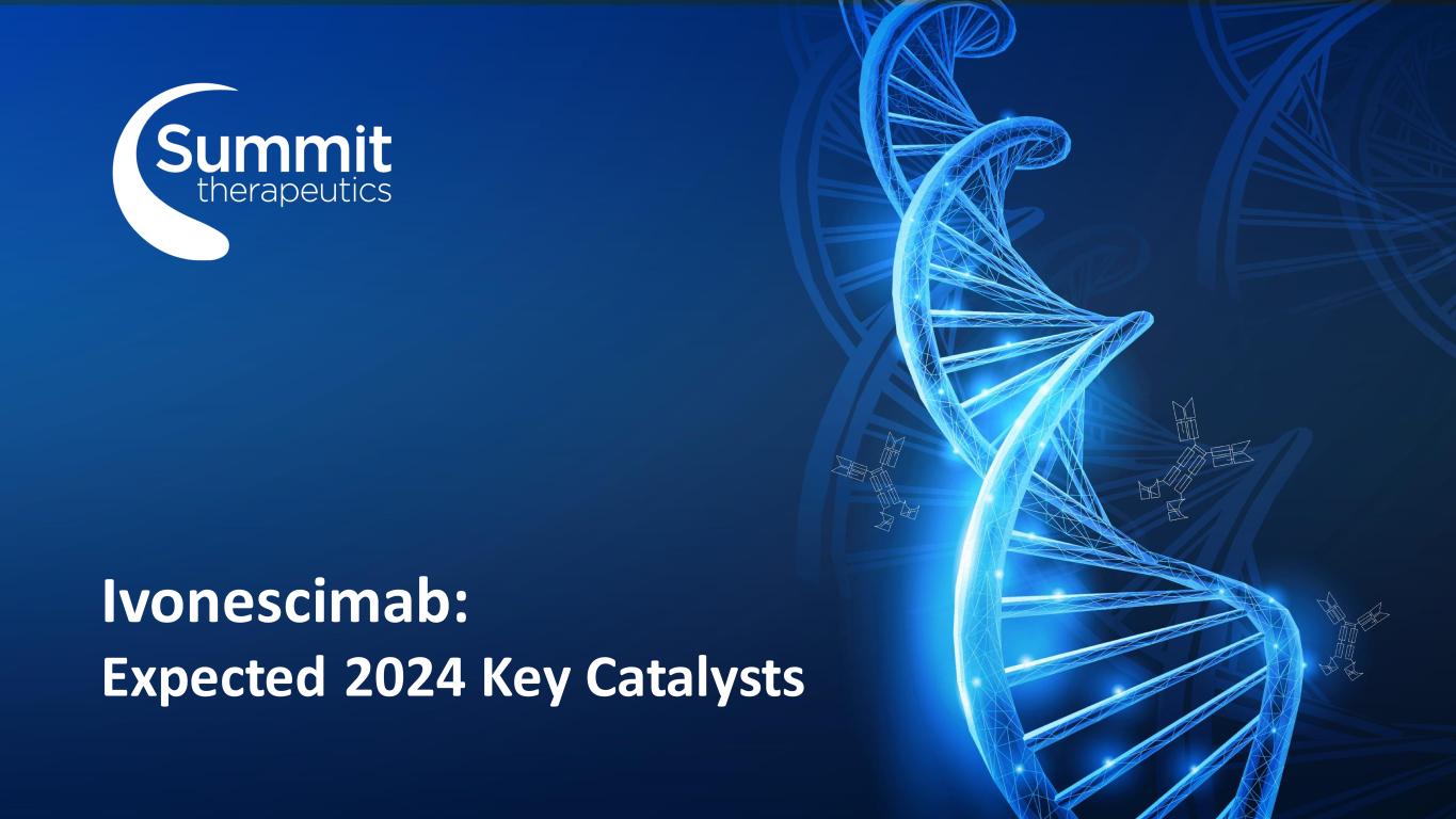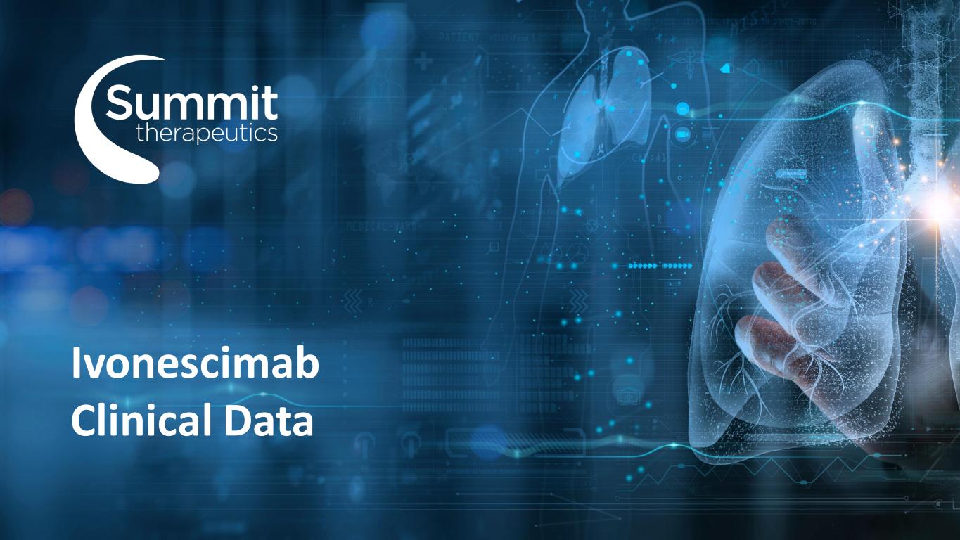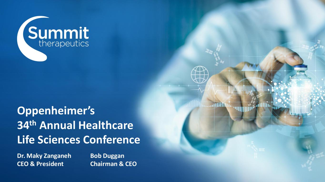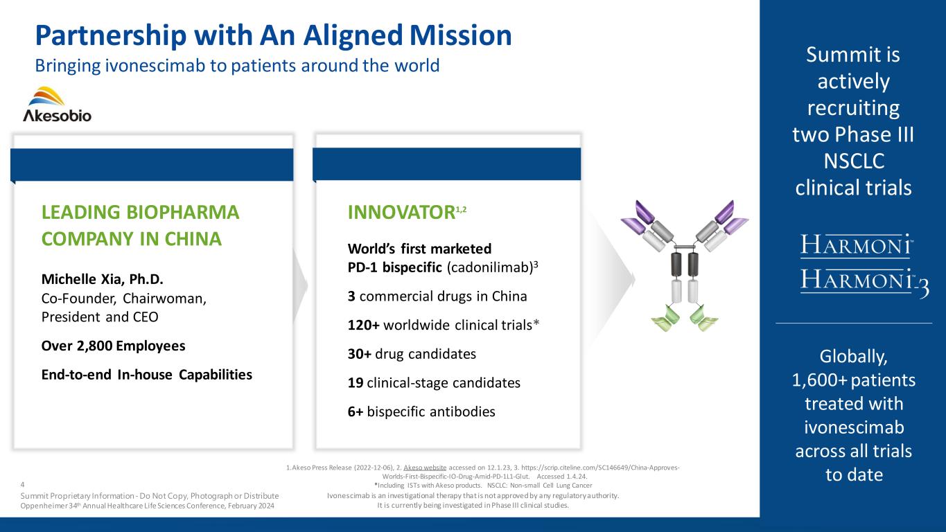 Forward Looking Statement Ivonescimab is an investigational therapy that is not approved by any regulatory authority. It is currently being investigated in Phase III clinical studies. 2 Summit Proprietary Information - Do Not Copy, Photograph or Distribute Oppenheimer 34th Annual Healthcare Life Sciences Conference, February 2024 Any statements in this presentation about the Company’s future expectations, plans and prospects, including but not limited to, statements about the clinical and preclinical development of the Company’s product candidates, entry into and actions related to the Company’s partnership with Akeso Inc., the therapeutic potential of the Company’s product candidates, the potential commercialization of the Company’s product candidates, the timing of initiation, completion and availability of data from clinical trials, the potential submission of applications for marketing approvals, potential acquisitions and other statements containing the words "anticipate," "believe," "continue," "could," "estimate," "expect," "intend," "may," "plan," "potential," "predict," "project," "should," "target," "would," and similar expressions, constitute forward-looking statements within the meaning of The Private Securities Litigation Reform Act of 1995. Actual results may differ materially from those indicated by such forward-looking statements as a result of various important factors, including the results of our evaluation of the underlying data in connection with the development and commercialization activities for ivonescimab, the outcome of discussions with regulatory authorities, including the Food and Drug Administration, the uncertainties inherent in the initiation of future clinical trials, availability and timing of data from ongoing and future clinical trials, the results of such trials, and their success, and global public health crises that may affect timing and status of our clinical trials and operations, whether preliminary results from a clinical trial will be predictive of the final results of that trial or whether results of early clinical trials or preclinical studies will be indicative of the results of later clinical trials, whether business development opportunities to expand the Company’s pipeline of drug candidates, including without limitation, through potential acquisitions of, and/or collaborations with, other entities occur, expectations for regulatory approvals, laws and regulations affecting government contracts and funding awards, availability of funding sufficient for the Company’s foreseeable and unforeseeable operating expenses and capital expenditure requirements and other factors discussed in the "Risk Factors" section of filings that the Company makes with the Securities and Exchange Commission. Any change to our ongoing trials could cause delays, affect our future expenses, and add uncertainty to our commercialization efforts, as well as to affect the likelihood of the successful completion of clinical development of ivonescimab. Accordingly, the audience should not place undue reliance on forward-looking statements or information. In addition, any forward-looking statements included in this presentation represent the Company’s views only as of the date of this presentation and should not be relied upon as representing the Company’s views as of any subsequent date. The Company specifically disclaims any obligation to update any forward-looking statements included in this presentation.