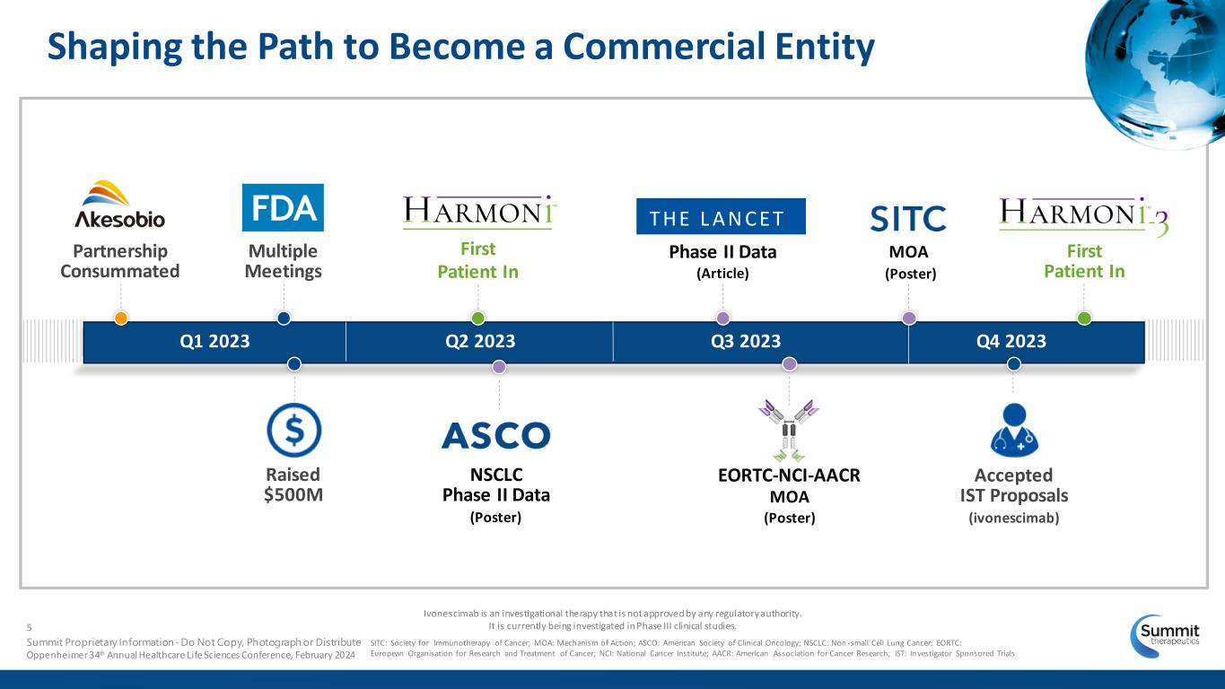 Partnership with An Aligned Mission Bringing ivonescimab to patients around the world Summit is actively recruiting two Phase III NSCLC clinical trials LEADING BIOPHARMA COMPANY IN CHINA Michelle Xia, Ph.D. Co-Founder, Chairwoman, President and CEO Over 2,800 Employees End-to-end In-house Capabilities INNOVATOR1,2 World’s first marketed PD-1 bispecific (cadonilimab)3 3 commercial drugs in China 120+ worldwide clinical trials* 30+ drug candidates 19 clinical-stage candidates 6+ bispecific antibodies 1.Akeso Press Release (2022-12-06), 2. Akeso website accessed on 12.1.23, 3. https://scrip.citeline.com/SC146649/China-Approves- Worlds-First-Bispecific-IO-Drug-Amid-PD-1L1-Glut. Accessed 1.4.24. *Including ISTs with Akeso products. NSCLC: Non-small Cell Lung Cancer Globally, 1,600+ patients treated with ivonescimab across all trials to date 4 Summit Proprietary Information - Do Not Copy, Photograph or Distribute Oppenheimer 34th Annual Healthcare Life Sciences Conference, February 2024 Ivonescimab is an investigational therapy that is not approved by any regulatory authority. It is currently being investigated in Phase III clinical studies.