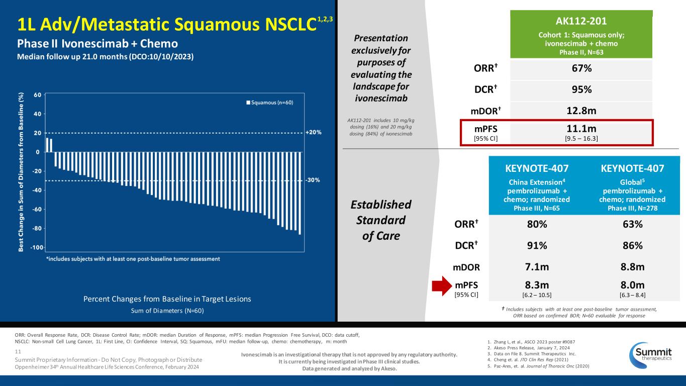 Trial Indication Histology/Population Regimen Phase III NSCLC EGFRm+ 2L+ Advanced or Metastatic Combo ivonescimab + chemo vs. placebo + chemo NSCLC Squamous 1L Metastatic Combo ivonescimab + chemo vs. pembro + chemo Indication Regimen Phase I Phase II Phase III NSCLC: 2L EGFRm+ Randomized: Combo (chemo) vs. chemo NSCLC: 1L PD-L1 TPS>1% Randomized: Monotherapy vs. pembro (PD-1) NSCLC: 1L Squamous Randomized: Combo (chemo) vs. tislelizumab (PD-1) + chemo NSCLC: 1L Squamous Randomized: Combo (chemo) vs. pembro (PD-1) + chemo Advanced Solid Tumors Monotherapy NSCLC Combo (chemo) NSCLC Monotherapy GYN Tumors Monotherapy Ovarian Cancer Combination (PARPi) NSCLC Monotherapy & Combo (chemo) CRC Combo (CD47 + chemo) HCC Monotherapy NSCLC Combo (PD-1 / CTLA-4 bsAb + chemo) HNSCC Combo (CD47) Advanced Solid Tumors** Combo (CD47, CD47 + chemo, chemo) TNBC Comb (chemo, CD47 + chemo) NSCLC Combo (CD73 + chemo) Advanced Solid Tumors Monotherapy ES-SCLC Combo (chemo) Ivonescimab Global Oncology Clinical Trials These ivonescimab cl inical trials are being conducted in China and/or Australia and are ful ly sponsored and managed by Akeso. NSCLC: Non-Small-cell Lung Cancer, EGFRm+: Epidermal Growth Factor Receptor mutant positives, Combo: Combination, Chemo: Chemotherapy, pembro: pembrolizumab, CRC: Colorectal Cancer, HCC: Hepatocellular Carcinoma, HNSCC: Head & Neck Squamous Cell Carcinoma, BTC: Biliary Tract Cancer, TNBC: Triple Negative Breast Cancer, ES-SCLC: Extensive Stage Small Cell Lung Cancer, PD-1: Programmed Cell Death Protein 1, PARPi: poly(ADP-ribose) polymerase inhibitors Ivonescimab is an investigational therapy that is not approved by any regulatory authority. It is currently being investigated in Phase III clinical studies. **Includes Gastric, BTC, Pancreatic, NSCLC Same Subset Patient Population 1,600+ Patients Treated with Ivonescimab 19 Clinical Trials 4 Phase III 13 Phase II 2 Phase I 7 Dedicated Trials Outside NSCLC 9 Summit Proprietary Information - Do Not Copy, Photograph or Distribute Oppenheimer 34th Annual Healthcare Life Sciences Conference, February 2024 Same Subset Patient Population