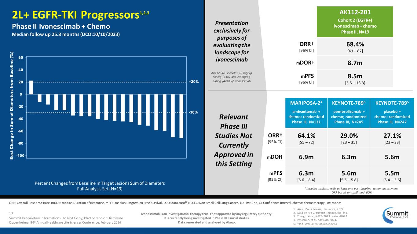 OS: overall survival, DCO: data cutoff NSCLC: Non-small Cell Lung Cancer, 1L: First Line, CI: Confidence Interval, SQ: Squamous, pembro: pembrolizumab, chemo: chemotherapy, NE: Not Established, NR Not Reached, TRAEs: Treatment Related Adverse Events Ivonescimab is an investigational therapy that is not approved by any regulatory authority. It is currently being investigated in Phase III clinical studies. Data generated and analyzed by Akeso. KEYNOTE-407 China Extension4 pembrolizumab + chemo; randomized Phase III, N=65 KEYNOTE-407 Global5 pembrolizumab + chemo; randomized Phase III, N=278 mOS 30.1m [18.2 – NR] 17.2m [14.4 – 19.7) 12m OS 78.5% 64.7% 24m OS 56.9% 36.0% 1. Zhang L, et al., ASCO 2023 poster #9087 2. Akeso Press Release, January 7, 2024 3. Data on File 8. Summit Therapeutics Inc. 4. Cheng, et. al. JTO Clin Res Rep (2021) 5. Novello, et. al. J Clin Oncol 41, no. 11 (2023) 1L Adv/Metastatic Squamous NSCLC1,2,3 Phase II Ivonescimab + Chemo Median follow up 21.0 months (DCO:10/10/2023) 12 Summit Proprietary Information - Do Not Copy, Photograph or Distribute Oppenheimer 34th Annual Healthcare Life Sciences Conference, February 2024 AK112-201 Cohort 1: Squamous only ivonescimab + chemo Phase II, N=63 mOS Not Reached [22.5 – NE] 12m OS 85.6% 24m OS 64.8% AK112-201 includes 10 mg/kg dosing (16%) and 20 mg/kg dosing (84%) of ivonescimab Established Standard of Care Presentation exclusively for purposes of evaluating the landscape for ivonescimab