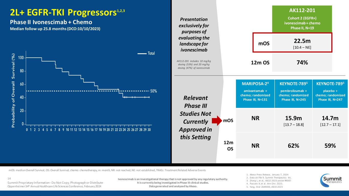 MARIPOSA-24 amivantamab + chemo; randomized Phase III, N=131 KEYNOTE-7895 pembrolizumab + chemo; randomized Phase III, N=245 KEYNOTE-7895 placebo + chemo; randomized Phase III, N=247 ORR† [95% CI] 64.1% [55 – 72] 29.0% [23 – 35] 27.1% [22 – 33] mDOR 6.9m 6.3m 5.6m mPFS [95% CI] 6.3m [5.6 – 8.4] 5.6m [5.5 – 5.8] 5.5m [5.4 – 5.6] AK112-201 Cohort 2 (EGFR+) ivonescimab + chemo Phase II, N=19 ORR† [95% CI] 68.4% [43 – 87] mDOR† 8.7m mPFS [95% CI] 8.5m [5.5 – 13.3] 1. Akeso Press Release, January 7, 2024 2. Data on File 9. Summit Therapeutics Inc. 3. Zhang L, et al., ASCO 2023 poster #9087 4. Passaro A, et al. Ann Onc. 2023. 5. Yang, Oral LBA9000, ASCO 2023 Ivonescimab is an investigational therapy that is not approved by any regulatory authority. It is currently being investigated in Phase III clinical studies. Data generated and analyzed by Akeso. ORR: Overall Response Rate, mDOR: median Duration of Response, mPFS: median Progression Free Survival, DCO: data cutoff, NSCLC: Non-small Cell Lung Cancer, 1L: First Line, CI: Confidence Interval, chemo: chemotherapy, m: month 2L+ EGFR-TKI Progressors1,2,3 Phase II Ivonescimab + Chemo Median follow up 25.8 months (DCO:10/10/2023) Percent Changes from Baseline in Target Lesions Sum of Diameters Full Analysis Set (N=19) † Includes subjects with at least one post-baseline tumor assessment, ORR based on confirmed BOR 13 Summit Proprietary Information - Do Not Copy, Photograph or Distribute Oppenheimer 34th Annual Healthcare Life Sciences Conference, February 2024 AK112-201 includes 10 mg/kg dosing (53%) and 20 mg/kg dosing (47%) of ivonescimab Relevant Phase III Studies Not Currently Approved in this Setting Presentation exclusively for purposes of evaluating the landscape for ivonescimab