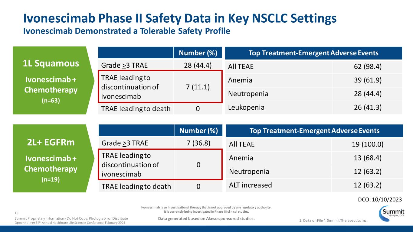MARIPOSA-24 amivantamab + chemo; randomized Phase III, N=131 KEYNOTE-7895 pembrolizumab + chemo; randomized Phase III, N=245 KEYNOTE-7895 placebo + chemo; randomized Phase III, N=247 mOS NR 15.9m [13.7 – 18.8] 14.7m [12.7 – 17.1] 12m OS NR 62% 59% AK112-201 Cohort 2 (EGFR+) ivonescimab + chemo Phase II, N=19 mOS 22.5m [10.4 – NE] 12m OS 74% mOS: median Overall Survival, OS: Overall Survival, chemo: chemotherapy, m: month, NR: not reached, NE: not established, TRAEs: Treatment Related Adverse Events Ivonescimab is an investigational therapy that is not approved by any regulatory authority. It is currently being investigated in Phase III clinical studies. Data generated and analyzed by Akeso. Overall Survival (OS) for EGFR-TKI Progressors (N=19) 2L+ EGFR-TKI Progressors1,2,3 Phase II Ivonescimab + Chemo Median follow up 25.8 months (DCO:10/10/2023) 14 Summit Proprietary Information - Do Not Copy, Photograph or Distribute Oppenheimer 34th Annual Healthcare Life Sciences Conference, February 2024 Relevant Phase III Studies Not Currently Approved in this Setting Presentation exclusively for purposes of evaluating the landscape for ivonescimab 1. Akeso Press Release, January 7, 2024 2. Data on File 9. Summit Therapeutics Inc. 3. Zhang L, et al., ASCO 2023 poster #9087 4. Passaro A, et al. Ann Onc. 2023. 5. Yang, Oral LBA9000, ASCO 2023 AK112-201 includes 10 mg/kg dosing (53%) and 20 mg/kg dosing (47%) of ivonescimab