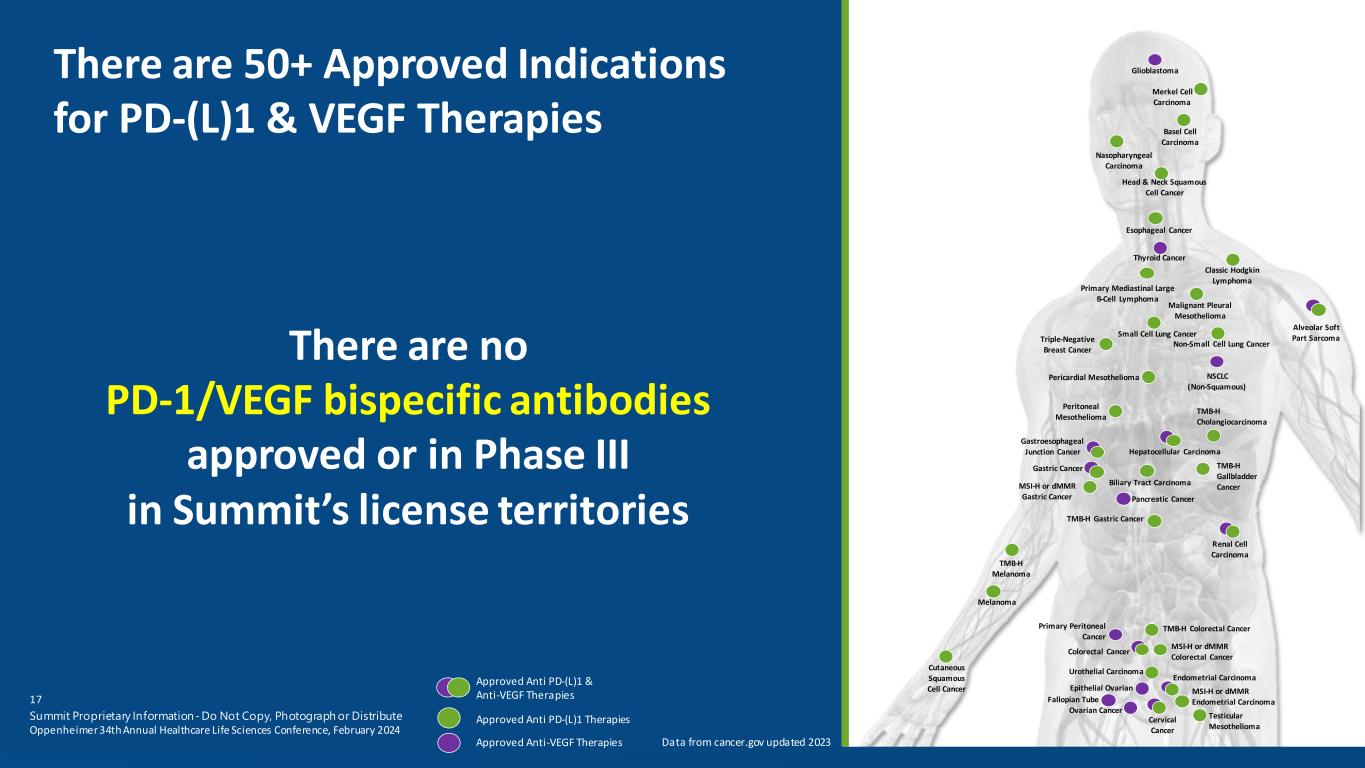 There are no PD-1/VEGF bispecific antibodies approved or in Phase III in Summit’s license territories Approved Anti PD-(L)1 Therapies Approved Anti-VEGF Therapies There are 50+ Approved Indications for PD-(L)1 & VEGF Therapies Data from cancer.gov updated 2023 17 Summit Proprietary Information - Do Not Copy, Photograph or Distribute Oppenheimer 34th Annual Healthcare Life Sciences Conference, February 2024 Primary Peritoneal Cancer Glioblastoma Esophageal Cancer Melanoma Basel Cell Carcinoma Cervical Cancer Biliary Tract Carcinoma Classic Hodgkin Lymphoma Colorectal Cancer Cutaneous Squamous Cell Cancer Endometrial Carcinoma Gastric Cancer Gastroesophageal Junction Cancer Head & Neck Squamous Cell Cancer Hepatocellular Carcinoma Malignant Pleural Mesothelioma Merkel Cell Carcinoma Nasopharyngeal Carcinoma Non-Small Cell Lung Cancer Primary Mediastinal Large B-Cell Lymphoma Renal Cell Carcinoma Small Cell Lung Cancer Urothelial Carcinoma Triple-Negative Breast Cancer NSCLC (Non-Squamous) Ovarian Cancer Pancreatic Cancer Thyroid Cancer MSI-H or dMMR Colorectal Cancer Peritoneal Mesothelioma Pericardial Mesothelioma Testicular Mesothelioma MSI-H or dMMR Endometrial Carcinoma MSI-H or dMMR Gastric Cancer TMB-H Cholangiocarcinoma TMB-H Gallbladder Cancer TMB-H Melanoma TMB-H Colorectal Cancer TMB-H Gastric Cancer Epithelial Ovarian Fallopian Tube Alveolar Soft Part Sarcoma Approved Anti PD-(L)1 & Anti-VEGF Therapies