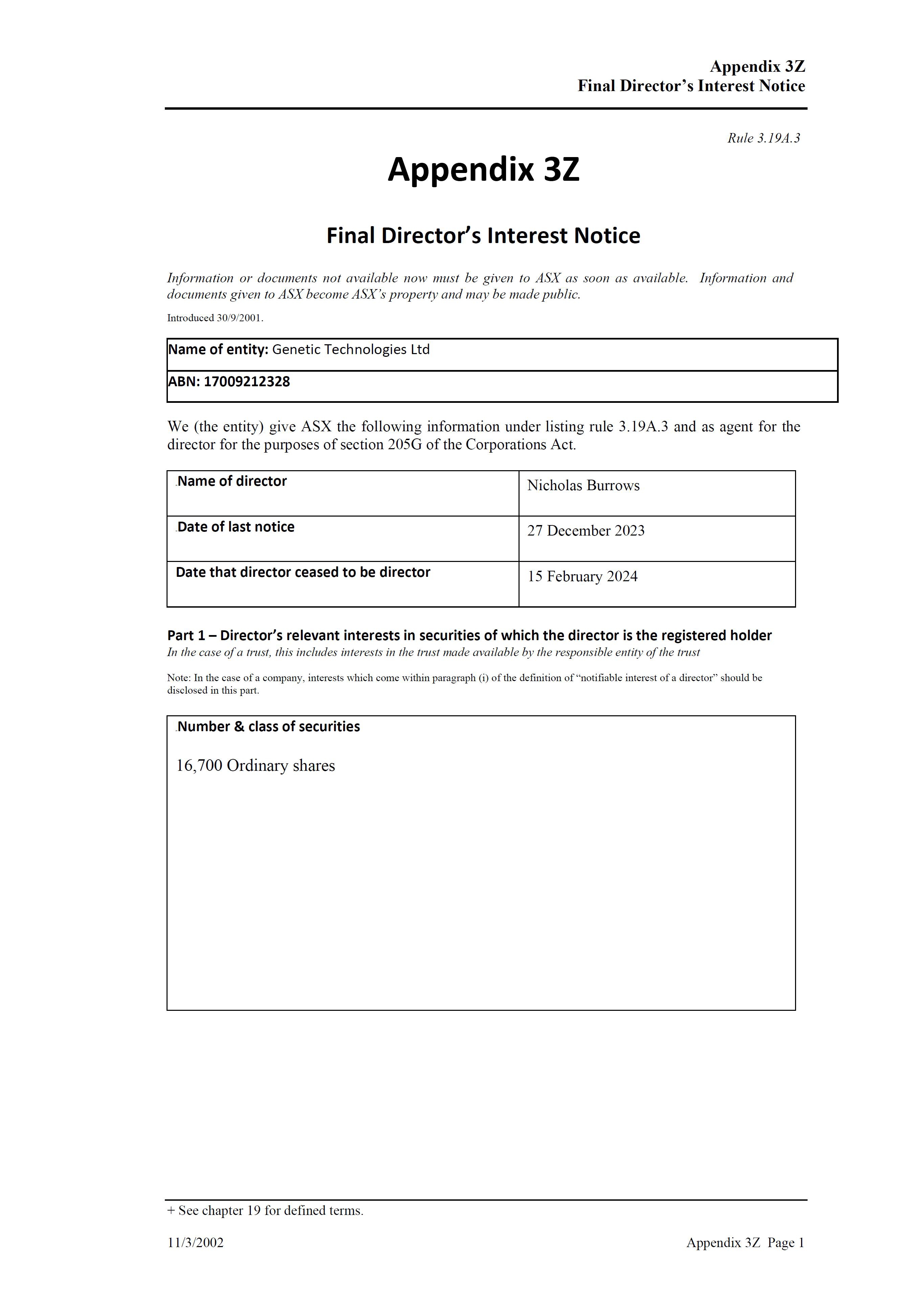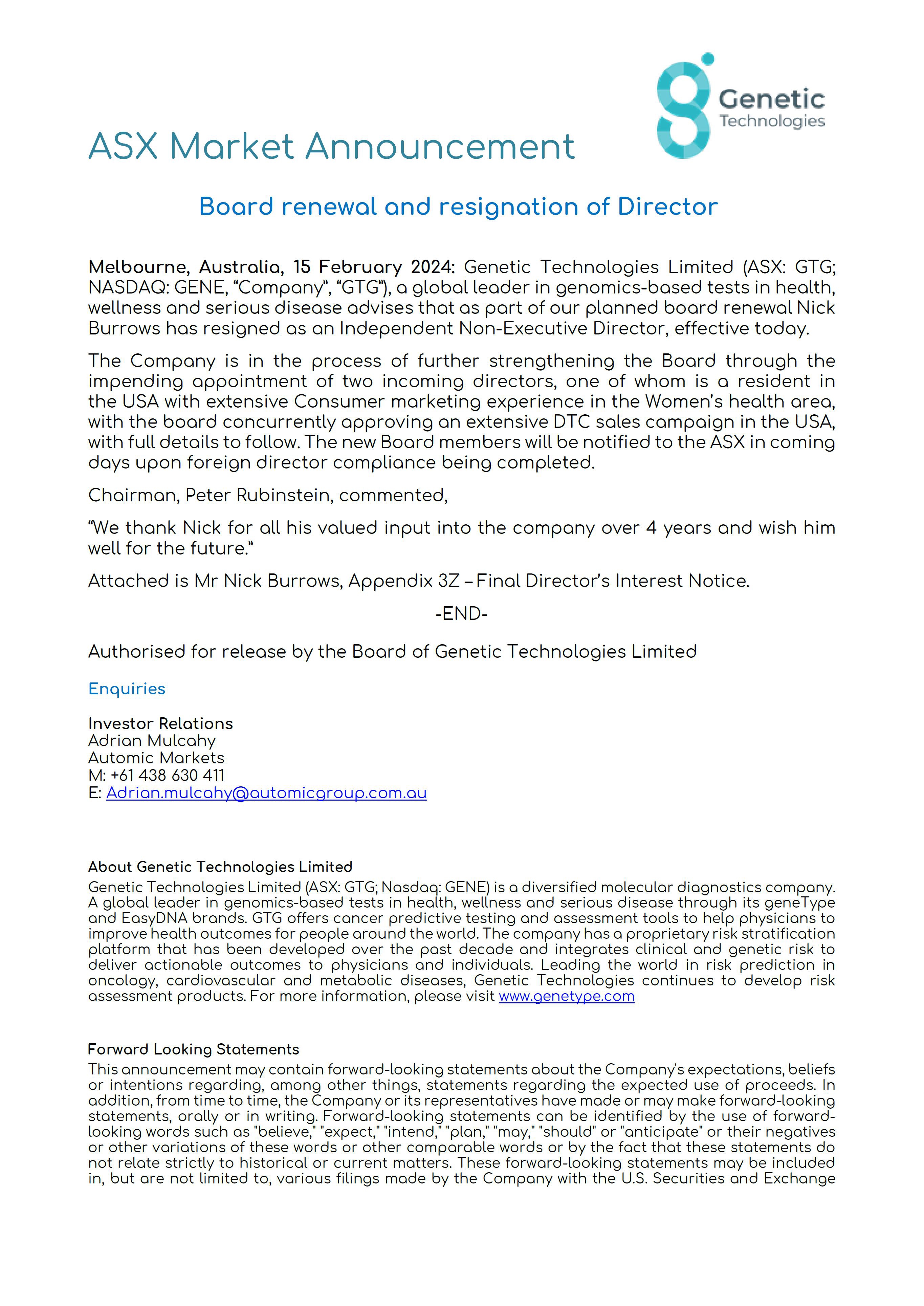 | GENETIC TECHNOLOGIES LIMITED | ||