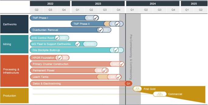 Since commencement of construction, $2.786 billion ($1.95 billion at 70%) of project expenditures has been incurred. The estimated remaining project expenditures, on a 100% basis, to achieve first gold is $179.0 million (± 5%) bringing total project expenditures up to first gold in line with the planned $2.965 billion ($2.08 billion at 70%) on an incurred basis. Post first gold, completion of certain infrastructure and earthworks projects are estimated to $40 million (± 5%).
