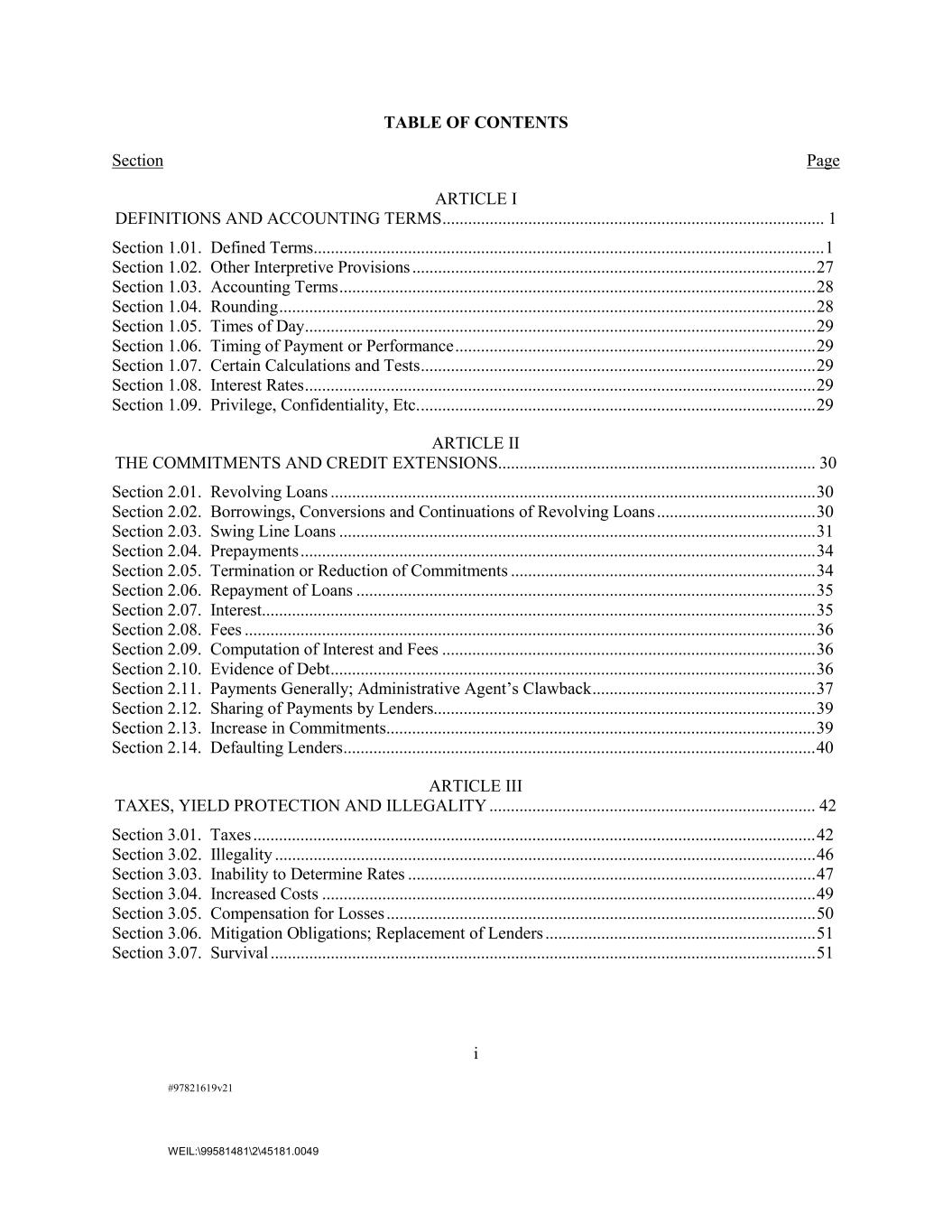 i WEIL:\99581369\2\44393.0003 TABLE OF CONTENTS Section Page ARTICLE I DEFINITIONS AND ACCOUNTING TERMS .......................................................................................... 1 Section 1.01. Defined Terms .................................................................................................................... 1 Section 1.02. Other Interpretive Provisions ............................................................................................ 30 Section 1.03. Accounting Terms. ............................................................................................................ 31 Section 1.04. Rounding ........................................................................................................................... 32 Section 1.05. Times of Day .................................................................................................................... 32 Section 1.06. Timing of Payment or Performance .................................................................................. 32 Section 1.07. Certain Calculations and Tests.......................................................................................... 32 Section 1.08. Interest Rates ..................................................................................................................... 32 Section 1.09. Privilege, Confidentiality, Etc........................................................................................... 32 ARTICLE II THE COMMITMENTS AND CREDIT EXTENSIONS ........................................................................... 33 Section 2.01. Revolving Loans ............................................................................................................... 33 Section 2.02. Borrowings, Conversions and Continuations of Revolving Loans. .................................. 33 Section 2.03. Swing Line Loans. ............................................................................................................ 34 Section 2.04. Prepayments. ..................................................................................................................... 37 Section 2.05. Termination or Reduction of Commitments. .................................................................... 38 Section 2.06. Repayment of Loans. ........................................................................................................ 38 Section 2.07. Interest .............................................................................................................................. 38 Section 2.08. Fees. .................................................................................................................................. 39 Section 2.09. Computation of Interest and Fees ..................................................................................... 39 Section 2.10. Evidence of Debt. ............................................................................................................. 40 Section 2.11. Payments Generally; Administrative Agent’s Clawback. ................................................. 40 Section 2.12. Sharing of Payments by Lenders ...................................................................................... 42 Section 2.13. Increase in Commitments. ................................................................................................ 43 Section 2.14. Defaulting Lenders. .......................................................................................................... 44 Section 2.15. Letters of Credit. ............................................................................................................... 46 ARTICLE III TAXES, YIELD PROTECTION AND ILLEGALITY .............................................................................. 54 Section 3.01. Taxes. ................................................................................................................................ 54 Section 3.02. Illegality ............................................................................................................................ 58 Section 3.03. Inability to Determine Rates. ............................................................................................ 59 Section 3.04. Increased Costs. ................................................................................................................ 61 Section 3.05. Compensation for Losses .................................................................................................. 62 Section 3.06. Mitigation Obligations; Replacement of Lenders. ............................................................ 63 Section 3.07. Survival ............................................................................................................................. 63 ARTICLE IV CONDITIONS PRECEDENT TO CREDIT EXTENSIONS ..................................................................... 63 Section 4.01. Conditions to Effective Date ............................................................................................. 63