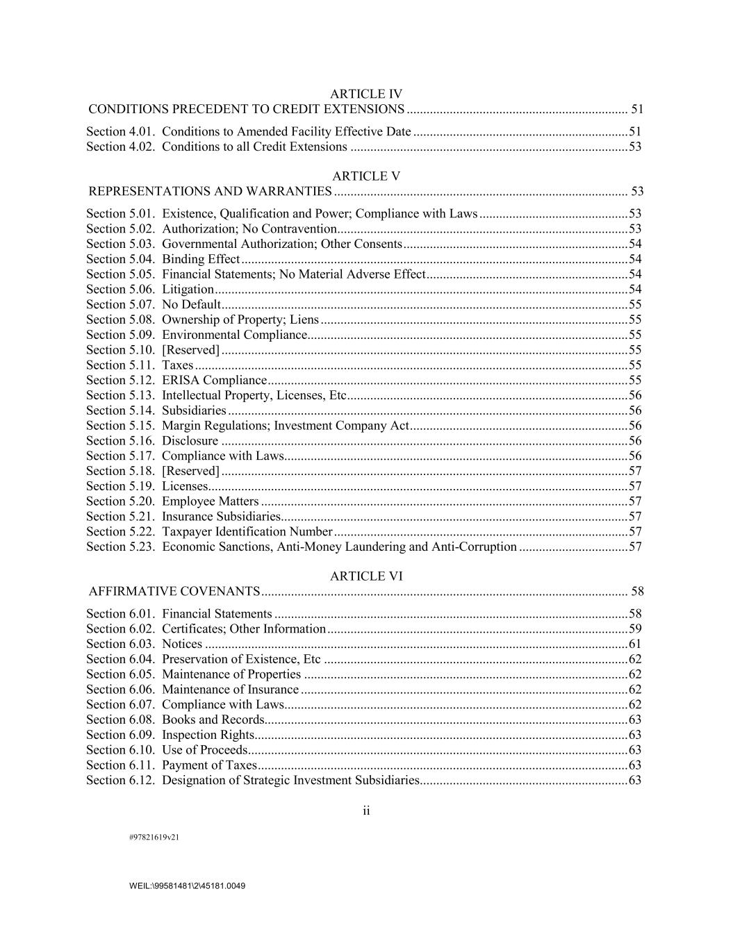 ii WEIL:\99581369\2\44393.0003 Section 4.02. Conditions to all Credit Extensions .................................................................................. 65 ARTICLE V REPRESENTATIONS AND WARRANTIES ........................................................................................... 66 Section 5.01. Existence, Qualification and Power; Compliance with Laws ........................................... 66 Section 5.02. Authorization; No Contravention ..................................................................................... 66 Section 5.03. Governmental Authorization; Other Consents .................................................................. 66 Section 5.04. Binding Effect ................................................................................................................... 66 Section 5.05. Financial Statements; No Material Adverse Effect........................................................... 66 Section 5.06. Litigation ........................................................................................................................... 67 Section 5.07. No Default......................................................................................................................... 67 Section 5.08. Ownership of Property; Liens ........................................................................................... 67 Section 5.09. Environmental Compliance .............................................................................................. 67 Section 5.10. [Reserved]. ........................................................................................................................ 68 Section 5.11. Taxes ................................................................................................................................. 68 Section 5.12. ERISA Compliance ........................................................................................................... 68 Section 5.13. Intellectual Property, Licenses, Etc .................................................................................. 68 Section 5.14. Subsidiaries ....................................................................................................................... 69 Section 5.15. Margin Regulations; Investment Company Act................................................................ 69 Section 5.16. Disclosure ......................................................................................................................... 69 Section 5.17. Compliance with Laws ..................................................................................................... 69 Section 5.18. [Reserved]. ........................................................................................................................ 69 Section 5.19. Licenses ............................................................................................................................ 69 Section 5.20. Employee Matters ............................................................................................................. 69 Section 5.21. Insurance Subsidiaries ...................................................................................................... 70 Section 5.22. Taxpayer Identification Number ....................................................................................... 70 Section 5.23. Economic Sanctions, Anti-Money Laundering and Anti-Corruption. .............................. 70 ARTICLE VI AFFIRMATIVE COVENANTS................................................................................................................. 71 Section 6.01. Financial Statements ......................................................................................................... 71 Section 6.02. Certificates; Other Information ......................................................................................... 72 Section 6.03. Notices .............................................................................................................................. 74 Section 6.04. Preservation of Existence, Etc .......................................................................................... 75 Section 6.05. Maintenance of Properties ................................................................................................ 75 Section 6.06. Maintenance of Insurance ................................................................................................. 75 Section 6.07. Compliance with Laws ..................................................................................................... 75 Section 6.08. Books and Records ........................................................................................................... 75 Section 6.09. Inspection Rights .............................................................................................................. 75 Section 6.10. Use of Proceeds ................................................................................................................ 76 Section 6.11. Payment of Taxes .............................................................................................................. 76 Section 6.12. Designation of Strategic Investment Subsidiaries ............................................................ 76 ARTICLE VII NEGATIVE COVENANTS ....................................................................................................................... 76 Section 7.01. Liens ................................................................................................................................. 76 Section 7.02. Consolidations, Mergers and Certain Other Fundamental Changes ................................. 78