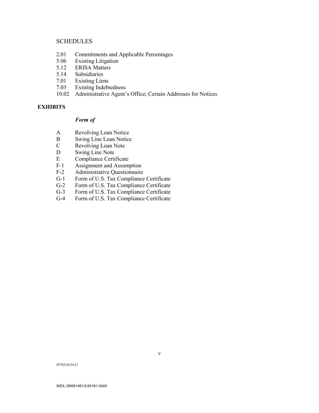 v WEIL:\99581369\2\44393.0003 SCHEDULES 2.01 Commitments and Applicable Percentages 5.06 Existing Litigation 5.12 ERISA Matters 5.14 Subsidiaries 7.01 Existing Liens 7.04 Existing Indebtedness 7.05 Affiliate Transactions 10.02 Administrative Agent’s Office; Certain Addresses for Notices EXHIBITS Form of A Revolving Loan Notice B Swing Line Loan Notice C Revolving Loan Note D Swing Line Note E Compliance Certificate F-1 Assignment and Assumption F-2 Administrative Questionnaire G-1 Form of U.S. Tax Compliance Certificate G-2 Form of U.S. Tax Compliance Certificate G-3 Form of U.S. Tax Compliance Certificate G-4 Form of U.S. Tax Compliance Certificate H Guaranty Supplement