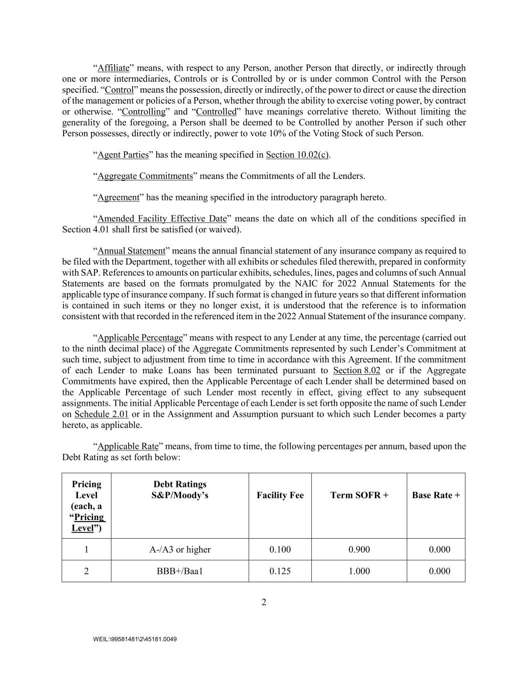 2 WEIL:\99581369\2\44393.0003 “Affiliate” means, with respect to any Person, another Person that directly, or indirectly through one or more intermediaries, Controls or is Controlled by or is under common Control with the Person specified. “Control” means the possession, directly or indirectly, of the power to direct or cause the direction of the management or policies of a Person, whether through the ability to exercise voting power, by contract or otherwise. “Controlling” and “Controlled” have meanings correlative thereto. Without limiting the generality of the foregoing, a Person shall be deemed to be Controlled by another Person if such other Person possesses, directly or indirectly, power to vote 10% of the Voting Stock of such Person. “Agent Parties” has the meaning specified in Section 10.02(c). “Aggregate Commitments” means the Commitments of all the Lenders. “Agreement” has the meaning specified in the introductory paragraph hereto. “Annual Statement” means the annual financial statement of any insurance company as required to be filed with the Department, together with all exhibits or schedules filed therewith, prepared in conformity with SAP. References to amounts on particular exhibits, schedules, lines, pages and columns of such Annual Statements are based on the formats promulgated by the NAIC for 2022 Annual Statements for the applicable type of insurance company. If such format is changed in future years so that different information is contained in such items or they no longer exist, it is understood that the reference is to information consistent with that recorded in the referenced item in the 2022 Annual Statement of the insurance company. “Applicable Percentage” means with respect to any Lender at any time, the percentage (carried out to the ninth decimal place) of the Aggregate Commitments represented by such Lender’s Commitment at such time, subject to adjustment from time to time in accordance with this Agreement. If the commitment of each Lender to make Loans has been terminated pursuant to Section 8.02 or if the Aggregate Commitments have expired, then the Applicable Percentage of each Lender shall be determined based on the Applicable Percentage of such Lender most recently in effect, giving effect to any subsequent assignments. The initial Applicable Percentage of each Lender is set forth opposite the name of such Lender on Schedule 2.01 or in the Assignment and Assumption pursuant to which such Lender becomes a party hereto, as applicable. “Applicable Rate” means, from time to time, the following percentages per annum, based upon the Debt Rating as set forth below: Pricing Level Debt Ratings S&P/Moody’s/Fitch Facility Fee Term SOFR + Base Rate + 1 ≥BBB+/Baa1/BBB+ 0.20 1.30 0.30 2 BBB/Baa2/BBB 0.25 1.50 0.50 3 BBB-/Baa3/BBB- 0.35 1.65 0.65 4 < BB+ / Ba1/BB+ 0.45 1.80 0.80
