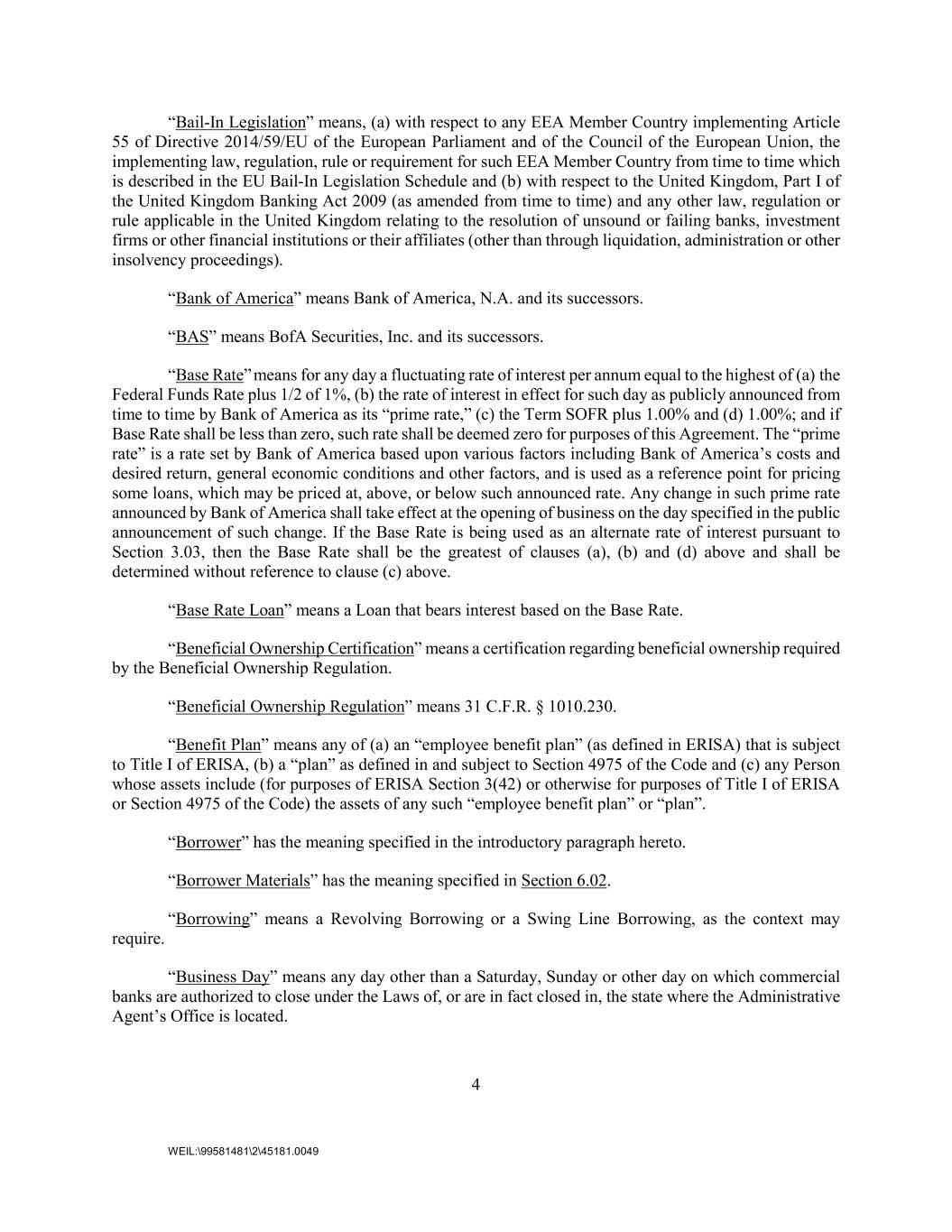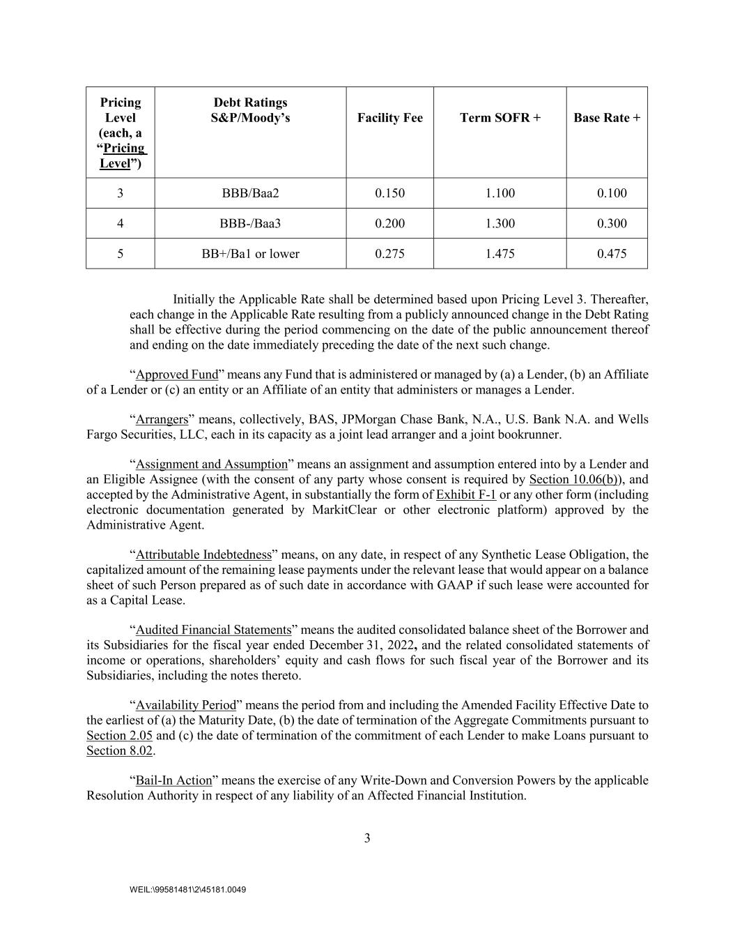 3 WEIL:\99581369\2\44393.0003 Initially the Applicable Rate shall be determined based upon Pricing Level 3. Thereafter, each change in the Applicable Rate resulting from a publicly announced change in the Debt Rating shall be effective during the period commencing on the date of the public announcement thereof and ending on the date immediately preceding the date of the next such change. “Approved Fund” means any Fund that is administered or managed by (a) a Lender, (b) an Affiliate of a Lender or (c) an entity or an Affiliate of an entity that administers or manages a Lender. “Arrangers” means, collectively, BAS, JPMorgan Chase Bank, N.A., RBC Capital Markets, LLC and Wells Fargo Securities, LLC, each in its capacity as a joint lead arranger and a joint bookrunner. “Assignment and Assumption” means an assignment and assumption entered into by a Lender and an Eligible Assignee (with the consent of any party whose consent is required by Section 10.06(b)), and accepted by the Administrative Agent, in substantially the form of Exhibit F-1 or any other form (including electronic documentation generated by MarkitClear or other electronic platform) approved by the Administrative Agent. “Attributable Indebtedness” means, on any date, in respect of any Synthetic Lease Obligation, the capitalized amount of the remaining lease payments under the relevant lease that would appear on a balance sheet of such Person prepared as of such date in accordance with GAAP if such lease were accounted for as a Capital Lease. “Audited Financial Statements” means the audited consolidated balance sheet of the Borrower and its Subsidiaries for the fiscal year ended December 31, 2022, and the related consolidated statements of income or operations, shareholders’ equity and cash flows for such fiscal year of the Borrower and its Subsidiaries, including the notes thereto. “Auto-Renewal Letter of Credit” has the meaning specified in Section 2.15(b)(iii). “Availability Period” means the period from and including the Effective Date to the earliest of (a) the Maturity Date, (b) the date of termination of the Aggregate Commitments pursuant to Section 2.05 and (c) the date of termination of the commitment of each Lender to make Loans pursuant to Section 8.02. “Bail-In Action” means the exercise of any Write-Down and Conversion Powers by the applicable Resolution Authority in respect of any liability of an Affected Financial Institution. “Bail-In Legislation” means, (a) with respect to any EEA Member Country implementing Article 55 of Directive 2014/59/EU of the European Parliament and of the Council of the European Union, the implementing law, regulation, rule or requirement for such EEA Member Country from time to time which is described in the EU Bail-In Legislation Schedule and (b) with respect to the United Kingdom, Part I of the United Kingdom Banking Act 2009 (as amended from time to time) and any other law, regulation or rule applicable in the United Kingdom relating to the resolution of unsound or failing banks, investment firms or other financial institutions or their affiliates (other than through liquidation, administration or other insolvency proceedings). “Bank of America” means Bank of America, N.A. and its successors. “BAS” means BofA Securities, Inc. and its successors.
