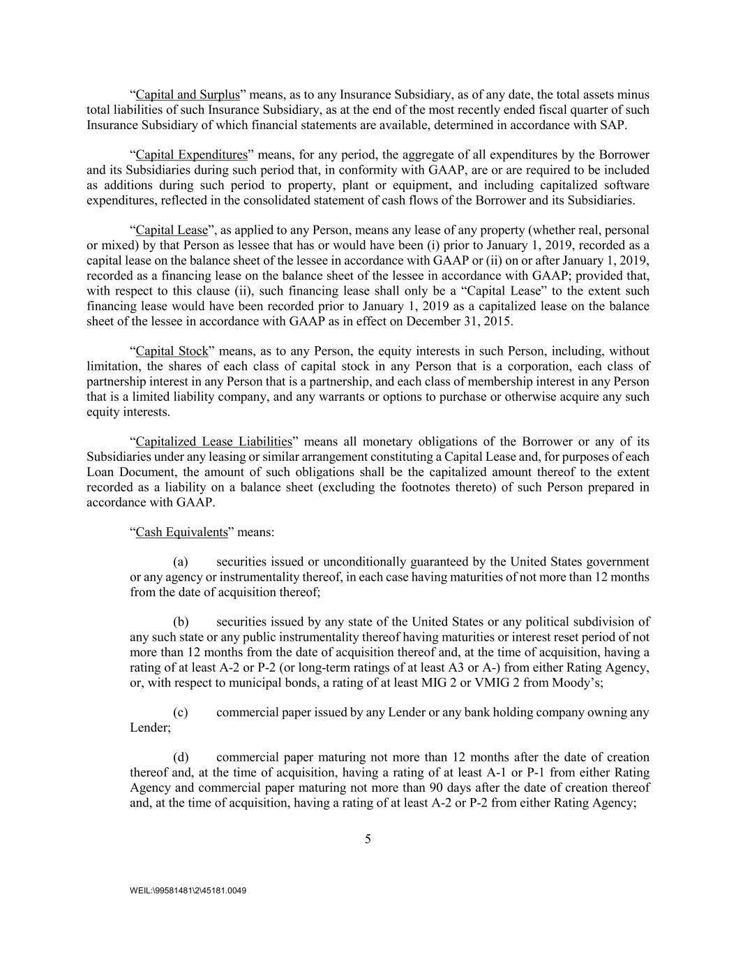 4 WEIL:\99581369\2\44393.0003 “Base Rate” means for any day a fluctuating rate of interest per annum equal to the highest of (a) the Federal Funds Rate plus 1/2 of 1%, (b) the rate of interest in effect for such day as publicly announced from time to time by Bank of America as its “prime rate,” (c) the Term SOFR plus 1.00% and (d) 1.00%; and if Base Rate shall be less than zero, such rate shall be deemed zero for purposes of this Agreement. The “prime rate” is a rate set by Bank of America based upon various factors including Bank of America’s costs and desired return, general economic conditions and other factors, and is used as a reference point for pricing some loans, which may be priced at, above, or below such announced rate. Any change in such prime rate announced by Bank of America shall take effect at the opening of business on the day specified in the public announcement of such change. If the Base Rate is being used as an alternate rate of interest pursuant to Section 3.03, then the Base Rate shall be the greatest of clauses (a), (b) and (d) above and shall be determined without reference to clause (c) above. “Base Rate Loan” means a Loan that bears interest based on the Base Rate. “Beneficial Ownership Certification” means a certification regarding beneficial ownership required by the Beneficial Ownership Regulation. “Beneficial Ownership Regulation” means 31 C.F.R. § 1010.230. “Benefit Plan” means any of (a) an “employee benefit plan” (as defined in ERISA) that is subject to Title I of ERISA, (b) a “plan” as defined in and subject to Section 4975 of the Code and (c) any Person whose assets include (for purposes of ERISA Section 3(42) or otherwise for purposes of Title I of ERISA or Section 4975 of the Code) the assets of any such “employee benefit plan” or “plan”. “Borrower” has the meaning specified in the introductory paragraph hereto. “Borrower Materials” has the meaning specified in Section 6.02. “Borrowing” means a Revolving Borrowing or a Swing Line Borrowing, as the context may require. “Business Day” means any day other than a Saturday, Sunday or other day on which commercial banks are authorized to close under the Laws of, or are in fact closed in, the state where the Administrative Agent’s Office is located. “Capital and Surplus” means, as to any Insurance Subsidiary, as of any date, the total assets minus total liabilities of such Insurance Subsidiary, as at the end of the most recently ended fiscal quarter of such Insurance Subsidiary of which financial statements are available, determined in accordance with SAP. “Capital Lease”, as applied to any Person, means any lease of any property (whether real, personal or mixed) by that Person as lessee that has or would have been (i) prior to January 1, 2019, recorded as a capital lease on the balance sheet of the lessee in accordance with GAAP or (ii) on or after January 1, 2019, recorded as a financing lease on the balance sheet of the lessee in accordance with GAAP; provided that, with respect to this clause (ii), such financing lease shall only be a “Capital Lease” to the extent such financing lease would have been recorded prior to January 1, 2019 as a capitalized lease on the balance sheet of the lessee in accordance with GAAP as in effect on December 31, 2015. “Capital Stock” means, as to any Person, the equity interests in such Person, including, without limitation, the shares of each class of capital stock in any Person that is a corporation, each class of