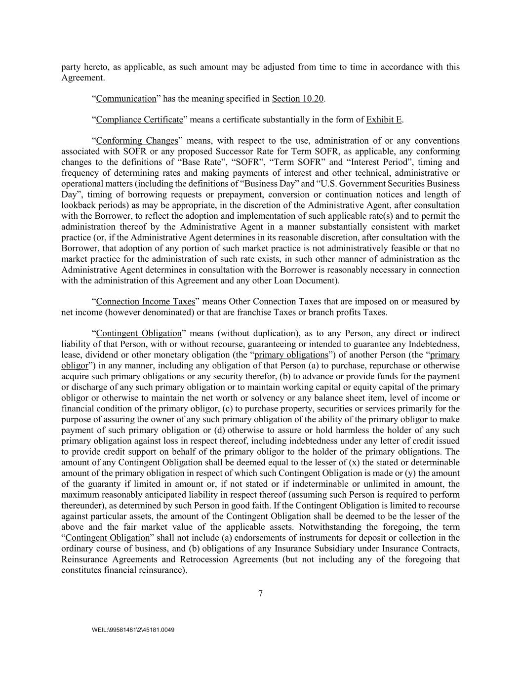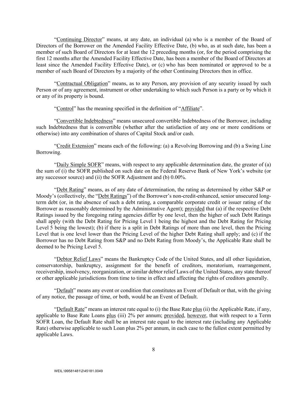 7 WEIL:\99581369\2\44393.0003 “Code” means the Internal Revenue Code of 1986, as amended. “Commitment” means, as to each Lender, its obligation to (a) make Revolving Loans to the Borrower pursuant to Section 2.01, and (b) purchase participations in Swing Line Loans and Letters of Credit, in an aggregate principal amount at any one time outstanding not to exceed the amount set forth opposite such Lender’s name on Schedule 2.01 or in the Assignment and Assumption pursuant to which such Lender becomes a party hereto, as applicable, as such amount may be adjusted from time to time in accordance with this Agreement. “Committed L/C Issuer” means any Lender or Affiliate thereof that, after the Effective Date, provides an L/C Commitment, in each case in its capacity as issuer of Letters of Credit hereunder. As of the Effective Date, there are no Committed L/C Issuers. “Communication” has the meaning specified in Section 10.20. “Compliance Certificate” means a certificate substantially in the form of Exhibit E. “Conforming Changes” means, with respect to the use, administration of or any conventions associated with SOFR or any proposed Successor Rate for Term SOFR, as applicable, any conforming changes to the definitions of “Base Rate”, “SOFR”, “Term SOFR” and “Interest Period”, timing and frequency of determining rates and making payments of interest and other technical, administrative or operational matters (including the definitions of “Business Day” and “U.S. Government Securities Business Day”, timing of borrowing requests or prepayment, conversion or continuation notices and length of lookback periods) as may be appropriate, in the discretion of the Administrative Agent, after consultation with the Borrower, to reflect the adoption and implementation of such applicable rate(s) and to permit the administration thereof by the Administrative Agent in a manner substantially consistent with market practice (or, if the Administrative Agent determines in its reasonable discretion, after consultation with the Borrower, that adoption of any portion of such market practice is not administratively feasible or that no market practice for the administration of such rate exists, in such other manner of administration as the Administrative Agent determines in consultation with the Borrower is reasonably necessary in connection with the administration of this Agreement and any other Loan Document). “Connection Income Taxes” means Other Connection Taxes that are imposed on or measured by net income (however denominated) or that are franchise Taxes or branch profits Taxes. “Contingent Obligation” means (without duplication), as to any Person, any direct or indirect liability of that Person, with or without recourse, guaranteeing or intended to guarantee any Indebtedness, lease, dividend or other monetary obligation (the “primary obligations”) of another Person (the “primary obligor”) in any manner, including any obligation of that Person (a) to purchase, repurchase or otherwise acquire such primary obligations or any security therefor, (b) to advance or provide funds for the payment or discharge of any such primary obligation or to maintain working capital or equity capital of the primary obligor or otherwise to maintain the net worth or solvency or any balance sheet item, level of income or financial condition of the primary obligor, (c) to purchase property, securities or services primarily for the purpose of assuring the owner of any such primary obligation of the ability of the primary obligor to make payment of such primary obligation or (d) otherwise to assure or hold harmless the holder of any such primary obligation against loss in respect thereof, including indebtedness under any letter of credit issued to provide credit support on behalf of the primary obligor to the holder of the primary obligations. The amount of any Contingent Obligation shall be deemed equal to the lesser of (x) the stated or determinable amount of the primary obligation in respect of which such Contingent Obligation is made or (y) the amount