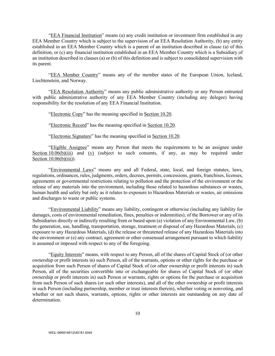 10 WEIL:\99581369\2\44393.0003 “Discretionary L/C Issuer” means (a) the Administrative Agent and (b) any Lender or Affiliate thereof that, after the Effective Date, agrees in writing with the Borrower and the Administrative Agent to act as a Discretionary L/C Issuer, in each case in its capacity as issuer of Letters of Credit hereunder. Discretionary L/C Issuers, in their capacity as such, shall not have any L/C Commitment. “Dollar” and “$” mean lawful money of the United States. “Domestic Subsidiary” means any Subsidiary of the Borrower that is organized under the laws of the United States, any state thereof or the District of Columbia. “EEA Financial Institution” means (a) any credit institution or investment firm established in any EEA Member Country which is subject to the supervision of an EEA Resolution Authority, (b) any entity established in an EEA Member Country which is a parent of an institution described in clause (a) of this definition, or (c) any financial institution established in an EEA Member Country which is a Subsidiary of an institution described in clauses (a) or (b) of this definition and is subject to consolidated supervision with its parent. “EEA Member Country” means any of the member states of the European Union, Iceland, Liechtenstein, and Norway. “EEA Resolution Authority” means any public administrative authority or any Person entrusted with public administrative authority of any EEA Member Country (including any delegee) having responsibility for the resolution of any EEA Financial Institution. “Effective Date” means the date on which all of the conditions specified in Section 4.01 shall first be satisfied (or waived). “Electronic Copy” has the meaning specified in Section 10.20. “Electronic Record” has the meaning specified in Section 10.20. “Electronic Signature” has the meaning specified in Section 10.20. “Eligible Assignee” means any Person that meets the requirements to be an assignee under Section 10.06(b)(iii) and (v) (subject to such consents, if any, as may be required under Section 10.06(b)(iii)). “Environmental Laws” means any and all Federal, state, local, and foreign statutes, laws, regulations, ordinances, rules, judgments, orders, decrees, permits, concessions, grants, franchises, licenses, agreements or governmental restrictions relating to pollution and the protection of the environment or the release of any materials into the environment, including those related to hazardous substances or wastes, human health and safety but only as it relates to exposure to Hazardous Materials or wastes, air emissions and discharges to waste or public systems. “Environmental Liability” means any liability, contingent or otherwise (including any liability for damages, costs of environmental remediation, fines, penalties or indemnities), of the Borrower or any of its Subsidiaries directly or indirectly resulting from or based upon (a) violation of any Environmental Law, (b) the generation, use, handling, transportation, storage, treatment or disposal of any Hazardous Materials, (c) exposure to any Hazardous Materials, (d) the release or threatened release of any Hazardous Materials into