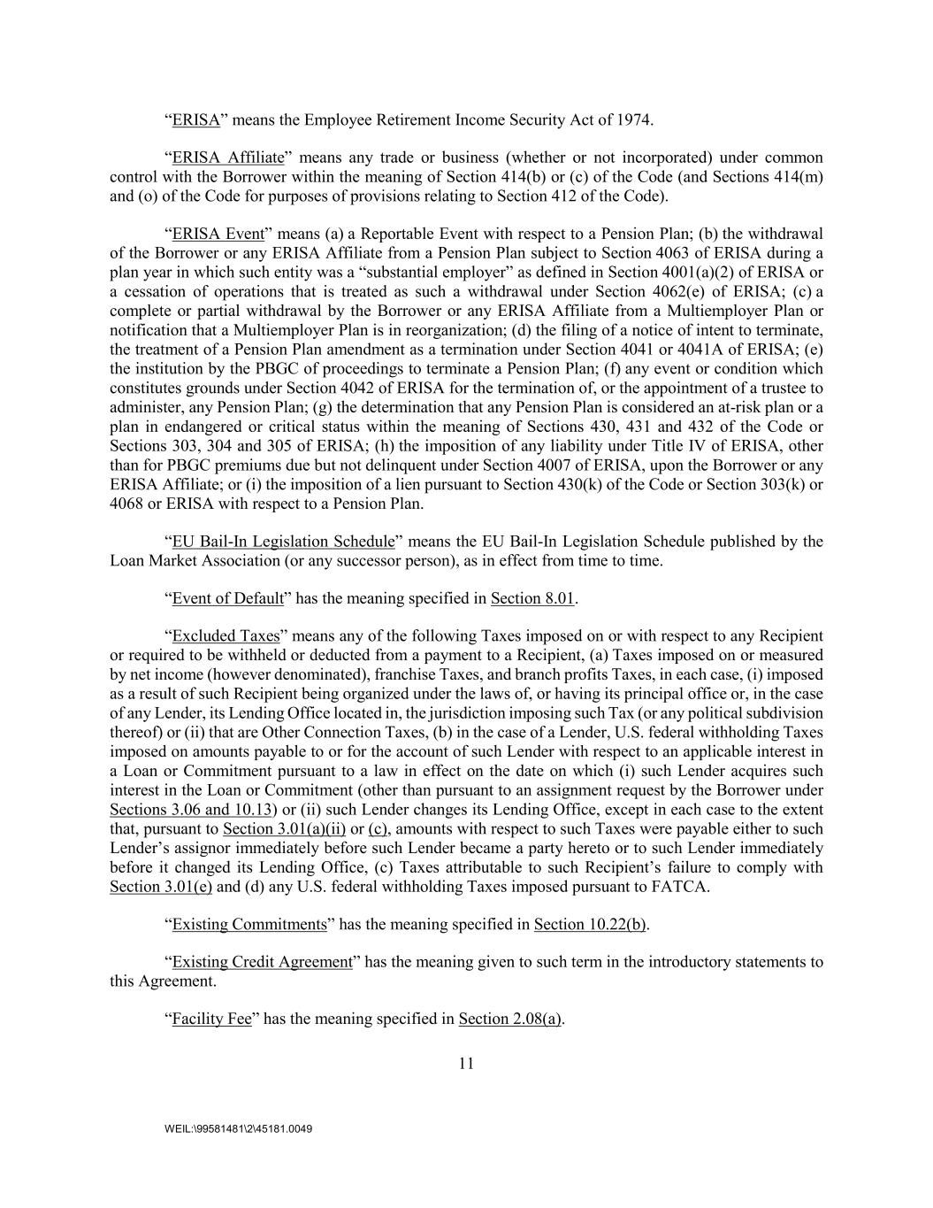 11 WEIL:\99581369\2\44393.0003 the environment or (e) any contract, agreement or other consensual arrangement pursuant to which liability is assumed or imposed with respect to any of the foregoing. “Equity Interests” means, with respect to any Person, all of the shares of Capital Stock of (or other ownership or profit interests in) such Person, all of the warrants, options or other rights for the purchase or acquisition from such Person of shares of Capital Stock of (or other ownership or profit interests in) such Person, all of the securities convertible into or exchangeable for shares of Capital Stock of (or other ownership or profit interests in) such Person or warrants, rights or options for the purchase or acquisition from such Person of such shares (or such other interests), and all of the other ownership or profit interests in such Person (including partnership, member or trust interests therein), whether voting or nonvoting, and whether or not such shares, warrants, options, rights or other interests are outstanding on any date of determination. “ERISA” means the Employee Retirement Income Security Act of 1974. “ERISA Affiliate” means any trade or business (whether or not incorporated) under common control with the Borrower within the meaning of Section 414(b) or (c) of the Code (and Sections 414(m) and (o) of the Code for purposes of provisions relating to Section 412 of the Code). “ERISA Event” means (a) a Reportable Event with respect to a Pension Plan; (b) the withdrawal of the Borrower or any ERISA Affiliate from a Pension Plan subject to Section 4063 of ERISA during a plan year in which such entity was a “substantial employer” as defined in Section 4001(a)(2) of ERISA or a cessation of operations that is treated as such a withdrawal under Section 4062(e) of ERISA; (c) a complete or partial withdrawal by the Borrower or any ERISA Affiliate from a Multiemployer Plan or notification that a Multiemployer Plan is in reorganization; (d) the filing of a notice of intent to terminate, the treatment of a Pension Plan amendment as a termination under Section 4041 or 4041A of ERISA; (e) the institution by the PBGC of proceedings to terminate a Pension Plan; (f) any event or condition which constitutes grounds under Section 4042 of ERISA for the termination of, or the appointment of a trustee to administer, any Pension Plan; (g) the determination that any Pension Plan is considered an at-risk plan or a plan in endangered or critical status within the meaning of Sections 430, 431 and 432 of the Code or Sections 303, 304 and 305 of ERISA; (h) the imposition of any liability under Title IV of ERISA, other than for PBGC premiums due but not delinquent under Section 4007 of ERISA, upon the Borrower or any ERISA Affiliate; or (i) the imposition of a lien pursuant to Section 430(k) of the Code or Section 303(k) or 4068 or ERISA with respect to a Pension Plan. “EU Bail-In Legislation Schedule” means the EU Bail-In Legislation Schedule published by the Loan Market Association (or any successor person), as in effect from time to time. “Event of Default” has the meaning specified in Section 8.01. “Exchange Act” means the Securities Exchange Act of 1934, as amended, and the rules and regulations of the SEC promulgated thereunder. “Excluded Taxes” means any of the following Taxes imposed on or with respect to any Recipient or required to be withheld or deducted from a payment to a Recipient, (a) Taxes imposed on or measured by net income (however denominated), franchise Taxes, and branch profits Taxes, in each case, (i) imposed as a result of such Recipient being organized under the laws of, or having its principal office or, in the case of any Lender, its Lending Office located in, the jurisdiction imposing such Tax (or any political subdivision thereof) or (ii) that are Other Connection Taxes, (b) in the case of a Lender, U.S. federal withholding Taxes