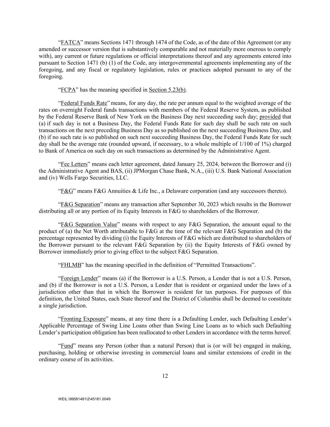 12 WEIL:\99581369\2\44393.0003 imposed on amounts payable to or for the account of such Lender with respect to an applicable interest in a Loan or Commitment pursuant to a law in effect on the date on which (i) such Lender acquires such interest in the Loan or Commitment (other than pursuant to an assignment request by the Borrower under Sections 3.06 and 10.13) or (ii) such Lender changes its Lending Office, except in each case to the extent that, pursuant to Section 3.01(a)(ii) or (c), amounts with respect to such Taxes were payable either to such Lender’s assignor immediately before such Lender became a party hereto or to such Lender immediately before it changed its Lending Office, (c) Taxes attributable to such Recipient’s failure to comply with Section 3.01(e) and (d) any U.S. federal withholding Taxes imposed pursuant to FATCA. “Existing Commitments” has the meaning specified in Section 10.23(b). “Existing Credit Agreement” has the meaning given to such term in the introductory paragraph hereto. “Facility Fee” has the meaning specified in Section 2.08(a). “FATCA” means Sections 1471 through 1474 of the Code, as of the date of this Agreement (or any amended or successor version that is substantively comparable and not materially more onerous to comply with), any current or future regulations or official interpretations thereof and any agreements entered into pursuant to Section 1471 (b) (1) of the Code, any intergovernmental agreements implementing any of the foregoing, and any fiscal or regulatory legislation, rules or practices adopted pursuant to any of the foregoing. “FCPA” has the meaning specified in Section 5.23(b). “Federal Funds Rate” means, for any day, the rate per annum equal to the weighted average of the rates on overnight Federal funds transactions with members of the Federal Reserve System, as published by the Federal Reserve Bank of New York on the Business Day next succeeding such day; provided that (a) if such day is not a Business Day, the Federal Funds Rate for such day shall be such rate on such transactions on the next preceding Business Day as so published on the next succeeding Business Day, and (b) if no such rate is so published on such next succeeding Business Day, the Federal Funds Rate for such day shall be the average rate (rounded upward, if necessary, to a whole multiple of 1/100 of 1%) charged to Bank of America on such day on such transactions as determined by the Administrative Agent. “Fee Letters” means each letter agreement, dated January 25, 2024, between the Borrower and (i) the Administrative Agent and BAS, (ii) JPMorgan Chase Bank, N.A., (iii) Royal Bank of Canada and RBC Capital Markets, LLC and (iv) Wells Fargo Securities, LLC and Wells Fargo Bank, National Association. “FGL Holdings 2025 Senior Notes” means those certain 5.50% Senior Notes due 2025 issued by Fidelity & Guaranty Life Holdings, Inc. in an original aggregate principal amount of $550,000,000, pursuant to that certain Indenture and that certain First Supplemental Indenture, each dated as of April 20, 2018. “FGLIC” means Fidelity & Guaranty Life Insurance Company, an Iowa corporation. “FHLMB” has the meaning specified in the definition of “Permitted Transactions”. “Fitch” means Fitch Ratings, Inc. and any successor thereto.