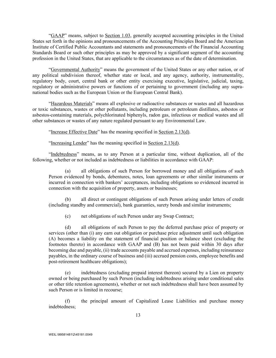 13 WEIL:\99581369\2\44393.0003 “Foreign Lender” means (a) if the Borrower is a U.S. Person, a Lender that is not a U.S. Person, and (b) if the Borrower is not a U.S. Person, a Lender that is resident or organized under the laws of a jurisdiction other than that in which the Borrower is resident for tax purposes. For purposes of this definition, the United States, each State thereof and the District of Columbia shall be deemed to constitute a single jurisdiction. “Foreign Subsidiary” means any Subsidiary that is not a Domestic Subsidiary. “Fronting Exposure” means, at any time there is a Defaulting Lender, with respect to any Swing Line Loans, such Defaulting Lender’s Applicable Percentage of Swing Line Loans other than Swing Line Loans as to which such Defaulting Lender’s participation obligation has been reallocated to other Lenders in accordance with the terms hereof and, with respect to any L/C Obligations, such Defaulting Lender’s Applicable Percentage of L/C Obligations other than L/C Obligations as to which such Defaulting Lender’s participation obligation has been reallocated to other Lenders in accordance with the terms hereof. “Fund” means any Person (other than a natural Person) that is (or will be) engaged in making, purchasing, holding or otherwise investing in commercial loans and similar extensions of credit in the ordinary course of its activities. “GAAP” means, subject to Section 1.03, generally accepted accounting principles in the United States set forth in the opinions and pronouncements of the Accounting Principles Board and the American Institute of Certified Public Accountants and statements and pronouncements of the Financial Accounting Standards Board or such other principles as may be approved by a significant segment of the accounting profession in the United States, that are applicable to the circumstances as of the date of determination. “Governmental Authority” means the government of the United States or any other nation, or of any political subdivision thereof, whether state or local, and any agency, authority, instrumentality, regulatory body, court, central bank or other entity exercising executive, legislative, judicial, taxing, regulatory or administrative powers or functions of or pertaining to government (including any supra- national bodies such as the European Union or the European Central Bank). “Group” has the meaning specified in the definition of “Change of Control”. “Guaranteed Obligations” means in respect of the obligations of any Guarantor set forth in Article XI of this Agreement, all Obligations of each other Loan Party. “Guarantors” means, on the Effective Date, each Guarantor party hereto, until such time as such party is released from its obligations under the Guaranty in accordance with the terms and provisions hereof. “Guaranty” means, collectively, the guarantee by each Guarantor set forth in Article XI of this Agreement and any Guarantee Supplement executed pursuant to Section 11.09 hereto. “Guaranty Supplement” has the meaning specified in Section 11.09. “Hazardous Materials” means all explosive or radioactive substances or wastes and all hazardous or toxic substances, wastes or other pollutants, including petroleum or petroleum distillates, asbestos or asbestos-containing materials, polychlorinated biphenyls, radon gas, infectious or medical wastes and all other substances or wastes of any nature regulated pursuant to any Environmental Law.
