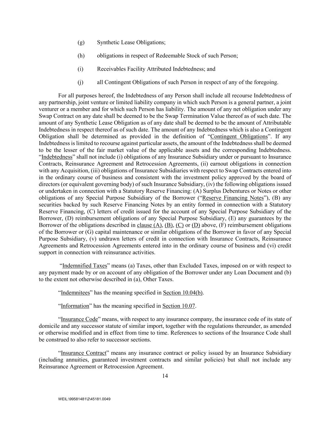 15 WEIL:\99581369\2\44393.0003 Obligation shall be determined as provided in the definition of “Contingent Obligations”. If any Indebtedness is limited to recourse against particular assets, the amount of the Indebtedness shall be deemed to be the lesser of the fair market value of the applicable assets and the corresponding Indebtedness. “Indebtedness” shall not include (i) obligations of any Insurance Subsidiary under or pursuant to Insurance Contracts, Reinsurance Agreement and Retrocession Agreements, (ii) earn-out obligations in connection with any Permitted Acquisition, (iii) obligations of Insurance Subsidiaries with respect to Swap Contracts entered into in the ordinary course of business and consistent with the investment policy approved by the board of directors (or equivalent governing body) of such Insurance Subsidiary, (iv) the following obligations issued or undertaken in connection with a Statutory Reserve Financing: (A) Surplus Debentures or Notes or other obligations of any Special Purpose Subsidiary of the Borrower (“Reserve Financing Notes”), (B) any securities backed by such Reserve Financing Notes by an entity formed in connection with a Statutory Reserve Financing, (C) letters of credit issued for the account of any Special Purpose Subsidiary of the Borrower, (D) reimbursement obligations of any Special Purpose Subsidiary, (E) any guarantees by a Borrower or Guarantor of the obligations described in clause (A), (B), (C) or (D) above, (F) reimbursement obligations of a Borrower or Guarantor or (G) capital maintenance or similar obligations of a Borrower or Guarantor in favor of any Special Purpose Subsidiary, (v) undrawn letters of credit in connection with Insurance Contracts, Reinsurance Agreements and Retrocession Agreements entered into in the ordinary course of business and (vi) credit support in connection with reinsurance activities. “Indemnified Taxes” means (a) Taxes, other than Excluded Taxes, imposed on or with respect to any payment made by or on account of any obligation of the Borrower under any Loan Document and (b) to the extent not otherwise described in (a), Other Taxes. “Indemnitees” has the meaning specified in Section 10.04(b). “Information” has the meaning specified in Section 10.07. “Insurance Code” means, with respect to any insurance company, the insurance code of its state of domicile and any successor statute of similar import, together with the regulations thereunder, as amended or otherwise modified and in effect from time to time. References to sections of the Insurance Code shall be construed to also refer to successor sections. “Insurance Contract” means any insurance contract or policy issued by an Insurance Subsidiary (including annuities, guaranteed investment contracts and similar policies) but shall not include any Reinsurance Agreement or Retrocession Agreement. “Insurance Investments” means investments by an Insurance Subsidiary or any Subsidiary of an Insurance Subsidiary for its investment portfolio in the ordinary course of business (other than any of its Investments in Subsidiaries engaged in insurance lines of business) consistent with the policies and procedures approved by the board of directors or the investment committee (or other applicable committee) of such Insurance Subsidiary or any Subsidiary of an Insurance Subsidiary or otherwise consistent with Investment guidelines specifically approved by the applicable Department for such Insurance Subsidiary. “Insurance Subsidiary” means each Subsidiary of the Borrower identified as an Insurance Subsidiary (including Subsidiaries of such Subsidiary) on Schedule 5.14 and each other Subsidiary (including Subsidiaries of such Subsidiary) from time to time in the insurance business as certified by the Borrower in writing to the Administrative Agent.