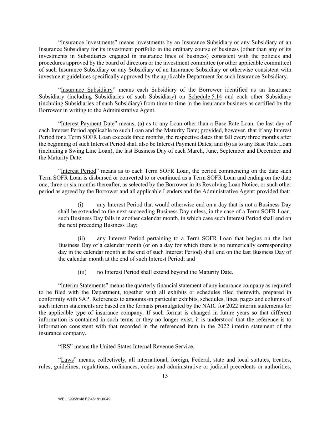 16 WEIL:\99581369\2\44393.0003 “Interest Payment Date” means, (a) as to any Loan other than a Base Rate Loan, the last day of each Interest Period applicable to such Loan and the Maturity Date; provided, however, that if any Interest Period for a Term SOFR Loan exceeds three months, the respective dates that fall every three months after the beginning of such Interest Period shall also be Interest Payment Dates; and (b) as to any Base Rate Loan (including a Swing Line Loan), the last Business Day of each March, June, September and December and the Maturity Date. “Interest Period” means as to each Term SOFR Loan, the period commencing on the date such Term SOFR Loan is disbursed or converted to or continued as a Term SOFR Loan and ending on the date one, three or six months thereafter, as selected by the Borrower in its Revolving Loan Notice, or such other period as agreed by the Borrower and all applicable Lenders and the Administrative Agent; provided that: (i) any Interest Period that would otherwise end on a day that is not a Business Day shall be extended to the next succeeding Business Day unless, in the case of a Term SOFR Loan, such Business Day falls in another calendar month, in which case such Interest Period shall end on the next preceding Business Day; (ii) any Interest Period pertaining to a Term SOFR Loan that begins on the last Business Day of a calendar month (or on a day for which there is no numerically corresponding day in the calendar month at the end of such Interest Period) shall end on the last Business Day of the calendar month at the end of such Interest Period; and (iii) no Interest Period shall extend beyond the Maturity Date. “Interim Statements” means the quarterly financial statement of any insurance company as required to be filed with the Department, together with all exhibits or schedules filed therewith, prepared in conformity with SAP. References to amounts on particular exhibits, schedules, lines, pages and columns of such interim statements are based on the formats promulgated by the NAIC for 2022 interim statements for the applicable type of insurance company. If such format is changed in future years so that different information is contained in such terms or they no longer exist, it is understood that the reference is to information consistent with that recorded in the referenced item in the 2022 interim statement of the insurance company. “Investment” means, as to any Person, (a) the purchase or other acquisition of Equity Interests or other securities of another Person, (b) a loan, advance or capital contribution to, guarantee or assumption of Indebtedness of, or purchase or other acquisition of any other Indebtedness or equity participation or interest in, another Person, including any partnership or joint venture interest in such other Person and any arrangement pursuant to which the investor guarantees Indebtedness of such other Person or (c) the purchase or other acquisition (in one transaction or a series of transactions) of (i) assets of another Person that constitute a business unit or line business or (ii) all or substantially all of the assets of another Person. For purposes of covenant compliance, the amount of any Investment shall be the amount actually invested, without adjustment for subsequent increases or decreases in the value of such Investment. “IRS” means the United States Internal Revenue Service. “L/C Commitment” means, as to any Committed L/C Issuer, its commitment to issue Letters of Credit, and to amend, increase or extend Letters of Credit previously issued by it, pursuant to Section 2.15, in an aggregate available amount of Letters of Credit issued by such L/C Issuer at any time outstanding not to exceed the amount which shall be set forth in the written agreement by which such Lender shall become