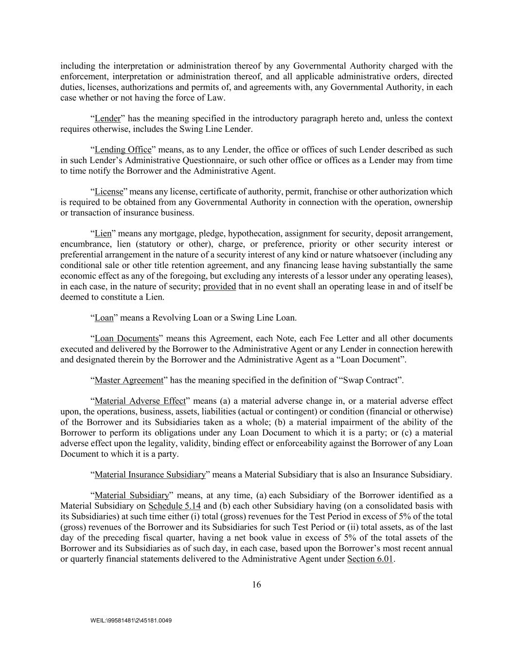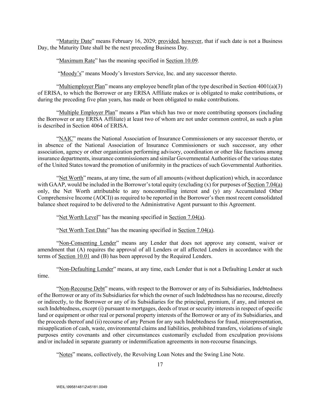 19 WEIL:\99581369\2\44393.0003 Borrower and its Subsidiaries as of such day, in each case, based upon the Borrower’s most recent annual or quarterly financial statements delivered to the Administrative Agent under Section 6.01. “Maturity Date” means the earlier to occur of (x) November 22, 2027 and (y) the Springing Maturity Date; provided, however, that if either such date is not a Business Day, the Maturity Date shall be the next preceding Business Day. “Maximum Rate” has the meaning specified in Section 10.09. “Moody’s” means Moody’s Investors Service, Inc. and any successor thereto. “Multiemployer Plan” means any employee benefit plan of the type described in Section 4001(a)(3) of ERISA, to which the Borrower or any ERISA Affiliate makes or is obligated to make contributions, or during the preceding five plan years, has made or been obligated to make contributions. “Multiple Employer Plan” means a Plan which has two or more contributing sponsors (including the Borrower or any ERISA Affiliate) at least two of whom are not under common control, as such a plan is described in Section 4064 of ERISA. “NAIC” means the National Association of Insurance Commissioners or any successor thereto, or in absence of the National Association of Insurance Commissioners or such successor, any other association, agency or other organization performing advisory, coordination or other like functions among insurance departments, insurance commissioners and similar Governmental Authorities of the various states of the United States toward the promotion of uniformity in the practices of such Governmental Authorities. “Net Income” means, for any period, (a) for the Borrower’s Subsidiaries which are non-Insurance Subsidiaries, the net income of such non-Insurance Subsidiaries from continuing operations before extraordinary items (excluding from the calculation of net income gains and losses from dispositions of assets) for that period and (b) for purposes of Section 7.09(a), the net income of the Borrower and its Subsidiaries from continuing operations before extraordinary items (excluding from the calculation of net income (x) gains and losses from dispositions of assets and (y) any net income attributable to any noncontrolling interest) for that period. “Net Worth” means, at any time, the sum of all amounts (without duplication) which, in accordance with GAAP, would be included in the Borrower’s total equity (excluding (x) for purposes of Section 7.09(a) only, the Net Worth attributable to any noncontrolling interest and (y) any Accumulated Other Comprehensive Income (AOCI)) as required to be reported in the Borrower’s then most recent consolidated balance sheet required to be delivered to the Administrative Agent pursuant to this Agreement. “Net Worth Test Date” has the meaning specified in Section 7.09(a). “Non-Consenting Lender” means any Lender (i) that does not approve any consent, waiver or amendment that (A) requires the approval of all Lenders or all affected Lenders in accordance with the terms of Section 10.01 and (B) has been approved by the Required Lenders or (ii) that prohibits an Acquisition by the Borrower or a Subsidiary by the exercise of clause (c) of the definition of “Permitted Acquisition”, which Acquisition would otherwise be a Permitted Acquisition. “Non-Defaulting Lender” means, at any time, each Lender that is not a Defaulting Lender at such time.