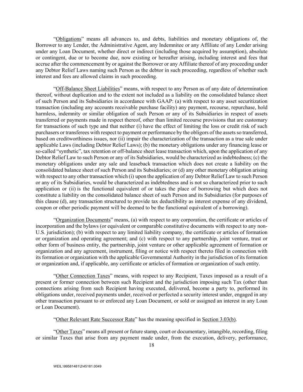 20 WEIL:\99581369\2\44393.0003 “Non-Renewal Notice Date” has the meaning specified in Section 2.15(b)(iii). “Notes” means, collectively, the Revolving Loan Notes and the Swing Line Note. “Obligations” means all advances to, and debts, liabilities and monetary obligations of, the Borrower or any other Loan Party to any Lender, any L/C Issuer, the Administrative Agent, any Indemnitee or any Affiliate of any Lender or L/C Issuer arising under any Loan Document, whether direct or indirect (including those acquired by assumption), absolute or contingent, due or to become due, now existing or hereafter arising, including interest and fees that accrue after the commencement by or against the Borrower or any Affiliate thereof of any proceeding under any Debtor Relief Laws naming such Person as the debtor in such proceeding, regardless of whether such interest and fees are allowed claims in such proceeding. “Off-Balance Sheet Liabilities” means, with respect to any Person as of any date of determination thereof, without duplication and to the extent not included as a liability on the consolidated balance sheet of such Person and its Subsidiaries in accordance with GAAP: (a) with respect to any asset securitization transaction (including any accounts receivable purchase facility) any payment, recourse, repurchase, hold harmless, indemnity or similar obligation of such Person or any of its Subsidiaries in respect of assets transferred or payments made in respect thereof, other than limited recourse provisions that are customary for transactions of such type and that neither (i) have the effect of limiting the loss or credit risk of such purchasers or transferees with respect to payment or performance by the obligors of the assets so transferred, based on creditworthiness issues, nor (ii) impair the characterization of the transaction as a true sale under applicable Laws (including Debtor Relief Laws); (b) the monetary obligations under any financing lease or so-called “synthetic”, tax retention or off-balance sheet lease transaction which, upon the application of any Debtor Relief Law to such Person or any of its Subsidiaries, would be characterized as indebtedness; (c) the monetary obligations under any sale and leaseback transaction which does not create a liability on the consolidated balance sheet of such Person and its Subsidiaries; or (d) any other monetary obligation arising with respect to any other transaction which (i) upon the application of any Debtor Relief Law to such Person or any of its Subsidiaries, would be characterized as indebtedness and is not so characterized prior to such application or (ii) is the functional equivalent of or takes the place of borrowing but which does not constitute a liability on the consolidated balance sheet of such Person and its Subsidiaries (for purposes of this clause (d), any transaction structured to provide tax deductibility as interest expense of any dividend, coupon or other periodic payment will be deemed to be the functional equivalent of a borrowing). “Organization Documents” means, (a) with respect to any corporation, the certificate or articles of incorporation and the bylaws (or equivalent or comparable constitutive documents with respect to any non- U.S. jurisdiction); (b) with respect to any limited liability company, the certificate or articles of formation or organization and operating agreement; and (c) with respect to any partnership, joint venture, trust or other form of business entity, the partnership, joint venture or other applicable agreement of formation or organization and any agreement, instrument, filing or notice with respect thereto filed in connection with its formation or organization with the applicable Governmental Authority in the jurisdiction of its formation or organization and, if applicable, any certificate or articles of formation or organization of such entity. “Other Connection Taxes” means, with respect to any Recipient, Taxes imposed as a result of a present or former connection between such Recipient and the jurisdiction imposing such Tax (other than connections arising from such Recipient having executed, delivered, become a party to, performed its obligations under, received payments under, received or perfected a security interest under, engaged in any other transaction pursuant to or enforced any Loan Document, or sold or assigned an interest in any Loan, Letter of Credit or Loan Document).