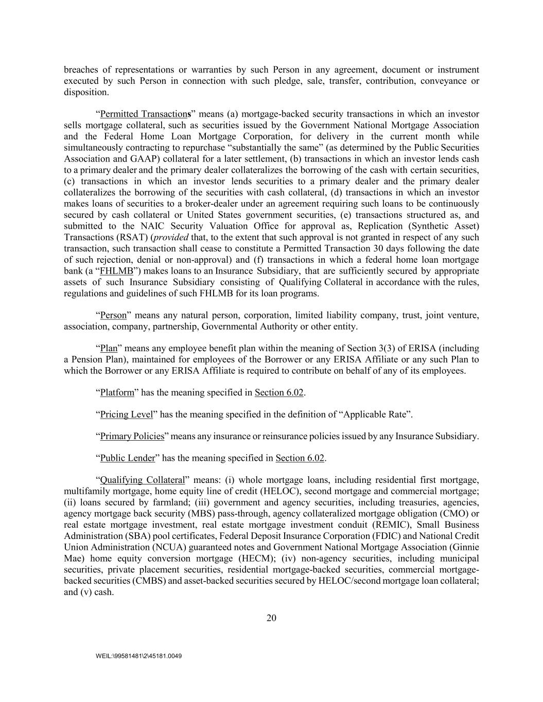 23 WEIL:\99581369\2\44393.0003 Transactions (RSAT) (provided that, to the extent that such approval is not granted in respect of any such transaction, such transaction shall cease to constitute a Permitted Transaction 30 days following the date of such rejection, denial or non-approval) and (f) transactions in which a federal home loan mortgage bank (a “FHLMB”) makes loans to an Insurance Subsidiary, that are sufficiently secured by appropriate assets of such Insurance Subsidiary consisting of Qualifying Collateral in accordance with the rules, regulations and guidelines of such FHLMB for its loan programs. “Person” means any natural person, corporation, limited liability company, trust, joint venture, association, company, partnership, Governmental Authority or other entity. “Plan” means any employee benefit plan within the meaning of Section 3(3) of ERISA (including a Pension Plan), maintained for employees of the Borrower or any ERISA Affiliate or any such Plan to which the Borrower or any ERISA Affiliate is required to contribute on behalf of any of its employees. “Platform” has the meaning specified in Section 6.02. “Pricing Level” has the meaning specified in the definition of “Debt Rating”. “Primary Policies” means any insurance or reinsurance policies issued by a Loan Party or any Insurance Subsidiary. “Public Lender” has the meaning specified in Section 6.02. “Qualifying Collateral” means: (i) whole mortgage loans, including residential first mortgage, multifamily mortgage, home equity line of credit (HELOC), second mortgage and commercial mortgage; (ii) loans secured by farmland; (iii) government and agency securities, including treasuries, agencies, agency mortgage back security (MBS) pass-through, agency collateralized mortgage obligation (CMO) or real estate mortgage investment, real estate mortgage investment conduit (REMIC), Small Business Administration (SBA) pool certificates, Federal Deposit Insurance Corporation (FDIC) and National Credit Union Administration (NCUA) guaranteed notes and Government National Mortgage Association (Ginnie Mae) home equity conversion mortgage (HECM); (iv) non-agency securities, including municipal securities, private placement securities, residential mortgage-backed securities, commercial mortgage- backed securities (CMBS) and asset-backed securities secured by HELOC/second mortgage loan collateral; and (v) cash. “Rating Agency” means S&P, Moody’s or Fitch, collectively, the “Rating Agencies”. “RBC Ratio” means on any date of determination, one-half of the ratio (expressed as a percentage) of (a) the aggregate “Total Adjusted Capital” (as defined by the applicable Department) for FGLIC to (b) the aggregate “Authorized Control Level Risked-Based Capital” (as defined by the applicable Department) for FGLIC. “RBC Ratio Test Condition” has the meaning specified in Section 7.09(c). “Receivables” has the meaning specified in the definition of “Permitted Accounts Securitization”. “Receivables Facility Attributed Indebtedness” means the amount of recourse obligations outstanding under a receivables purchase facility on any date of determination.