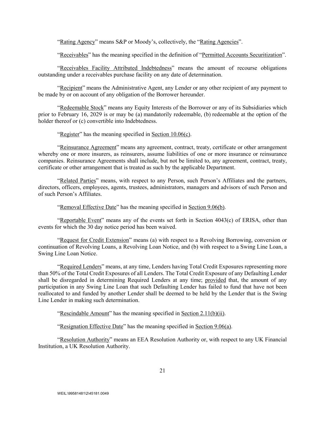 24 WEIL:\99581369\2\44393.0003 “Recipient” means the Administrative Agent, any Lender, any L/C Issuer, the Swing Line Lender or any other recipient of any payment to be made by or on account of any obligation of the Borrower hereunder. “Redeemable Stock” means any Equity Interests of the Borrower or any of its Subsidiaries which prior to November 22, 2027 is or may be (a) mandatorily redeemable, (b) redeemable at the option of the holder thereof or (c) convertible into Indebtedness. “Register” has the meaning specified in Section 10.06(c). “Reinsurance Agreement” means any agreement, contract, treaty, certificate or other arrangement by which any Insurance Subsidiary agrees to transfer or cede to another insurer, or has transferred or ceded to it by another insurer, all or part of the liability assumed or assets held under one or more Insurance Contract (including any insurance, annuity, reinsurance or retrocession policy, agreement, contract, treaty, certificate or similar arrangement). Reinsurance Agreements shall include, but not be limited to, any agreement, contract, treaty, certificate or other arrangement that is treated as such by the applicable Department. “Related Parties” means, with respect to any Person, such Person’s Affiliates and the partners, directors, officers, employees, agents, trustees, administrators, managers and advisors of such Person and of such Person’s Affiliates. “Removal Effective Date” has the meaning specified in Section 9.06(b). “Reportable Event” means any of the events set forth in Section 4043(c) of ERISA, other than events for which the 30 day notice period has been waived. “Request for Credit Extension” means (a) with respect to a Revolving Borrowing, conversion or continuation of Revolving Loans, a Revolving Loan Notice, (b) with respect to a Swing Line Loan, a Swing Line Loan Notice and (c) with respect to an L/C Credit Extension, a Letter of Credit Application. “Required Lenders” means, at any time, Lenders having Total Credit Exposures representing more than 50% of the Total Credit Exposures of all Lenders. The Total Credit Exposure of any Defaulting Lender shall be disregarded in determining Required Lenders at any time; provided that, the amount of any participation in any Swing Line Loan that such Defaulting Lender has failed to fund that have not been reallocated to and funded by another Lender shall be deemed to be held by the Lender that is the Swing Line Lender in making such determination. “Rescindable Amount” has the meaning specified in Section 2.11(b)(i). “Resignation Effective Date” has the meaning specified in Section 9.06(a). “Resolution Authority” means an EEA Resolution Authority or, with respect to any UK Financial Institution, a UK Resolution Authority. “Responsible Officer” means the chief executive officer, president, executive vice presidents, chief financial officer, treasurer, controller, secretary or assistant secretary of the Borrower and, solely for purposes of notices given pursuant to Article II, any other officer or employee of the Borrower so designated by any of the foregoing officers in a notice to the Administrative Agent or any other officer or employee of