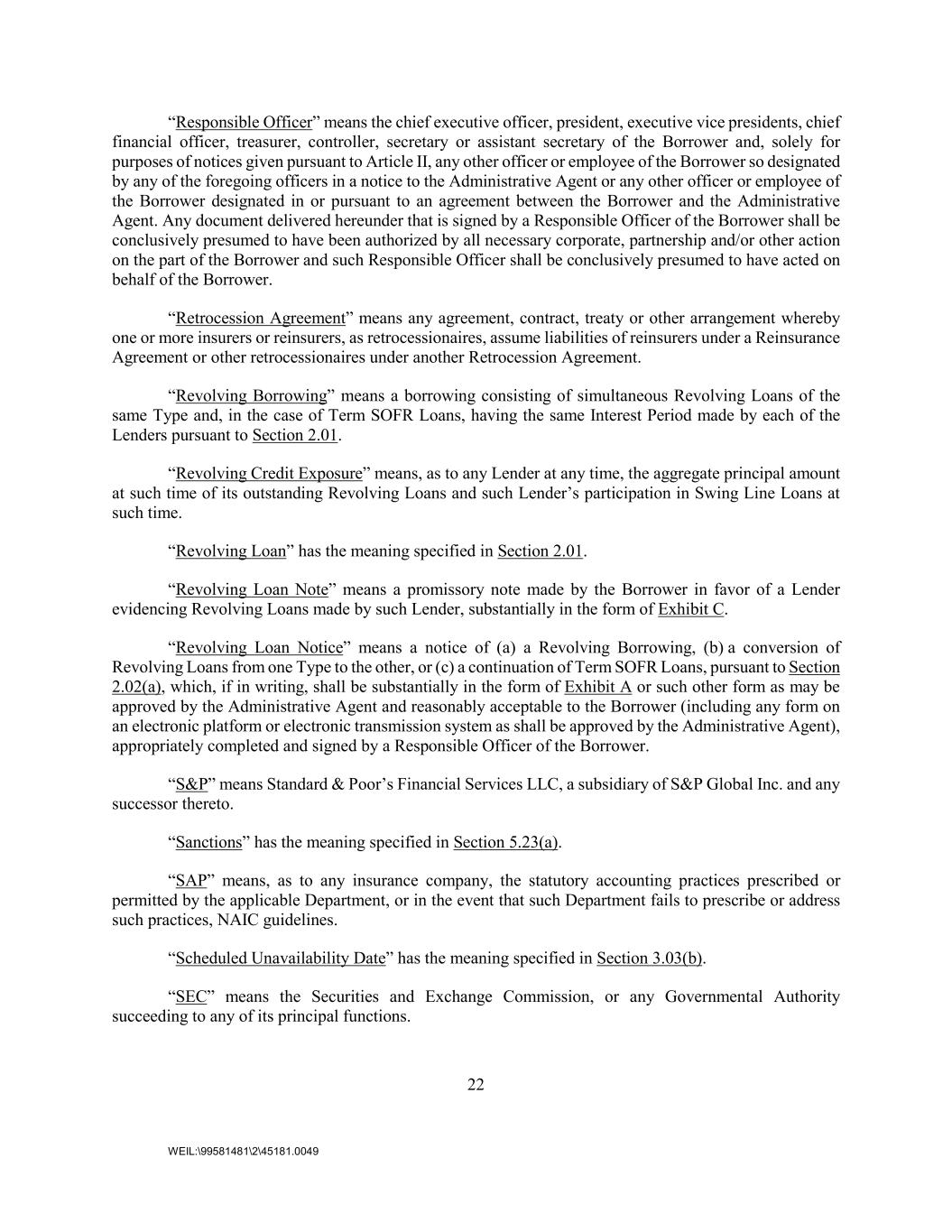 25 WEIL:\99581369\2\44393.0003 the Borrower designated in or pursuant to an agreement between the Borrower and the Administrative Agent. Any document delivered hereunder that is signed by a Responsible Officer of the Borrower shall be conclusively presumed to have been authorized by all necessary corporate, partnership and/or other action on the part of the Borrower and such Responsible Officer shall be conclusively presumed to have acted on behalf of the Borrower. “Restricted Payments” has the meaning specified in Section 7.06. “Retrocession Agreement” means any agreement, contract, treaty or other arrangement whereby one or more insurers or reinsurers, as retrocessionaires, assume liabilities of reinsurers under a Reinsurance Agreement or other retrocessionaires under another Retrocession Agreement. “Revolving Borrowing” means a borrowing consisting of simultaneous Revolving Loans of the same Type and, in the case of Term SOFR Loans, having the same Interest Period made by each of the Lenders pursuant to Section 2.01. “Revolving Credit Exposure” means, as to any Lender at any time, the aggregate principal amount at such time of its outstanding Revolving Loans and such Lender’s participation in Swing Line Loans and Letters of Credit at such time. “Revolving Loan” has the meaning specified in Section 2.01. “Revolving Loan Note” means a promissory note made by the Borrower in favor of a Lender evidencing Revolving Loans made by such Lender, substantially in the form of Exhibit C. “Revolving Loan Notice” means a notice of (a) a Revolving Borrowing, (b) a conversion of Revolving Loans from one Type to the other, or (c) a continuation of Term SOFR Loans, pursuant to Section 2.02(a), which, if in writing, shall be substantially in the form of Exhibit A or such other form as may be approved by the Administrative Agent and reasonably acceptable to the Borrower (including any form on an electronic platform or electronic transmission system as shall be approved by the Administrative Agent), appropriately completed and signed by a Responsible Officer of the Borrower. “S&P” means Standard & Poor’s Financial Services LLC, a subsidiary of S&P Global Inc. and any successor thereto. “Sanctions” has the meaning specified in Section 5.23(a). “SAP” means, as to any insurance company, the statutory accounting practices prescribed or permitted by the applicable Department, or in the event that such Department fails to prescribe or address such practices, NAIC guidelines. “Scheduled Unavailability Date” has the meaning specified in Section 3.03(b). “SEC” means the Securities and Exchange Commission, or any Governmental Authority succeeding to any of its principal functions. “Securitization Vehicle” means one or more special purpose vehicles that are, directly or indirectly, wholly-owned Subsidiaries of the Borrower and are Persons organized for the limited purpose of entering