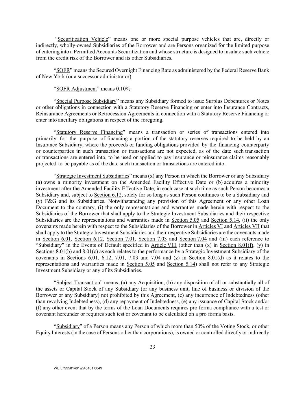 26 WEIL:\99581369\2\44393.0003 into a Permitted Accounts Securitization and whose structure is designed to insulate such vehicle from the credit risk of the Borrower and its other Subsidiaries. “SOFR” means the Secured Overnight Financing Rate as administered by the Federal Reserve Bank of New York (or a successor administrator). “SOFR Adjustment” means 0.10%. “Special Purpose Subsidiary” means any Subsidiary formed to issue Surplus Debentures or Notes or other obligations in connection with a Statutory Reserve Financing or enter into Insurance Contracts, Reinsurance Agreements or Retrocession Agreements in connection with a Statutory Reserve Financing or enter into ancillary obligations in respect of the foregoing. “Springing Maturity Date” means the date that is 91 days prior to the stated maturity date of the FGL Holdings 2025 Senior Notes, unless (w) the principal amount of the FGL Holdings 2025 Senior Notes is $150,000,000 or less at such time, (x) the FGL Holdings 2025 Senior Notes have been redeemed or defeased in full, and any refinancing Indebtedness incurred in connection therewith matures at least 91 days after November 22, 2027 or (y) Fidelity & Guaranty Life Holdings, Inc. or the Borrower shall have deposited in an escrow account held by the Administrative Agent cash in an amount sufficient to reduce the principal amount of the FGL Holdings 2025 Senior Notes to $150,000,000 or less (and shall also have deposited in such account accrued interest and premium (if any) attributable to the principal amount of the FGL Holdings 2025 Senior Notes so reduced), with such escrow arrangement on terms and conditions reasonably acceptable to the Administrative Agent. “Statutory Reserve Financing” means a transaction or series of transactions entered into primarily for the purpose of financing a portion of the statutory reserves required to be held by an Insurance Subsidiary, where the proceeds or funding obligations provided by the financing counterparty or counterparties in such transaction or transactions are not expected, as of the date such transaction or transactions are entered into, to be used or applied to pay insurance or reinsurance claims reasonably projected to be payable as of the date such transaction or transactions are entered into. “Strategic Investment Subsidiaries” means any Person in which the Borrower or any Subsidiary (a) owns a minority Investment on the Effective Date or (b) acquires a minority Investment after the Effective Date, in each case at such time as such Person becomes a Subsidiary and, subject to Section 6.12, solely for so long as such Person continues to be a Subsidiary. Notwithstanding any provision of this Agreement or any other Loan Document to the contrary, (i) the only representations and warranties made herein with respect to the Subsidiaries of the Borrower that shall apply to the Strategic Investment Subsidiaries and their respective Subsidiaries are the representations and warranties made in Section 5.05 and Section 5.14, (ii) the only covenants made herein with respect to the Subsidiaries of the Borrower in Articles VI and Articles VII that shall apply to the Strategic Investment Subsidiaries and their respective Subsidiaries are the covenants made in Section 6.01, Section 6.12, Section 7.01, Section 7.02, Section 7.04, Section 7.05 and Section 7.09 and (iii) each reference to “Subsidiary” in the Events of Default specified in Article VIII (other than (x) in Section 8.01(f), (y) in Sections 8.01(b) and 8.01(c) as each relates to the performance by a Strategic Investment Subsidiary of the covenants in Sections 6.01, 6.12, 7.01, 7.02, 7.04, 7.05 and 7.09 and (z) in Section 8.01(d) as it relates to the representations and warranties made in Section 5.05 and Section 5.14) shall not refer to any Strategic Investment Subsidiary or any of its Subsidiaries. “Subject Transaction” means, (a) any Permitted Acquisition or any other Acquisition, in each case that is permitted by this Agreement, (b) any disposition of all or substantially all of the assets or Capital