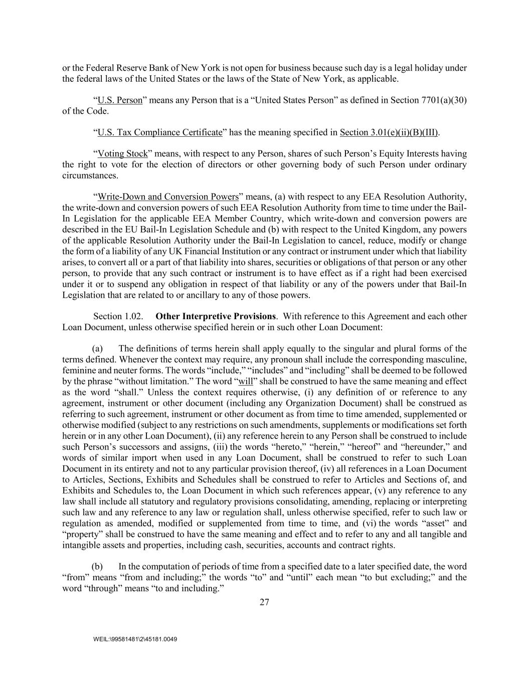 30 WEIL:\99581369\2\44393.0003 “United States” and “U.S.” mean the United States of America. “U.S. Government Securities Business Day” means any Business Day, except any Business Day on which any of the Securities Industry and Financial Markets Association, the New York Stock Exchange or the Federal Reserve Bank of New York is not open for business because such day is a legal holiday under the federal laws of the United States or the laws of the State of New York, as applicable. “U.S. Person” means any Person that is a “United States Person” as defined in Section 7701(a)(30) of the Code. “U.S. Tax Compliance Certificate” has the meaning specified in Section 3.01(e)(ii)(B)(III). “Voting Stock” means, with respect to any Person, shares of such Person’s Equity Interests having the right to vote for the election of directors or other governing body of such Person under ordinary circumstances. “Wholly-Owned Subsidiary” means any Person in which (other than directors’ qualifying Equity Interests required by Law) 100% of the Voting Stock and 100% of the Equity Interests of every other class, in each case, at the time as of which any determination is being made, is owned, beneficially and of record, by the Borrower, or by one or more of the other Wholly-Owned Subsidiaries, or both. “Write-Down and Conversion Powers” means, (a) with respect to any EEA Resolution Authority, the write-down and conversion powers of such EEA Resolution Authority from time to time under the Bail- In Legislation for the applicable EEA Member Country, which write-down and conversion powers are described in the EU Bail-In Legislation Schedule and (b) with respect to the United Kingdom, any powers of the applicable Resolution Authority under the Bail-In Legislation to cancel, reduce, modify or change the form of a liability of any UK Financial Institution or any contract or instrument under which that liability arises, to convert all or a part of that liability into shares, securities or obligations of that person or any other person, to provide that any such contract or instrument is to have effect as if a right had been exercised under it or to suspend any obligation in respect of that liability or any of the powers under that Bail-In Legislation that are related to or ancillary to any of those powers. Section 1.02. Other Interpretive Provisions. With reference to this Agreement and each other Loan Document, unless otherwise specified herein or in such other Loan Document: (a) The definitions of terms herein shall apply equally to the singular and plural forms of the terms defined. Whenever the context may require, any pronoun shall include the corresponding masculine, feminine and neuter forms. The words “include,” “includes” and “including” shall be deemed to be followed by the phrase “without limitation.” The word “will” shall be construed to have the same meaning and effect as the word “shall.” Unless the context requires otherwise, (i) any definition of or reference to any agreement, instrument or other document (including any Organization Document) shall be construed as referring to such agreement, instrument or other document as from time to time amended, supplemented or otherwise modified (subject to any restrictions on such amendments, supplements or modifications set forth herein or in any other Loan Document), (ii) any reference herein to any Person shall be construed to include such Person’s successors and assigns, (iii) the words “hereto,” “herein,” “hereof” and “hereunder,” and words of similar import when used in any Loan Document, shall be construed to refer to such Loan Document in its entirety and not to any particular provision thereof, (iv) all references in a Loan Document to Articles, Sections, Exhibits and Schedules shall be construed to refer to Articles and Sections of, and Exhibits and Schedules to, the Loan Document in which such references appear, (v) any reference to any